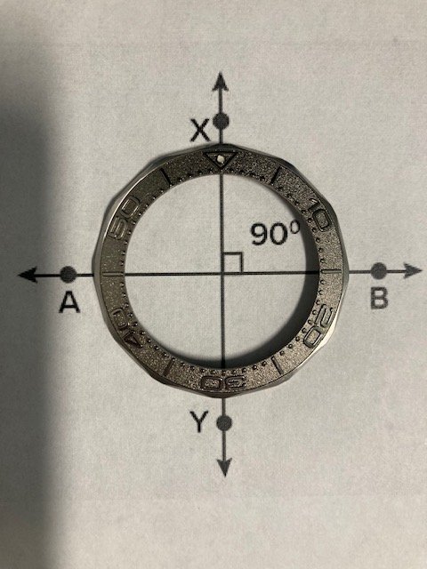 Second, when the 60-minute mark (or zero-mark) on the timing bezel is aligned as closely as possible with the 12 o'clock markers on the dial, the 45-minute marker on the bezel is nearly at the 44-minute mark on the dial. The 5- and 25-minute markers on the bezel line up nicely with their corresponding minute marks on the dial, but others do not. See photo.