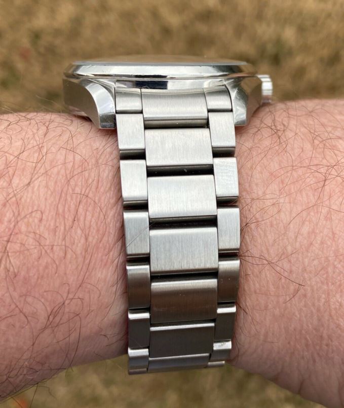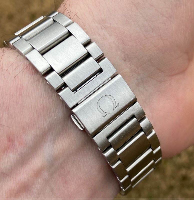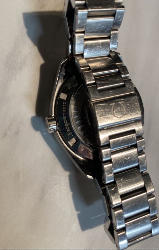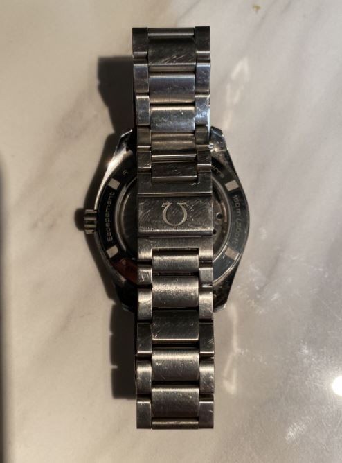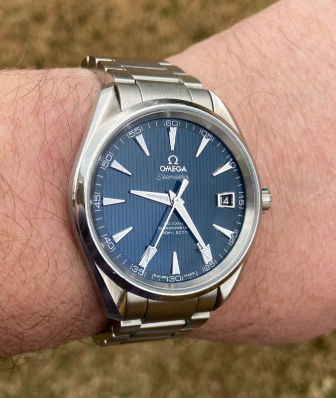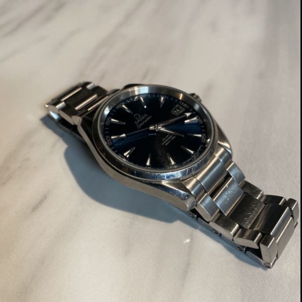 ·I have been looking for an Aqua Terra "Skyfall" in 41.5 for a very long time. I came across one on ebay that was very much abused and looked like it had spent much of it's time on the wrist of a concrete worker. I was high bidder at $2700 usd. My intention was to send it off to Omega for a service, but after receiving it, I realized it doesn't need a service. For the past 4 days it is only -1 second. So, I spent a couple hours re-brushing the bracelet and also polished up the bezel a bit. This one will be a keeper. When it is time for a service, I will ask Omega to replace the bezel since it has some rough spots that Cape Cod couldn't take out.
