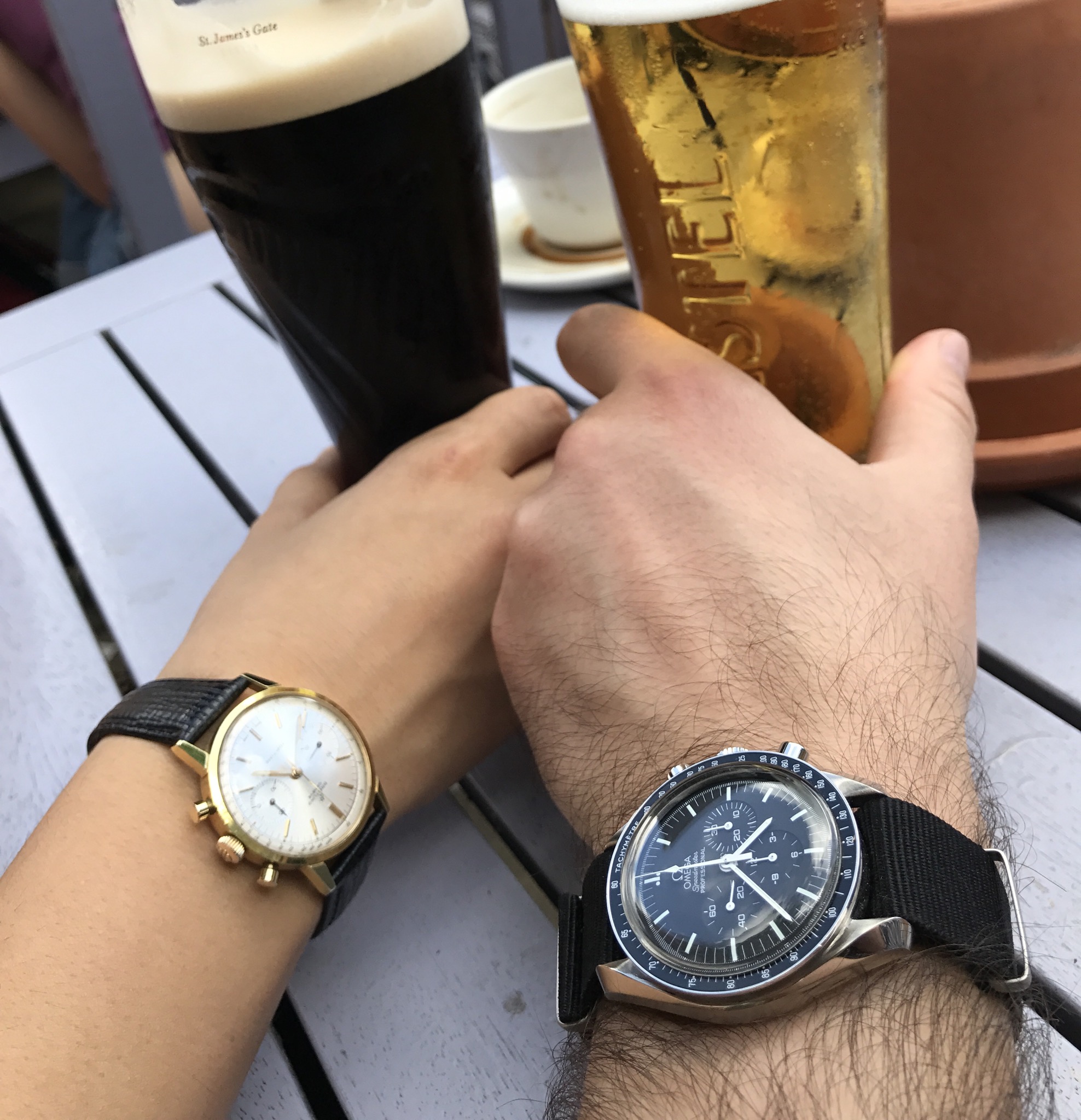 ·Mrs SouthernScot is petite at 5’2” and has always liked small ladies watches (preferably gold). She has two a Bueche Girod and an Omega DeVille. The BG is nearly thirty years old and bought for a special birthday. The DeVille is about fifteen years old and bought to mark obtaining her PhD. She wears the DeVille most days as the BG is a bit dressy for everyday wear, although for many years it was her only watch. She loves them both and is “reasonably “ understanding of my obsession, she has known me since before my 21st birthday when I was given my Speedmaster so always knew I liked I nice watch!
