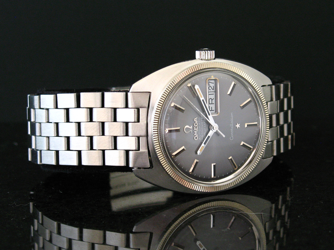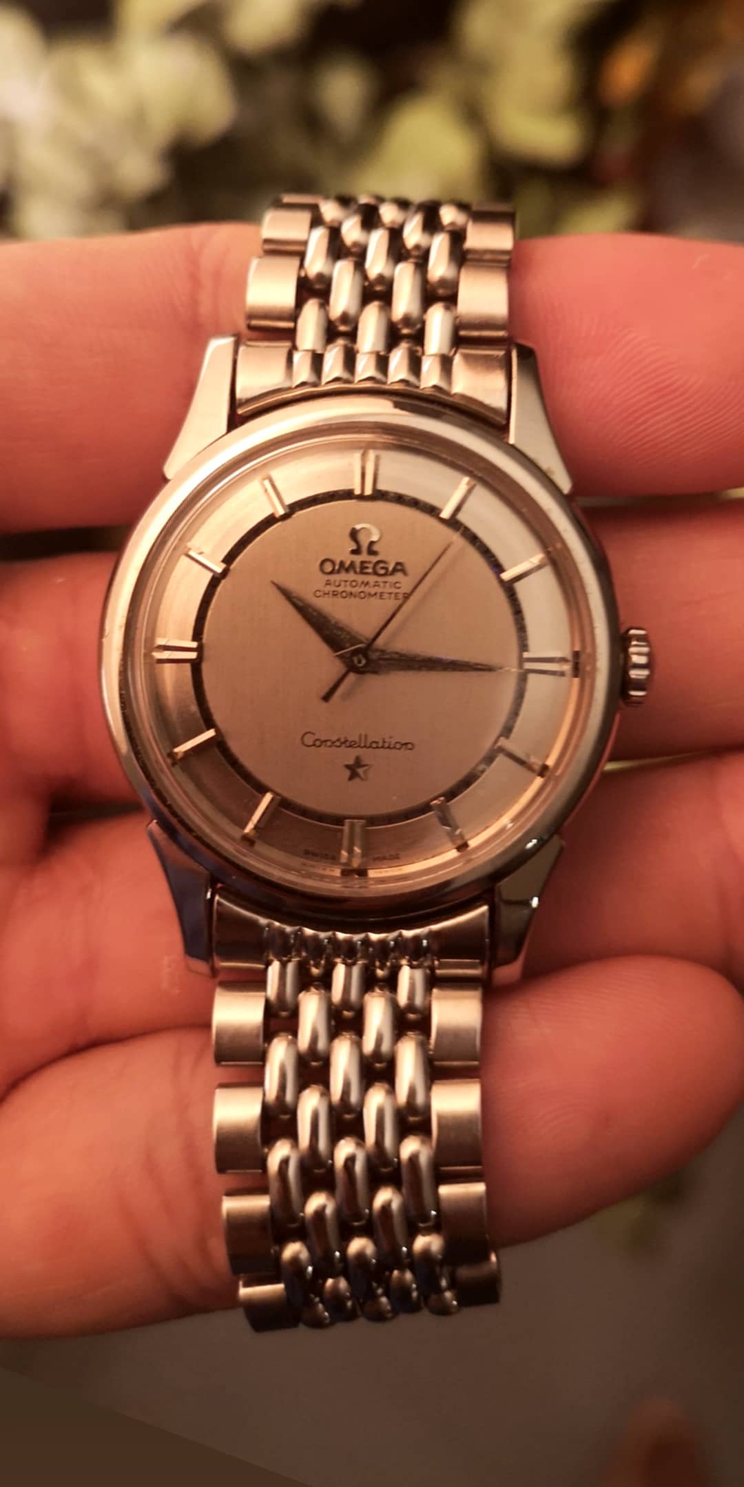 ··Vintage Omega AficionadoSteel C case Constellation, grey dial on a brick bracelet or perhaps a steel LeCoultre bumper with Arabic radium dial.