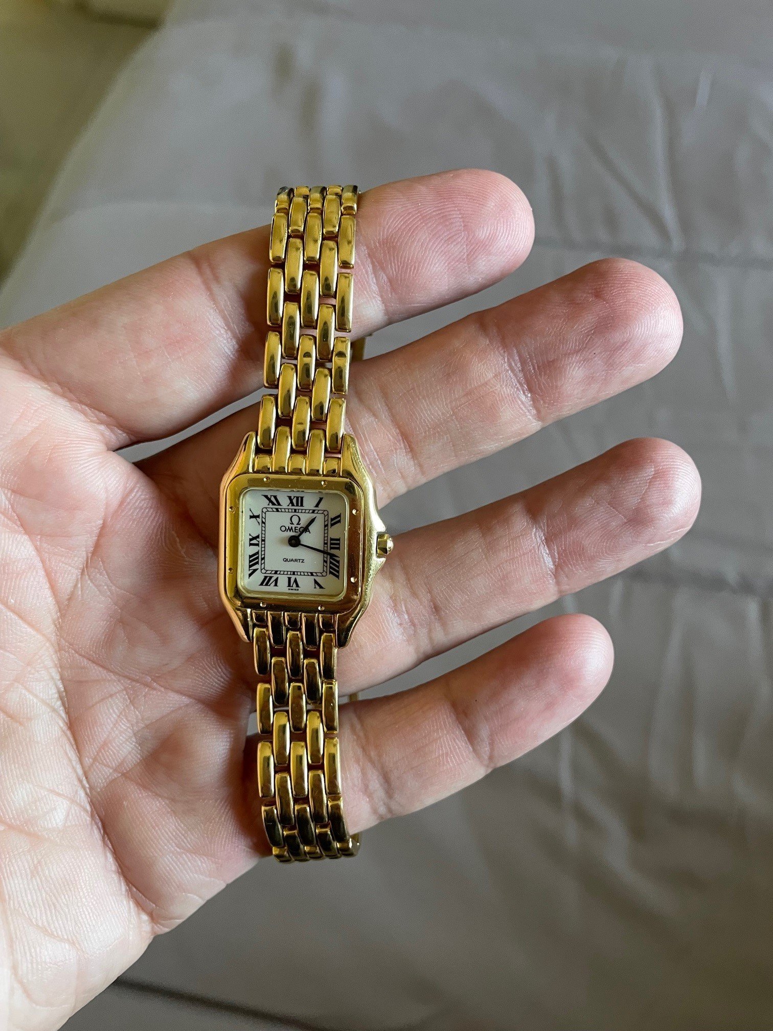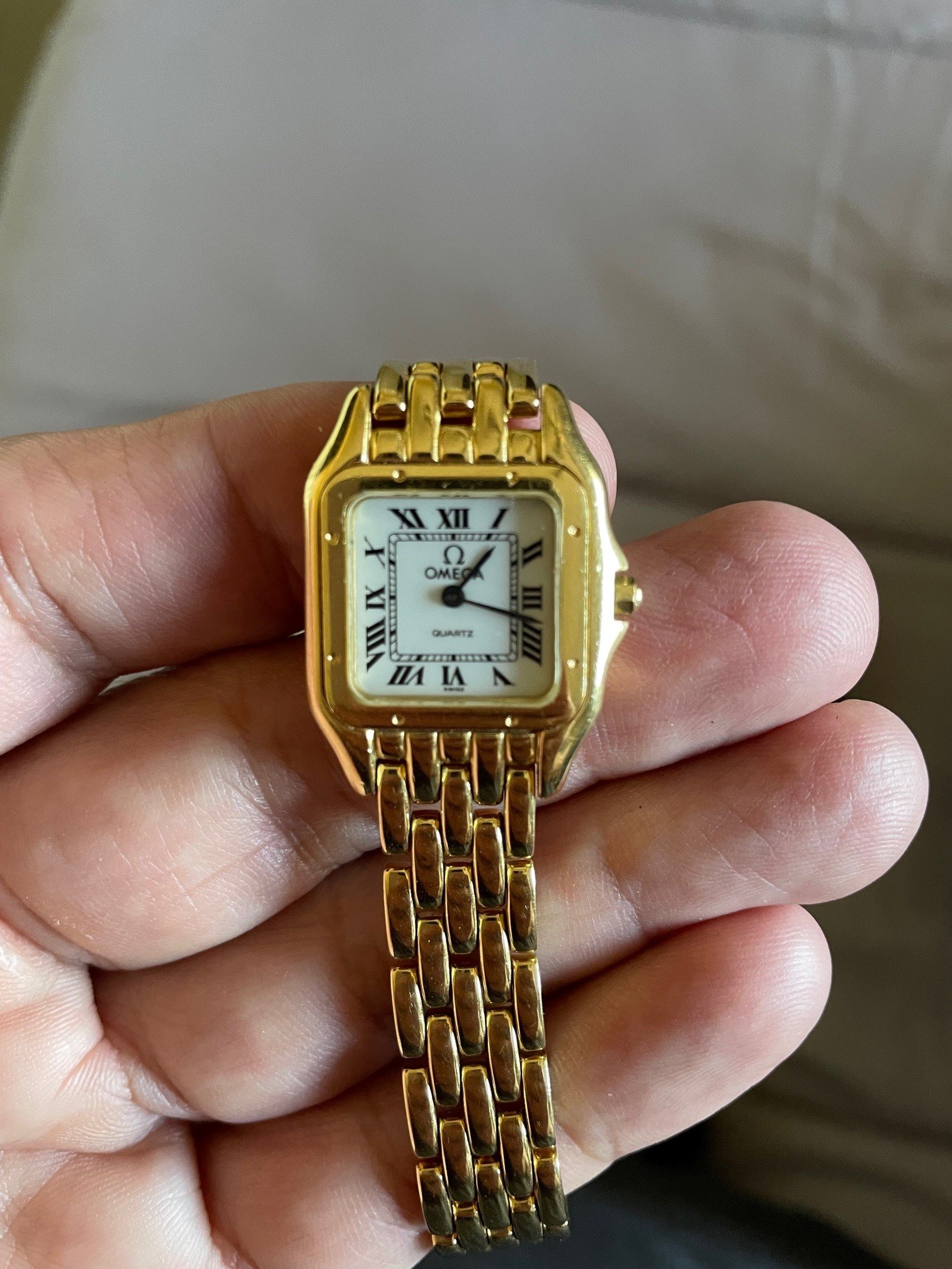 ·I have not been able to find the particular model of this 18K Gold ladies Omega watch. It was my sister's and it was purchased between 1989 and 1991. It looks very much like a Cartier Panthere from that time period but it is in fact an Omega. Can anyone provide me with some information about the watch. I'm including a few images of it. Thanks in advance!