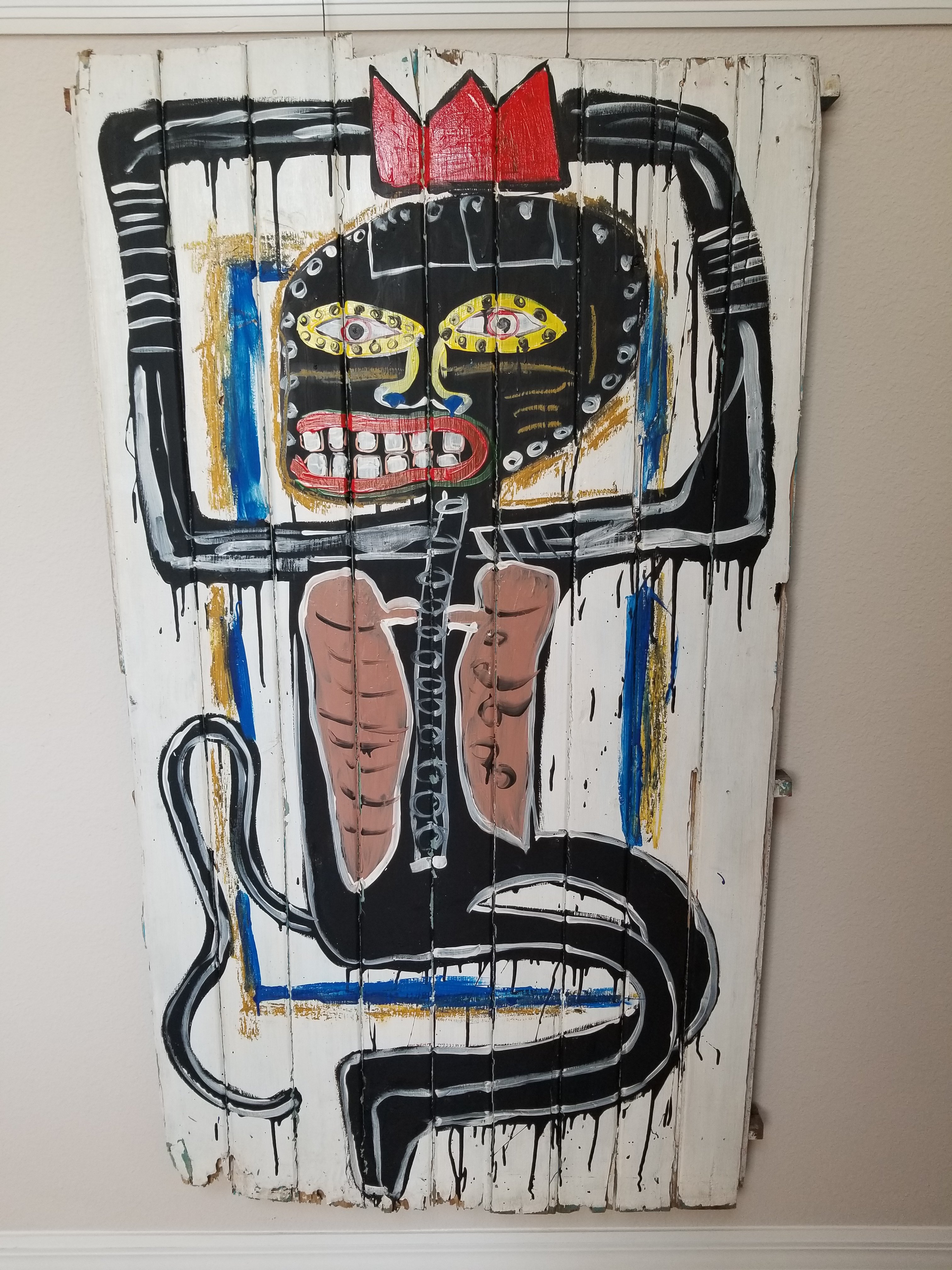Inside were documents with Basquiat Estate letterhead and signed by Basquiat's father certifying each piece with a photograph. Apparently he inherited a large number of his son's pieces, which he had to sell off to pay the massive tax debt from the inheritance(it is truly a sordid tale). He did this for about 15years before he decided enough was enough and stopped. He died a few years later(10 years ago now), and now the estate is run by his two daughters who want nothing to do with the sales/certifications. Sadly, they will not even confirm what their father signed. We've learned the only way to confirm anything Basquiat is through confirmed provenance(verified owner to owner) but it appears from the docs these were actually bought from the Basquiat Estate in the late 90s/early2000s, and like I said the daughters want nothing to do with confirming their fathers documentation. So here we are, the real deal, and we can't prove it. For all 5 we only paid $185. This is the largest piece. Quite dramatic. Made from an old wood pallet.