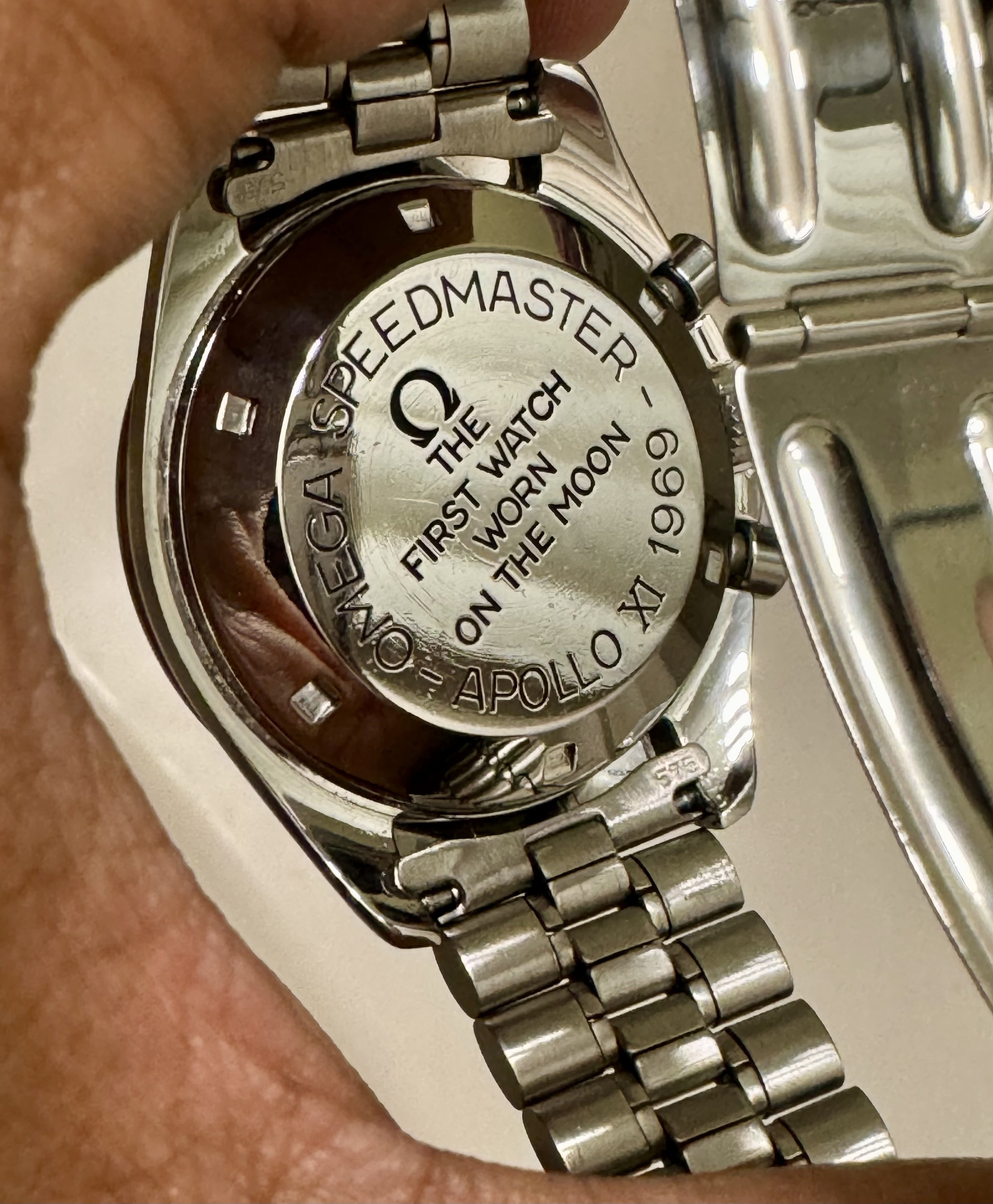 Here's where it gets less clear. I think the steel SW A-XI came next. The World's Fair EXPO 70 took place in Japan on Mar 15, 1970 and the Apollo 12 astronauts visited EXPO 70 on Mar 25th, 1970. The EXPO had a moon rock that was seen by 14 million visitors. This EXPO added to the space and moon craze. It is believed that the Japanese distributor for Omega ordered the SW Apollo XI watches. The 145.022-69 pre-moon casebacks were the normal steel Speedmaster that was then commonly available. It makes sense that after the EXPO 70, the distributor would order special editions using the BA 145.022-69 caseback design. It's thought that the movements used in the SW A-11 watches are between 31.000.xxx and 31.310.xxx, putting them around March 1971 to May 1971. The timeline fits. What's more , there was a printed moon box that came with these SW A-11 watches, which was similar to the crater moon boxes that came with the gold speedmasters.