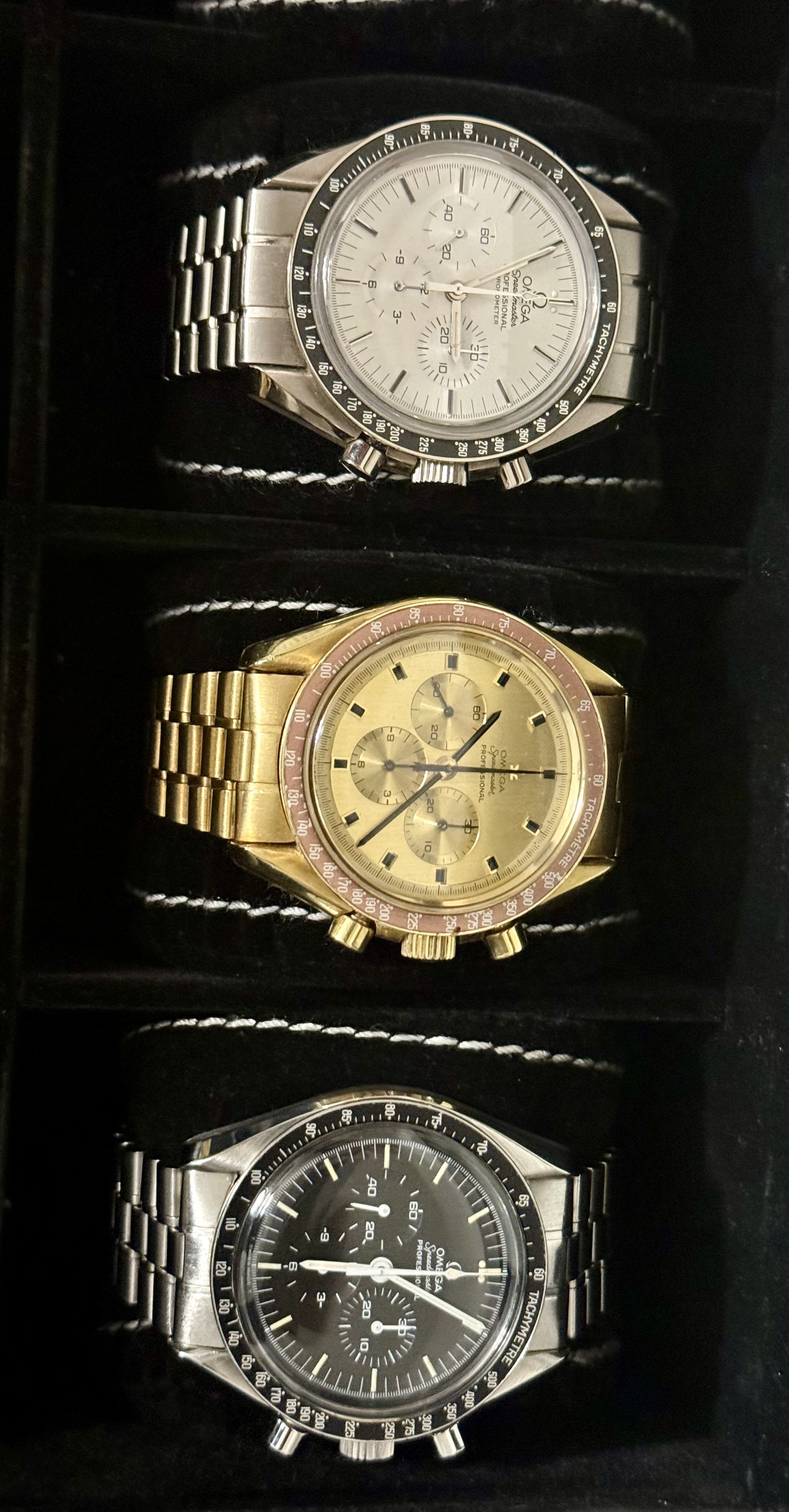 These gold speedmasters were the first time we saw the SW casebacks with the Apollo XI. What's more there were three variants, with the first one a thin font and the other two with fatter fonts. The first variant is an identical match to the same thin font on the steel SW Apollo XI that came later.