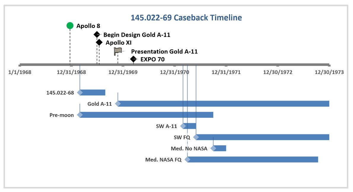 The 145.022-69 pre-moon caseback was sold through about Sept. 1971, based on what people have reported. Looking at the SW FQ (flight qualified) casebacks, it appears they have movement numbers from 31.62xx.xxx to 32.857.xxx, making them first appear around June, 1971. They had a long run, with some reportedly sold as late as Oct. 1974. It makes sense that the Omega designers would be thinking about a longer lasted caseback inscription, as the SW A-11 had the Apollo XI on it. By now, there had been other Apollo missions and they did not want to be limited to only 1969. So they developed the flight qualified by NASA language and started selling these world wide.