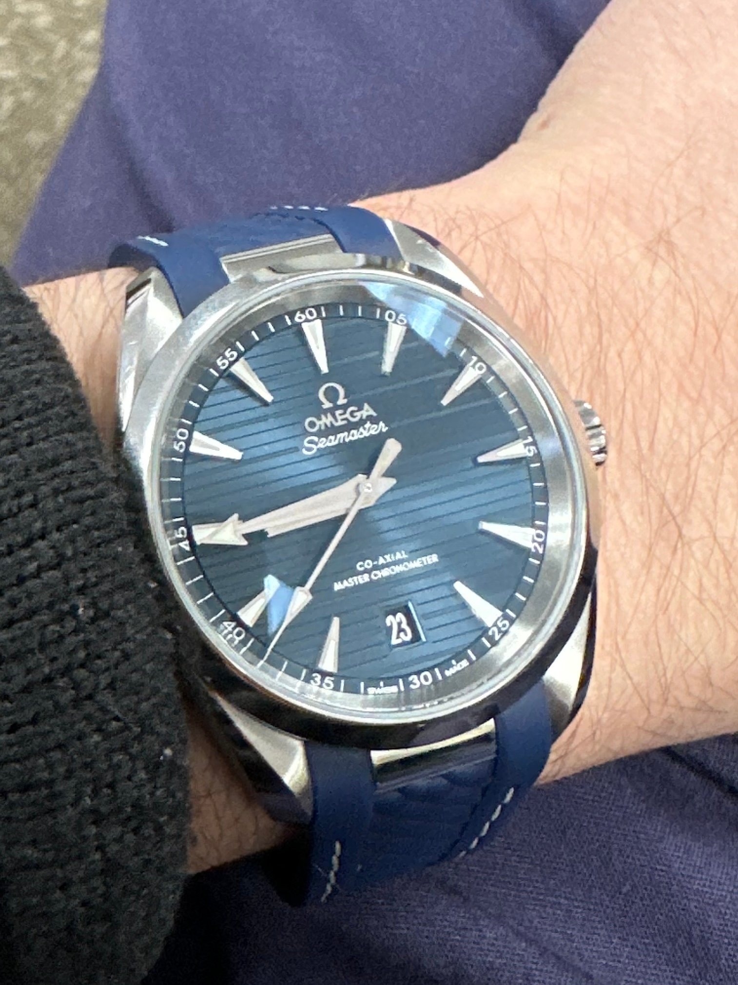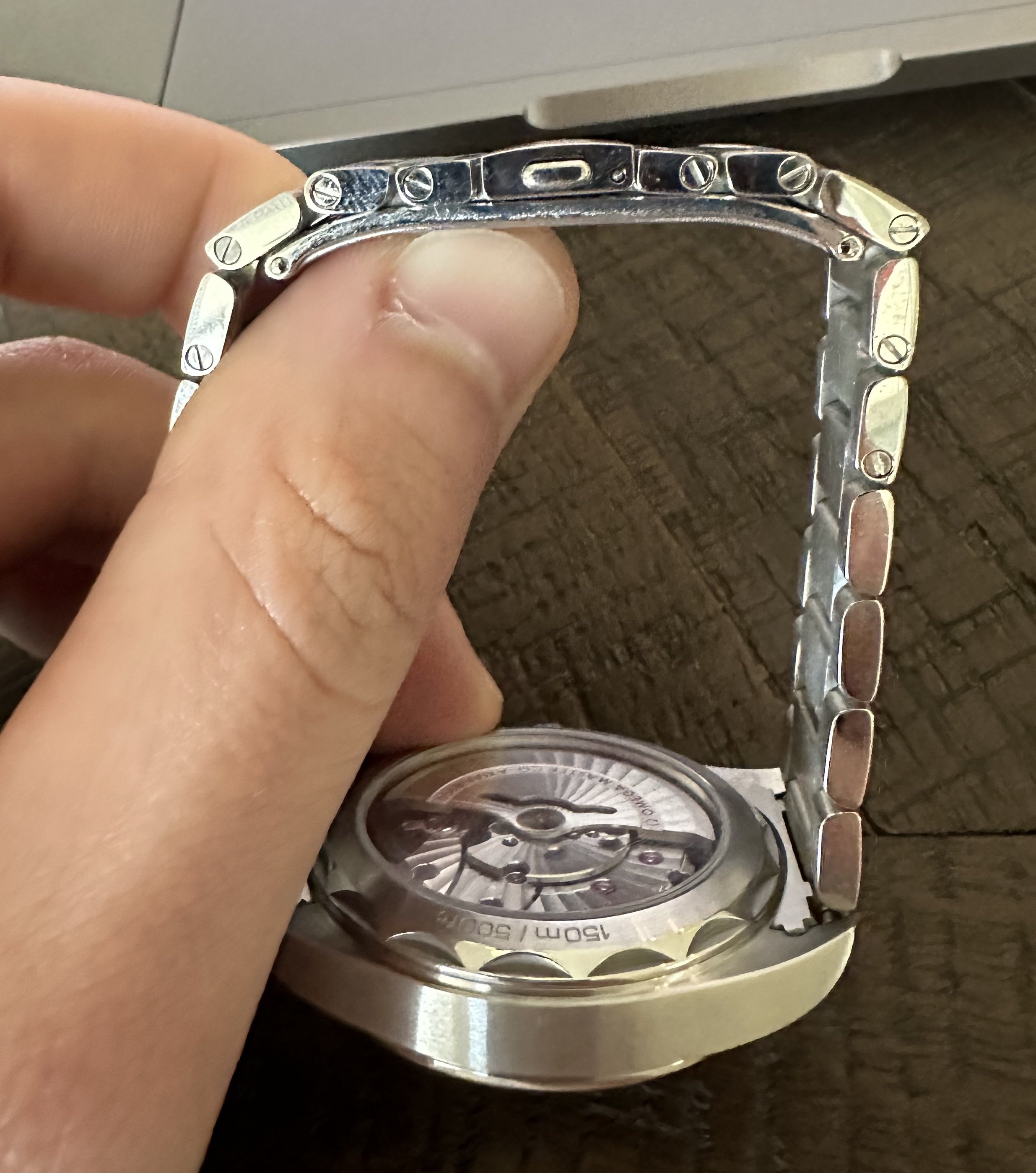 If it's clasp-related (but perhaps it isn't) it fits neatly into my (perhaps petty) grievance-narrative about Omega bracelets. Omega is my favorite watch brand as it has been for years, but their spring-operated bracelet deployant claps--especially the dive ones---have a high failure rate, and I don't understand why they haven't completely rethought them. (As I documented here many months ago, I had two SMP300c clasps fail on me; on my new Aqua Terra the spring-play is already giving me a little worry but it hasn't failed yet.