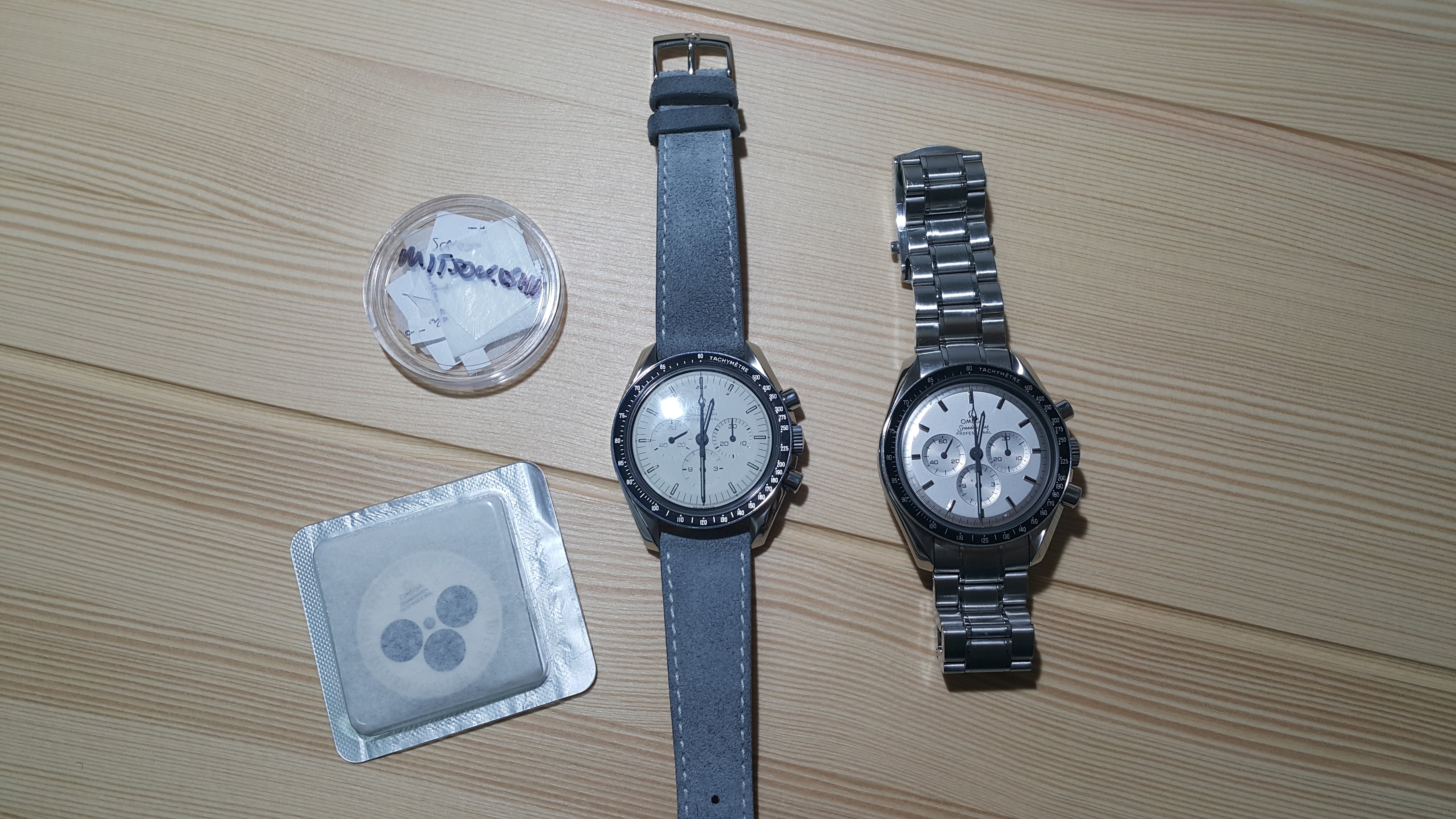 The sweep second is the original black stick fitted to the Apollo 11 10th Anniversary Rhodium Dial white gold model, the sub sec is the Broad Arrow re addition and the main hour/min from 2998 service stock I think.