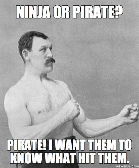 A young boy joins a pirate crew and soon strikes up a conversation with an old salt with an eye patch, a hook for a hand, and a peg leg. He asks the old salt how he lost his leg and the older pirate says "arrr, we once attacked an armed merchantman and she fired on us at close range, a cannon ball took me leg off." Amazed the boy then asks how the old salt lost his hand and the older pirate says "arr, we were once boarded by a British sloop and as we repulsed them one of the bloody bastards took me hand off with his saber." Even more amazed at the old salt's tales the boy finally asked about how he lost his eye and the older pirate says :"arr, a seagull shit on me eye." Shocked, the boy says "and that made you lose your eye?" "Aye" says the old pirate, "it were me first day with the hook."