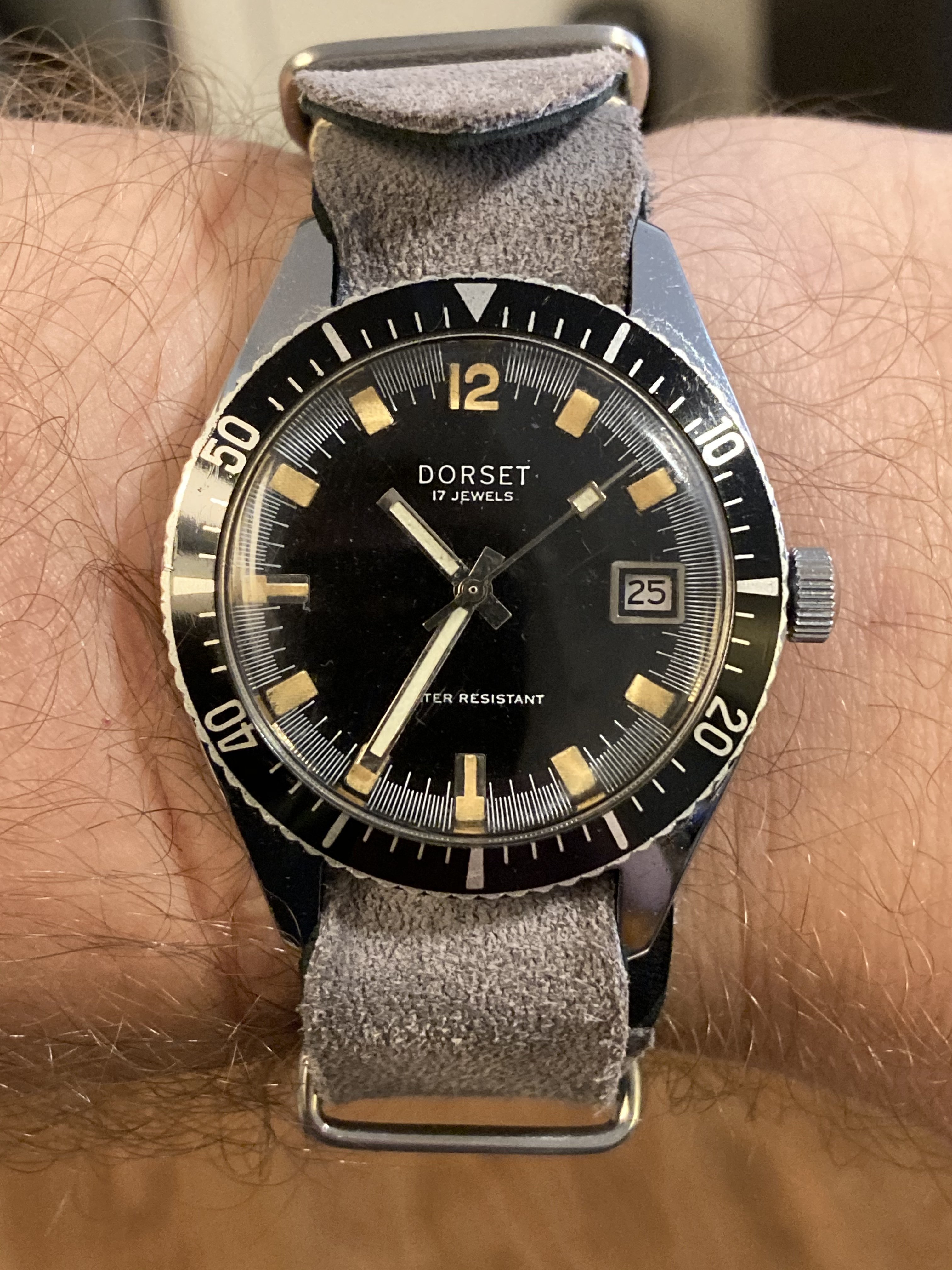 Dorset was the in-house brand for Montgomery Ward catalogs and department stores. This one is 37mm, manual wind movement works perfectly with a solid power reserve and keeps good time. Lug width is 17.5mm or so (just under 18mm)