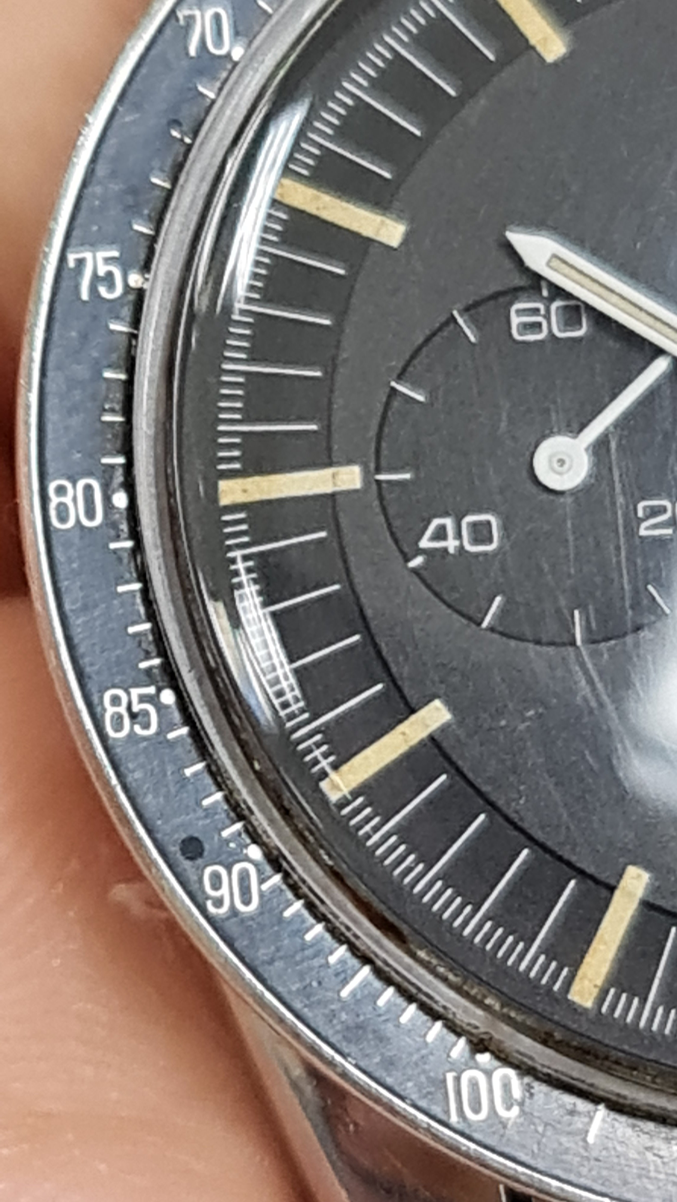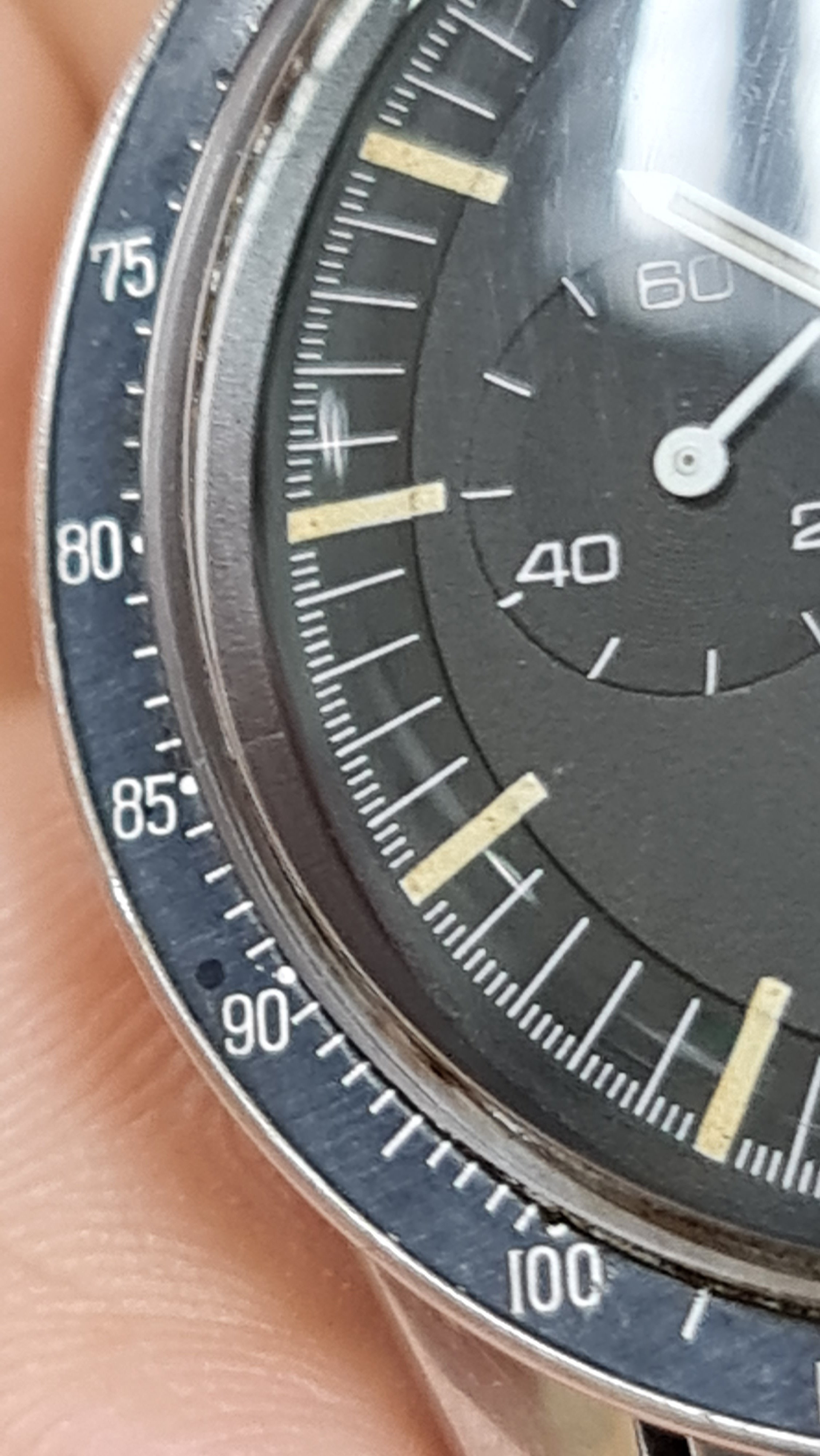 ·Yesterday when I was wearing the Ed White, i found a small black dot on the other side and over 90, I thought it was dirt but could not wipe it off. I have no idea when it was there, as I remember i did not see it when I bought the watch 3 years ago so it must be during my ownership. Maybe it was a drop of oil or something that make a stain there, it is visible in some angles.
