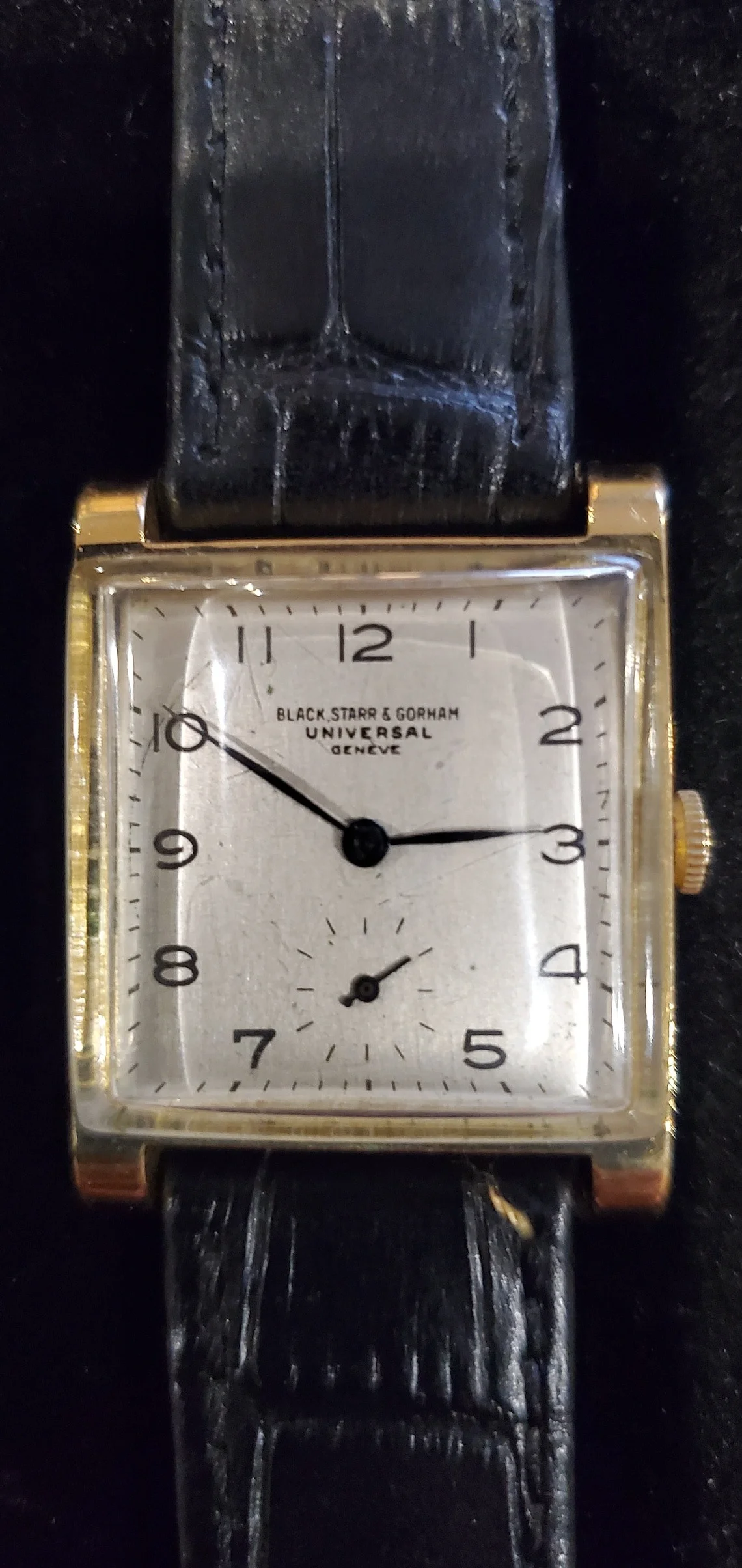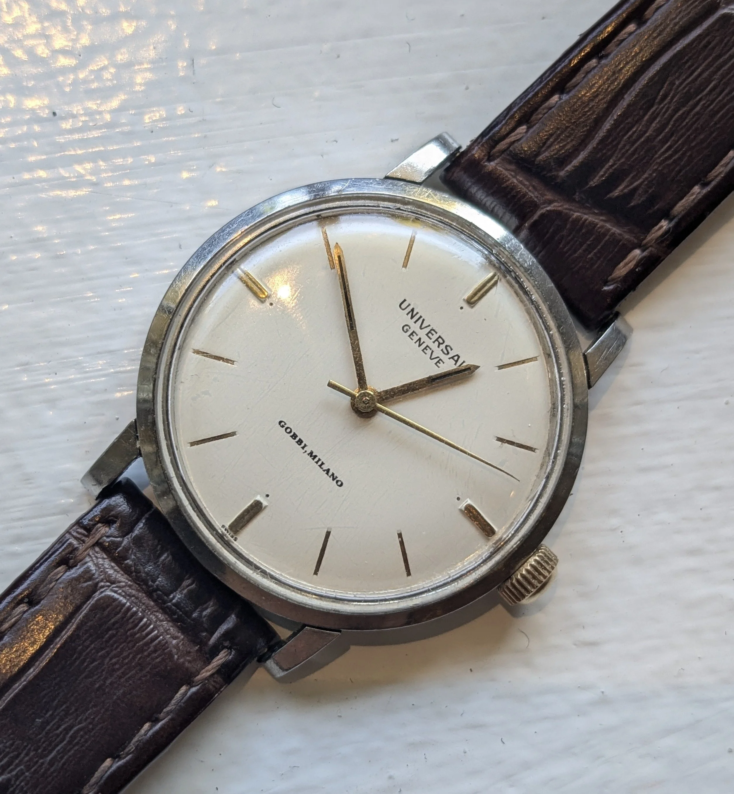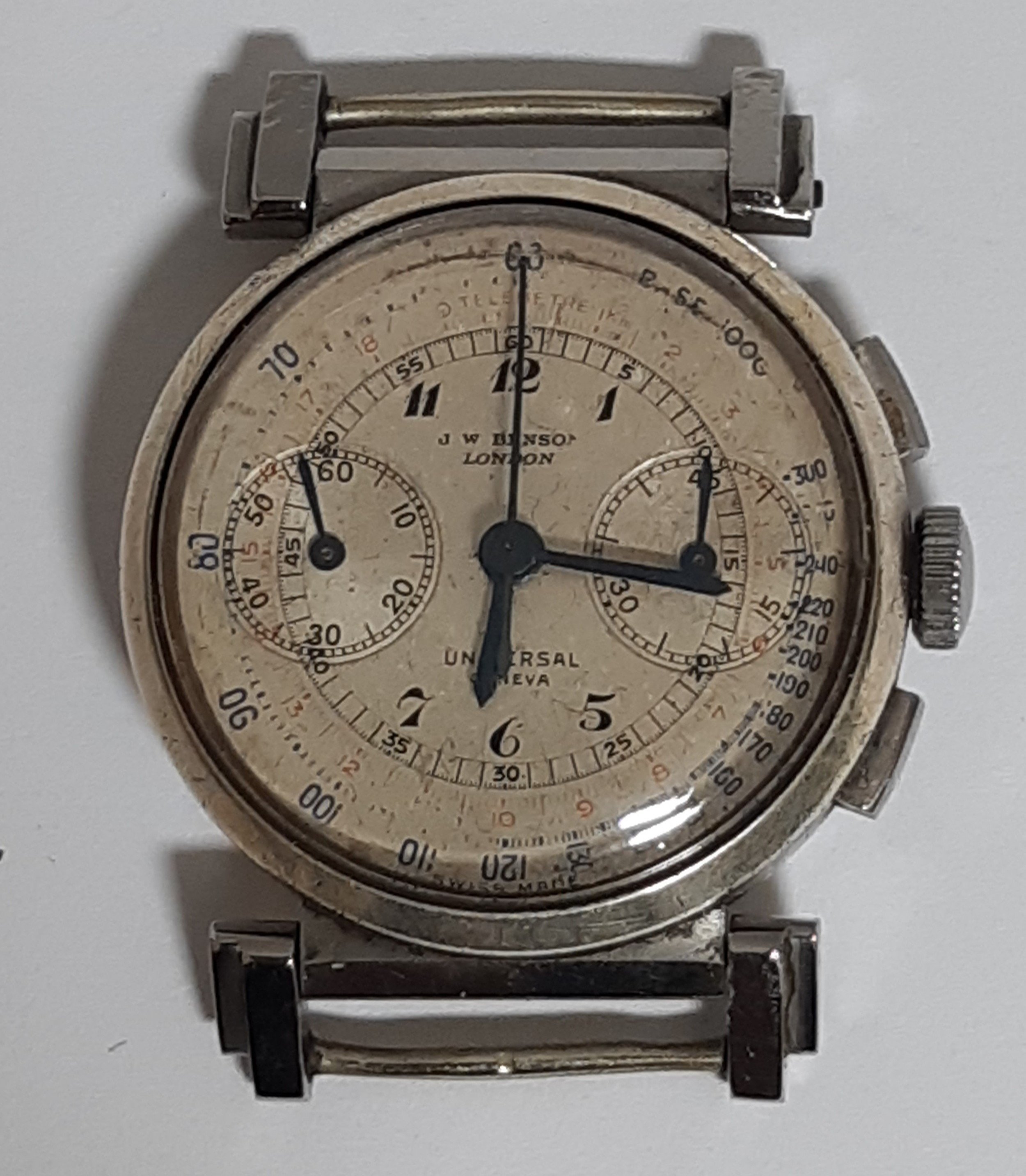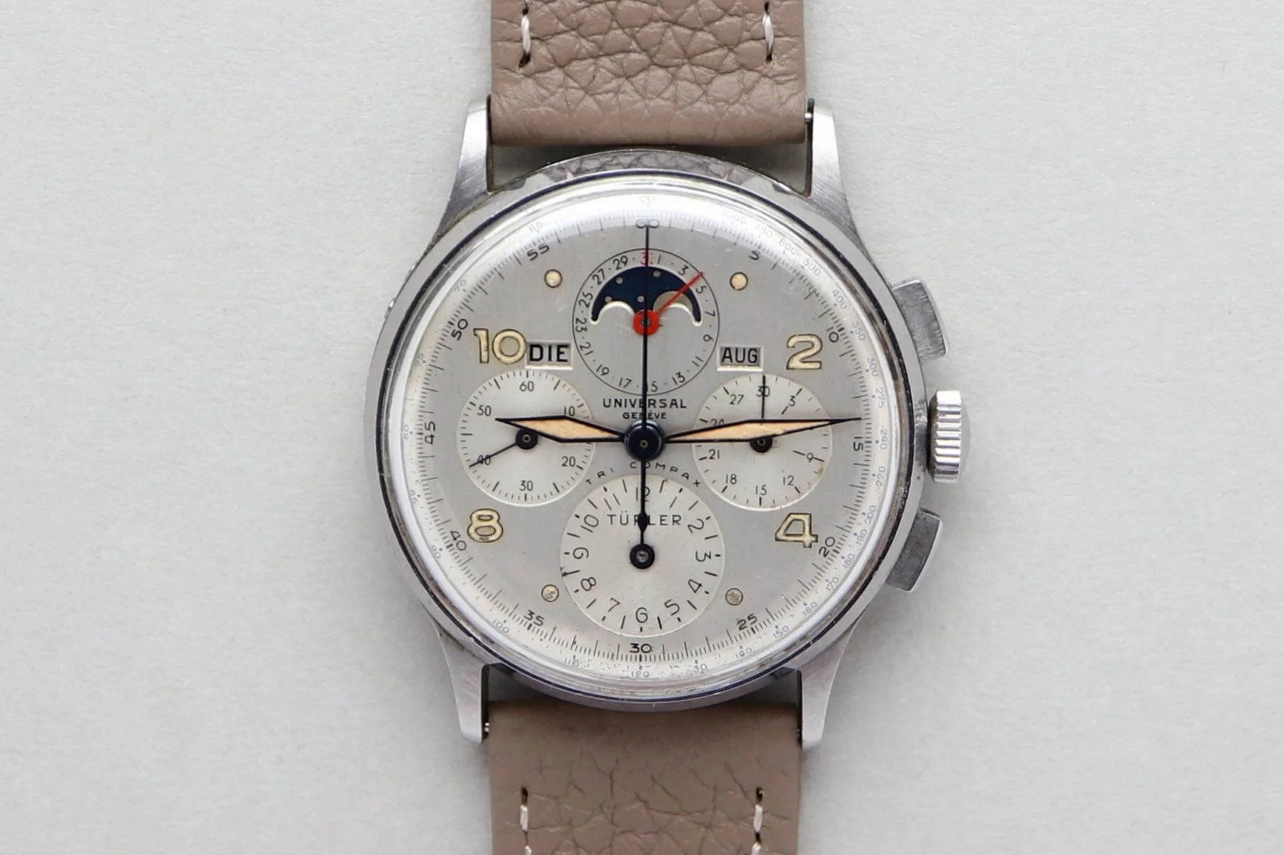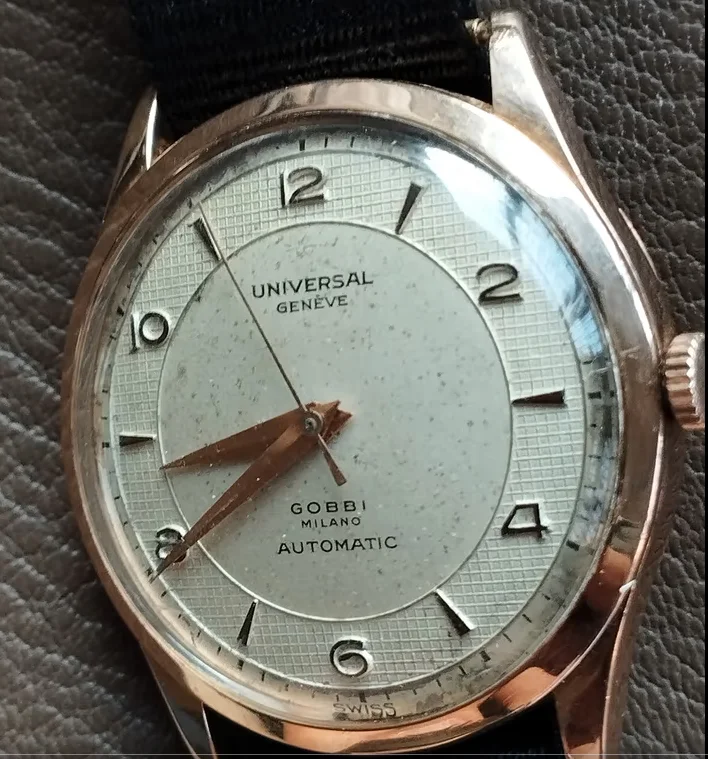 Well, it’s one of these later generic (but UG original) dials. No dash in Tri Compax, lume plots and numbers, one size only (32mm the dial plate). Made by UG probably in the 60s.