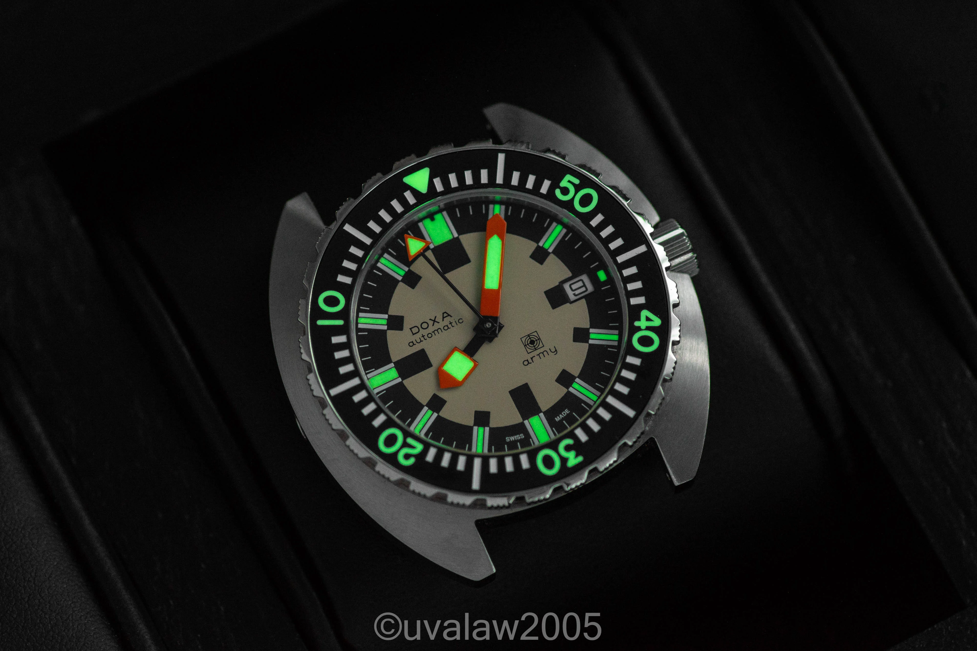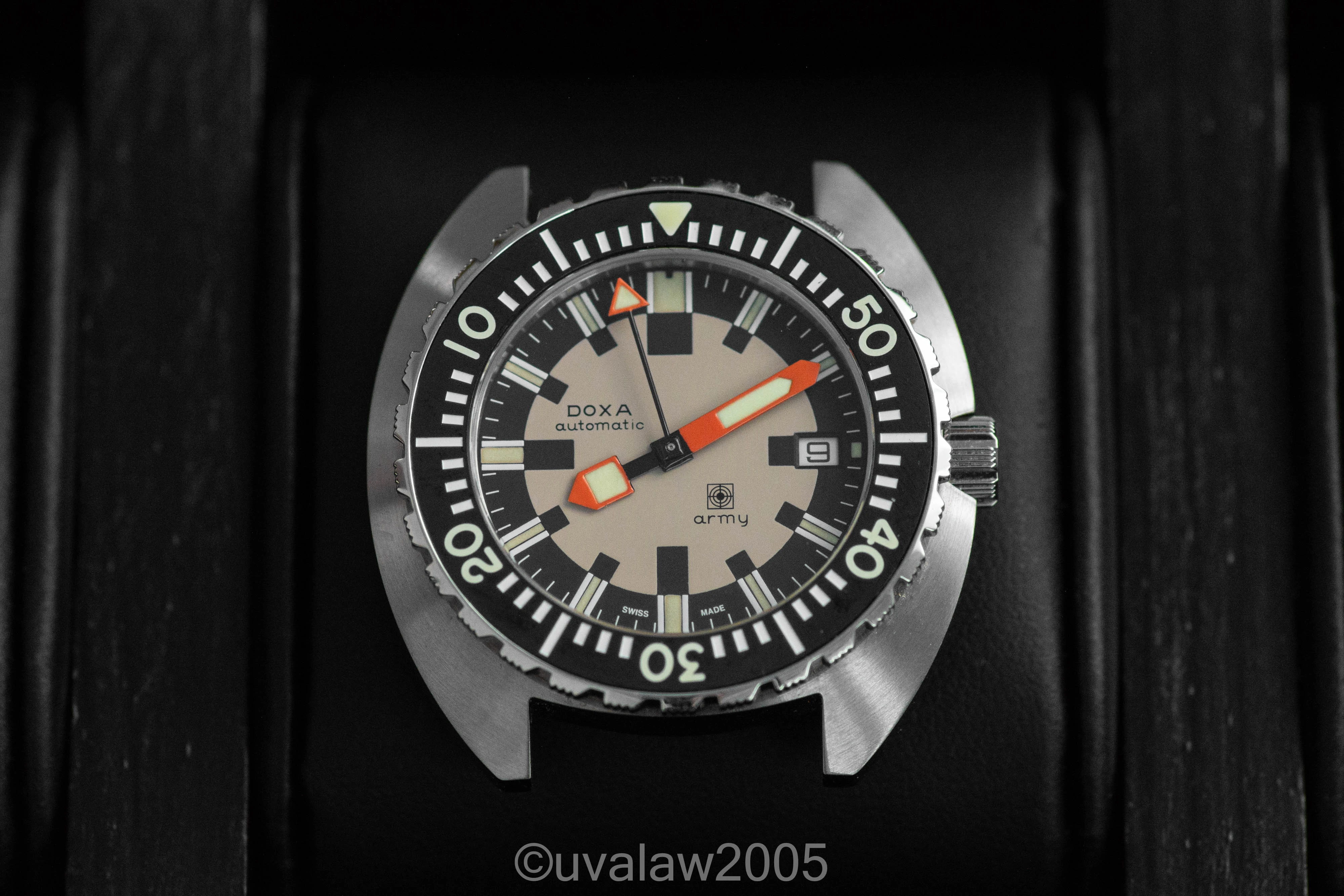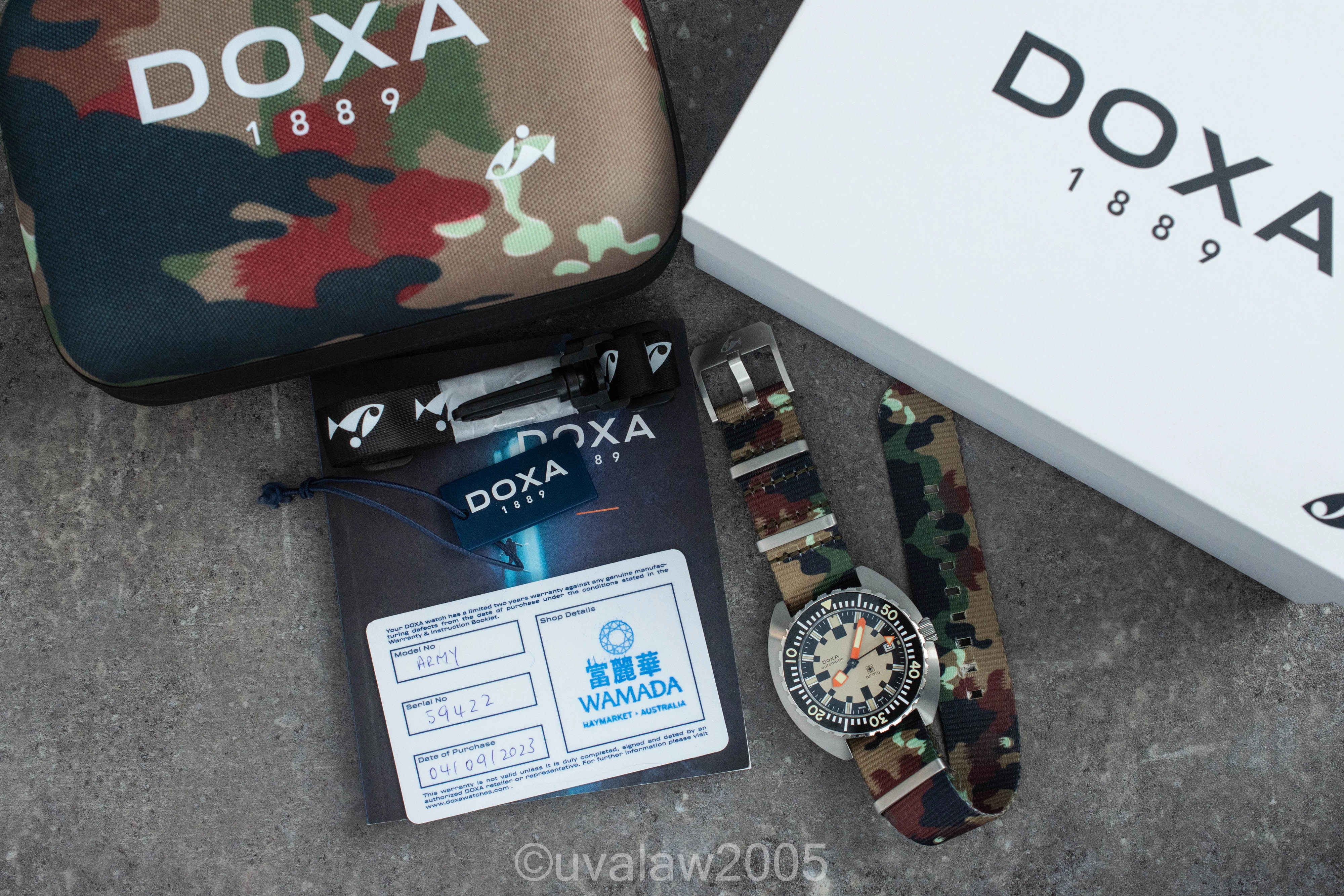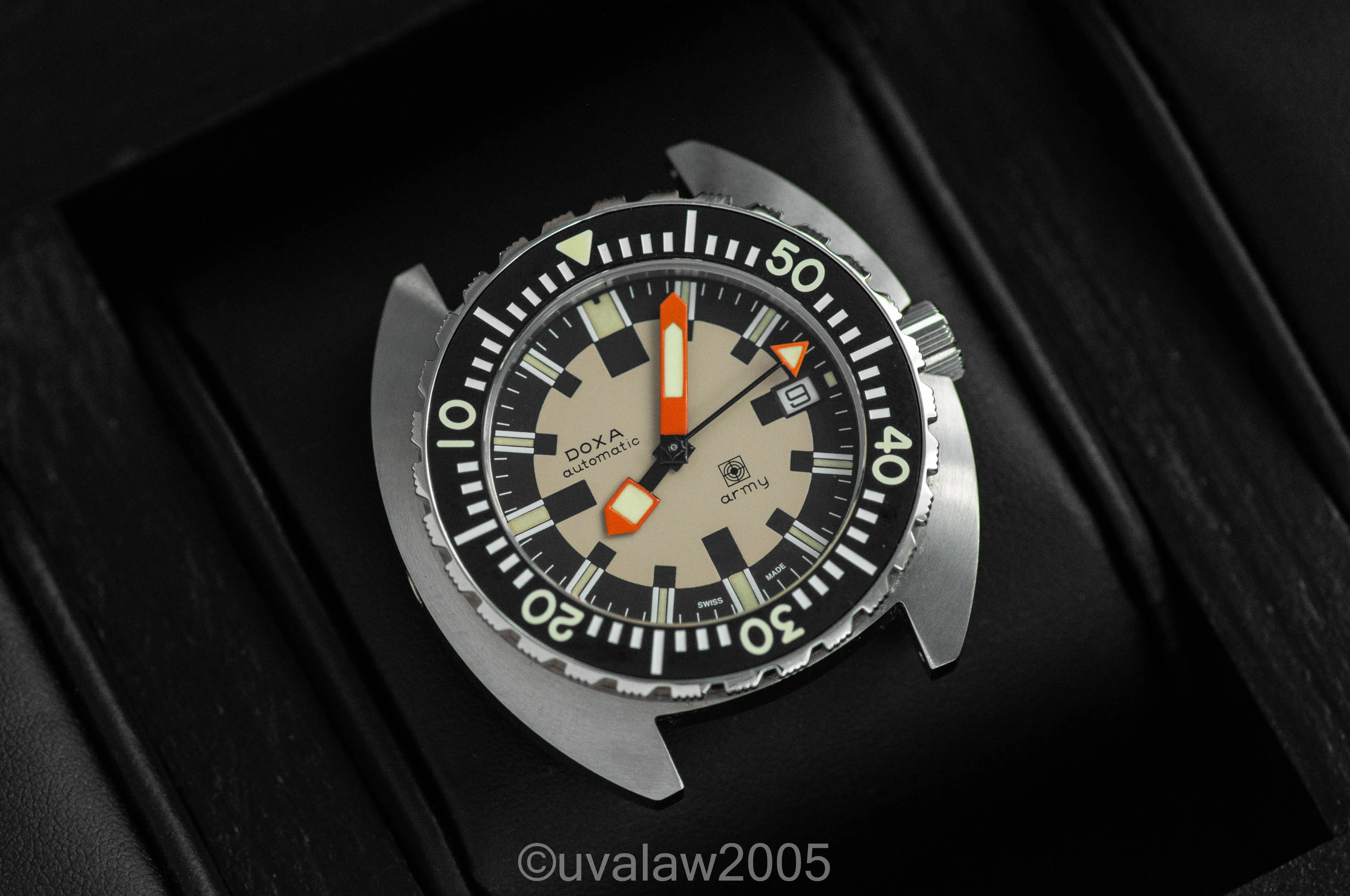 ·For sale is my black bezel stainless steel DOXA Army in excellent condition with light surface wear and strap change marks to the back of the lugs. Comes on OEM NATO - no bracelet or rubber strap - with inner/outer boxes, manual, hang tag, stamped/dated warranty card, and original sale receipt.