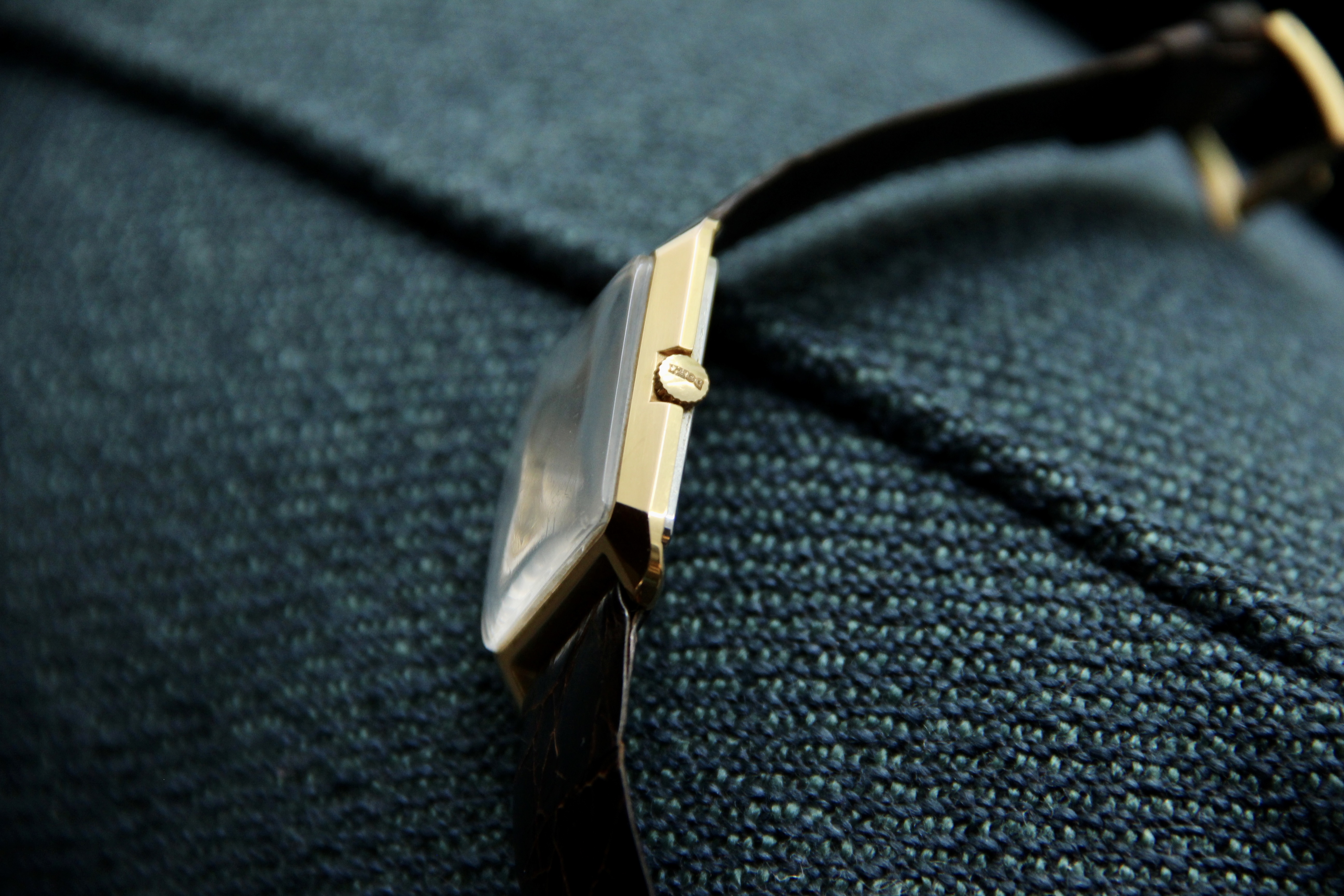 Condition: This example is in excellent vintage condition. The beautiful linen dial is clean. The gold plated case and the stainless steel back are very, very nice for being 60 years old. Service history is unknown but the caliber 104 winds smoothly and keeps good vintage time.