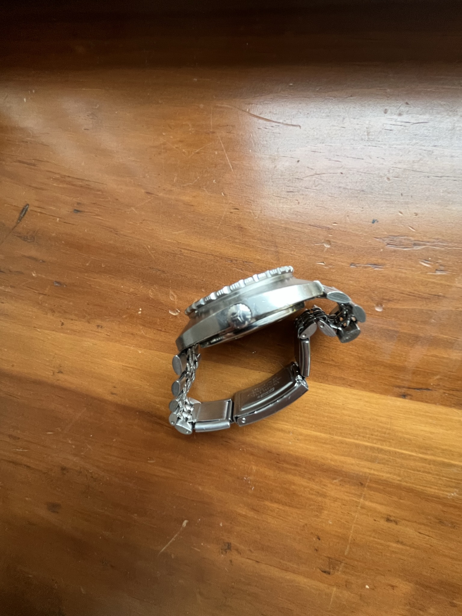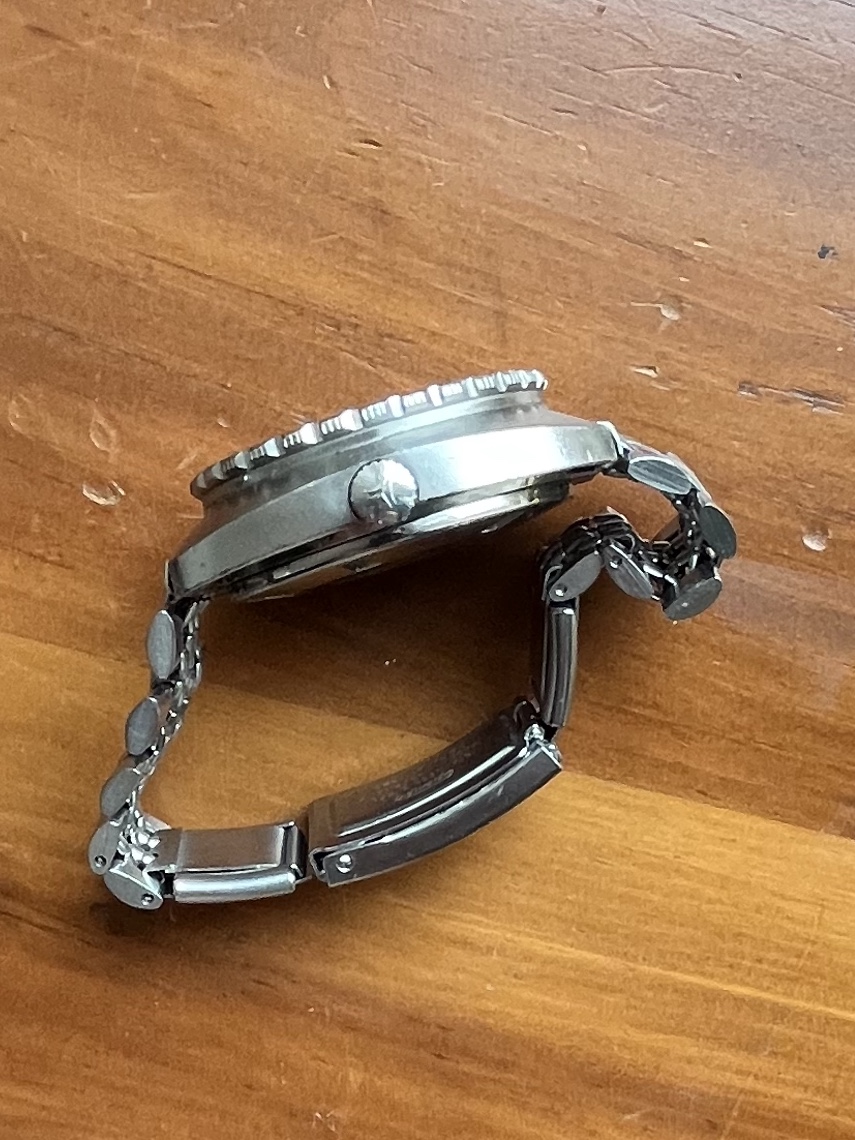 Case: 42mm stainless with prominent case lines and retaining most of the factory brushing, serial numbers clear on case back. Bezel is sharp with most factory paint remaining, clicks and spins as it should.