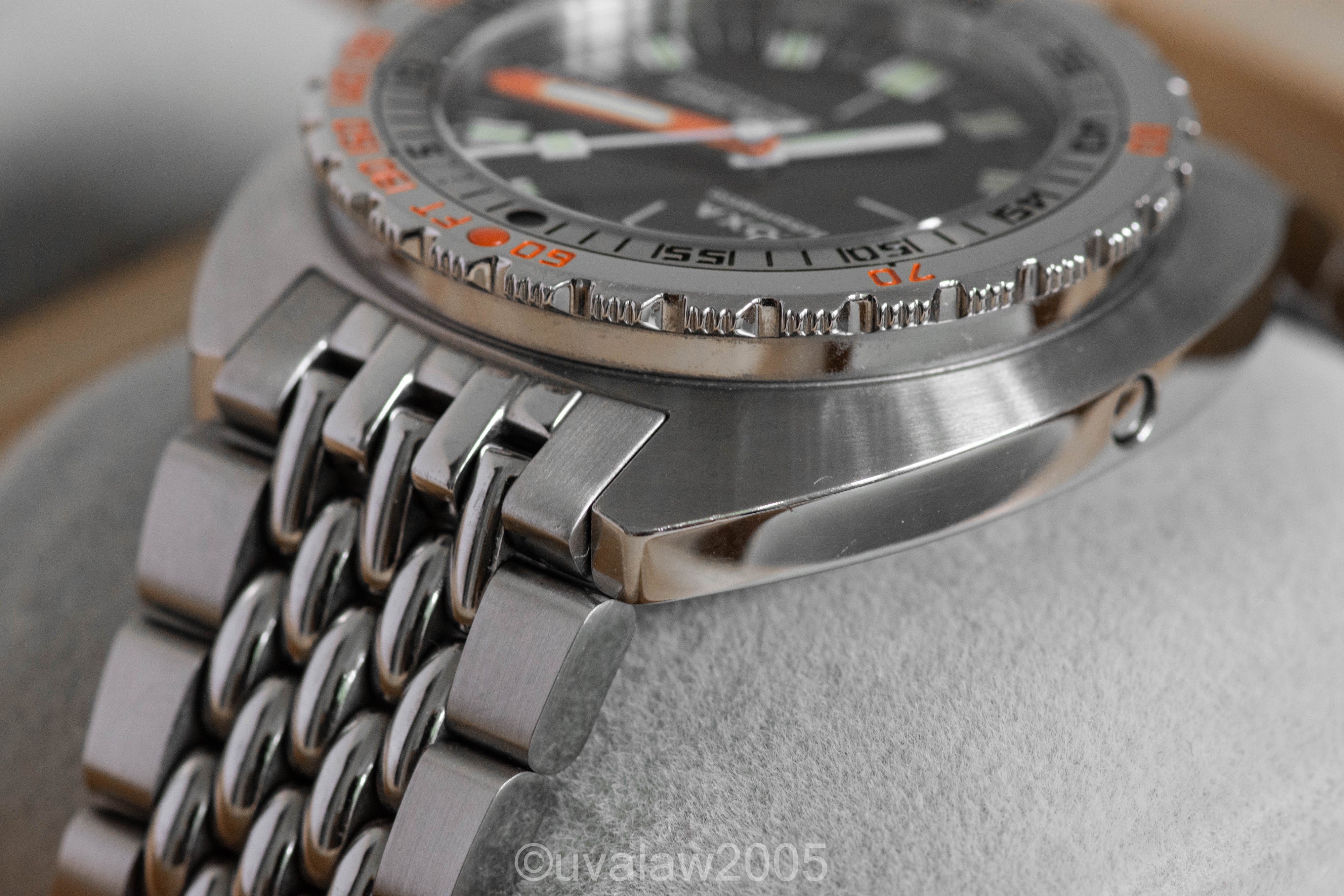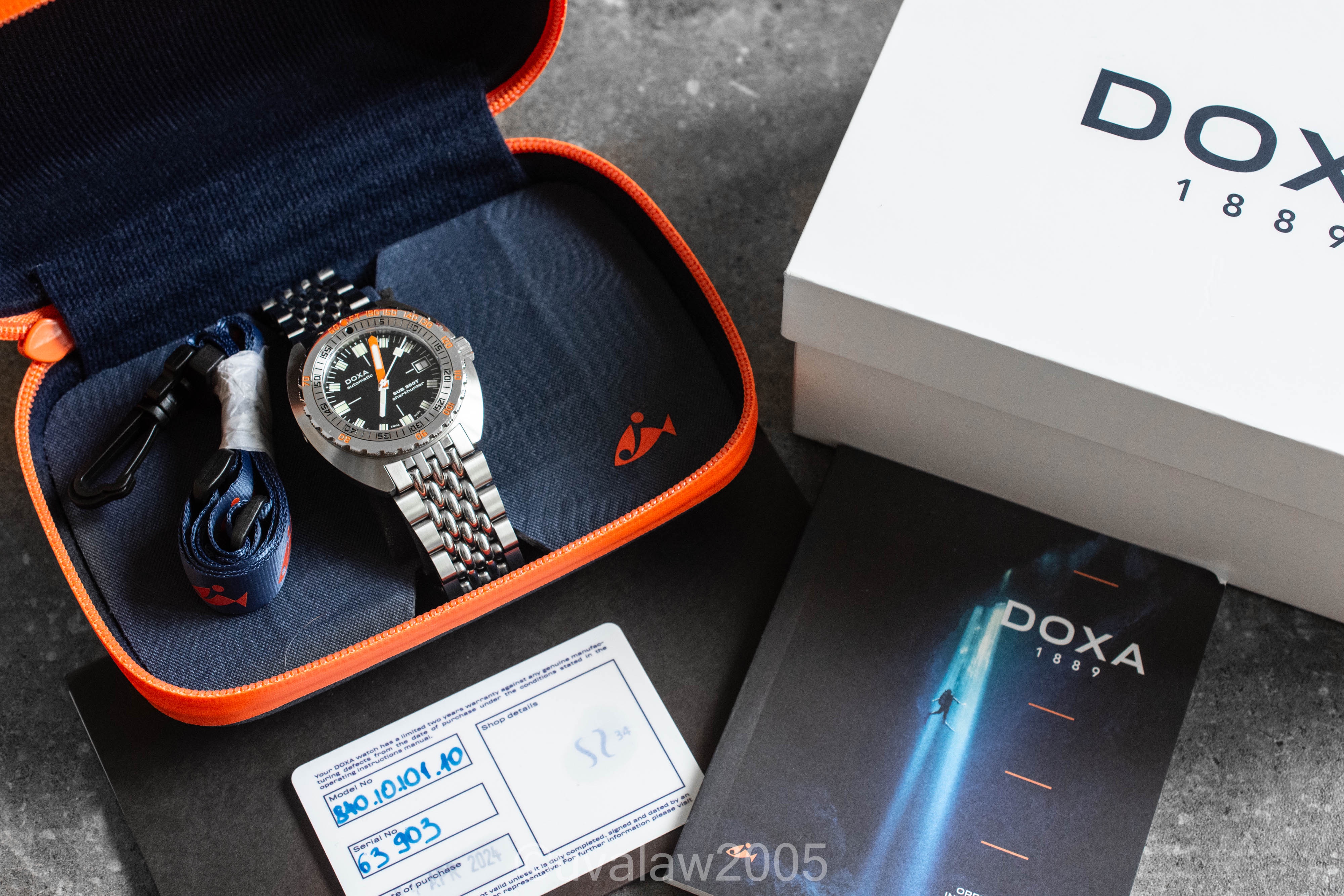 Comes with inner/outer box, manual, stamped warranty card, and original sales receipt. I'm the second owner; original owner purchased it from DOXA in April of this year. Light wear throughout as shown in high-res photos in the album. Movement is keeping excellent time, measuring +3s/day with strong amplitude on the timegrapher.