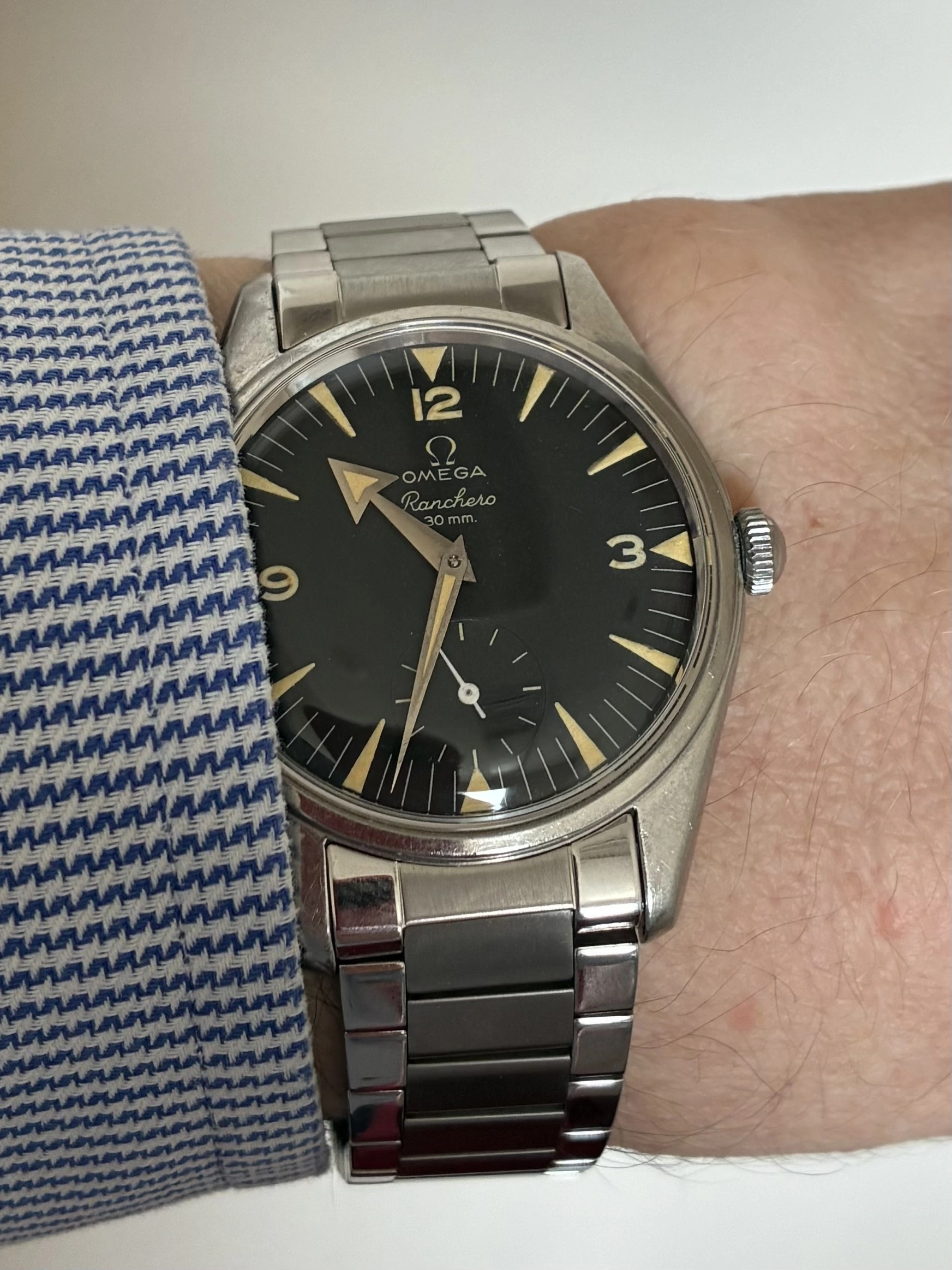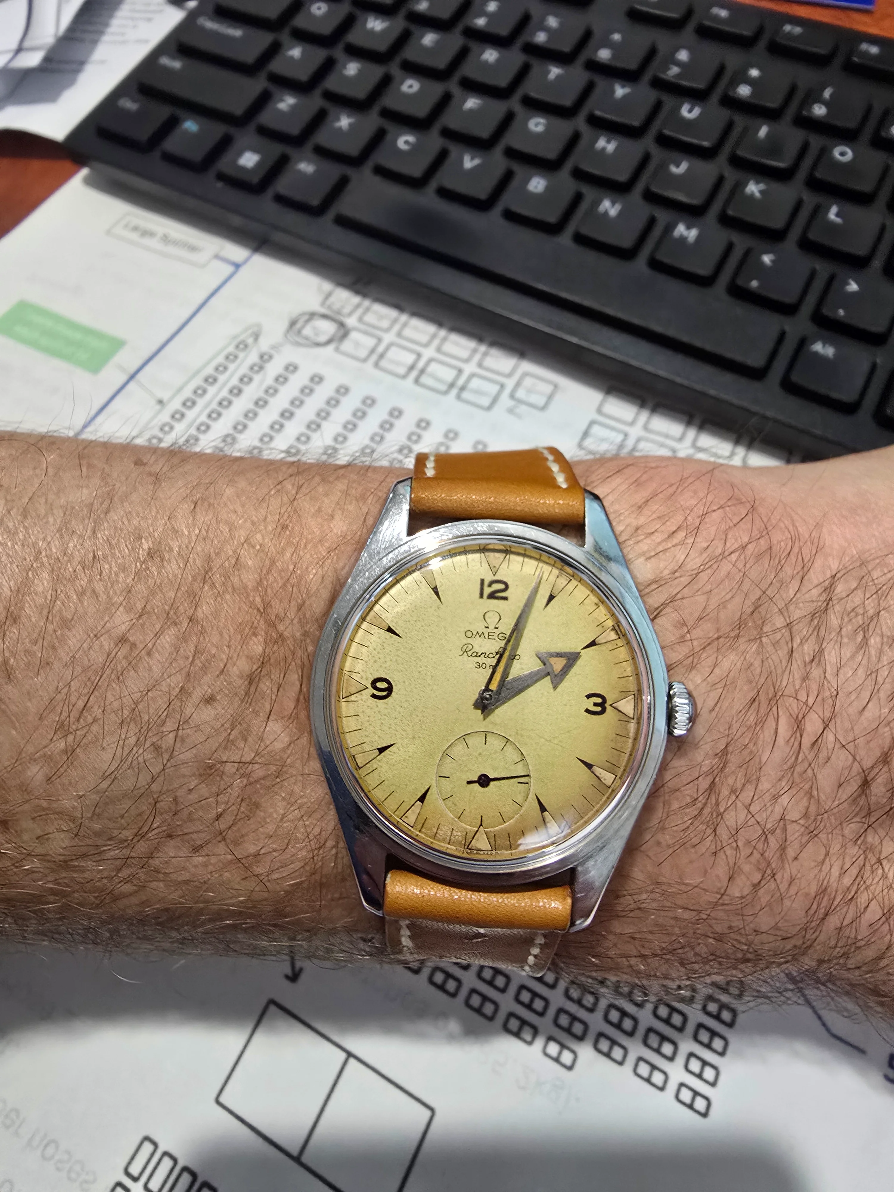 ·Hey OF experts! Attached is a pic of my 1958 Ranchero on a brown leather strap. I want to have a bracelet option for this watch. Given the yellow patina of this dial I can't decide between an all steel 1502 bracelet or a dual tone version- see AI mock-ups attached. The gold helps add a bit of warmth to tie in with the dial but is it a bit much/too dressy for this supposedly 'tool', 'ranch hand' styled watch? All opinions welcome!