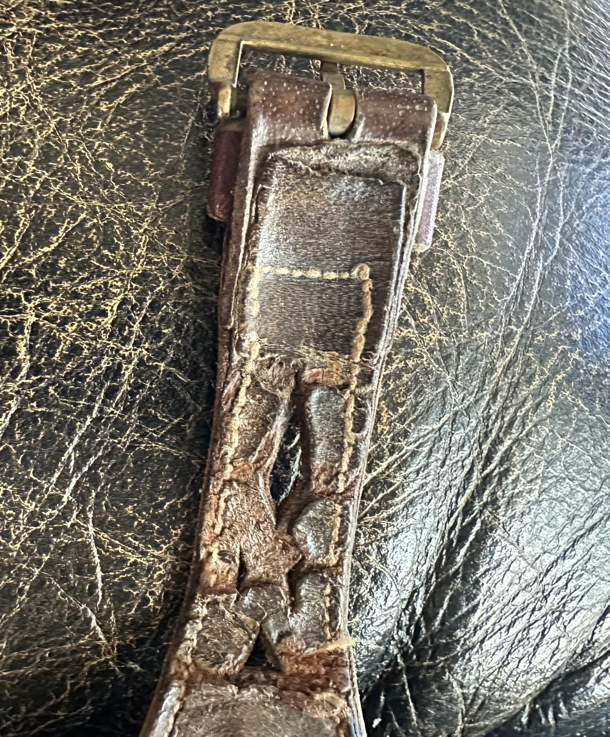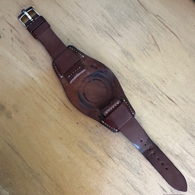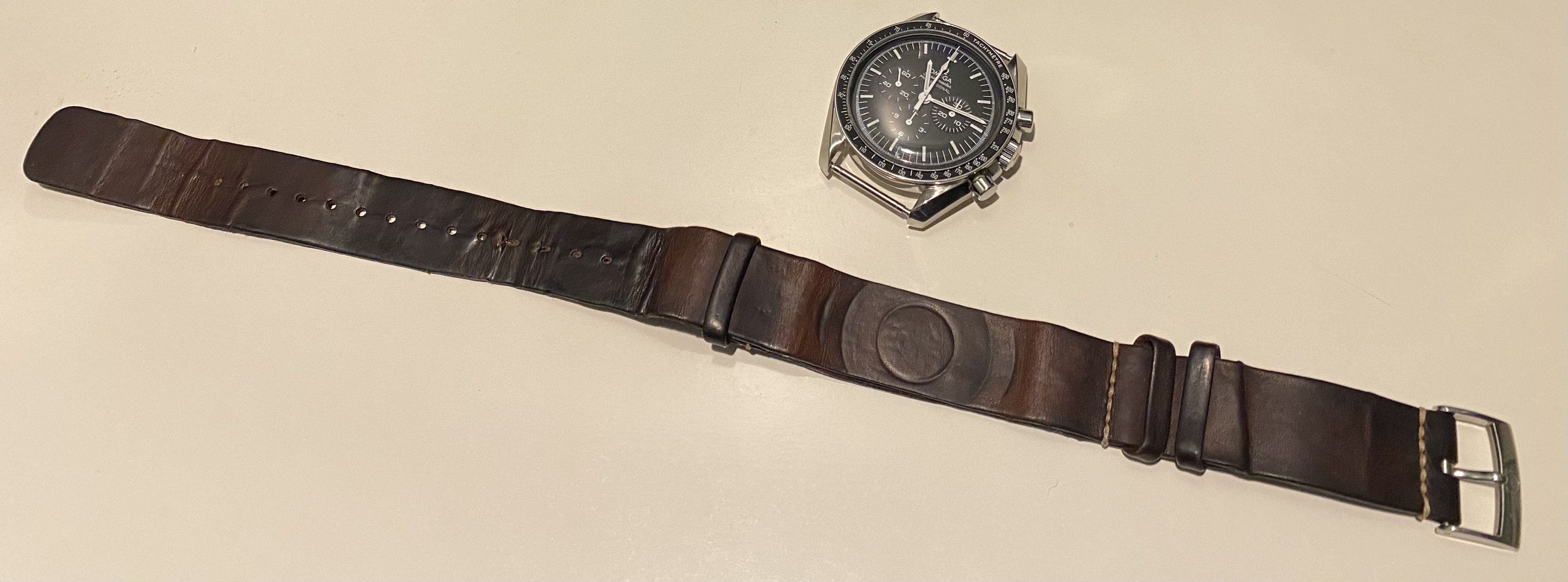 ·Here’s my amazing gnarly strap contribution [see pic below]…an Omega Barenia leather NATO that I purchased soon after I received my new 1861 in 2015. I think I mowed the lawn at least 72 times wearing that strap…possibly 73 or 74 times…and some sweating was probably going on during most of those mowing evolutions.