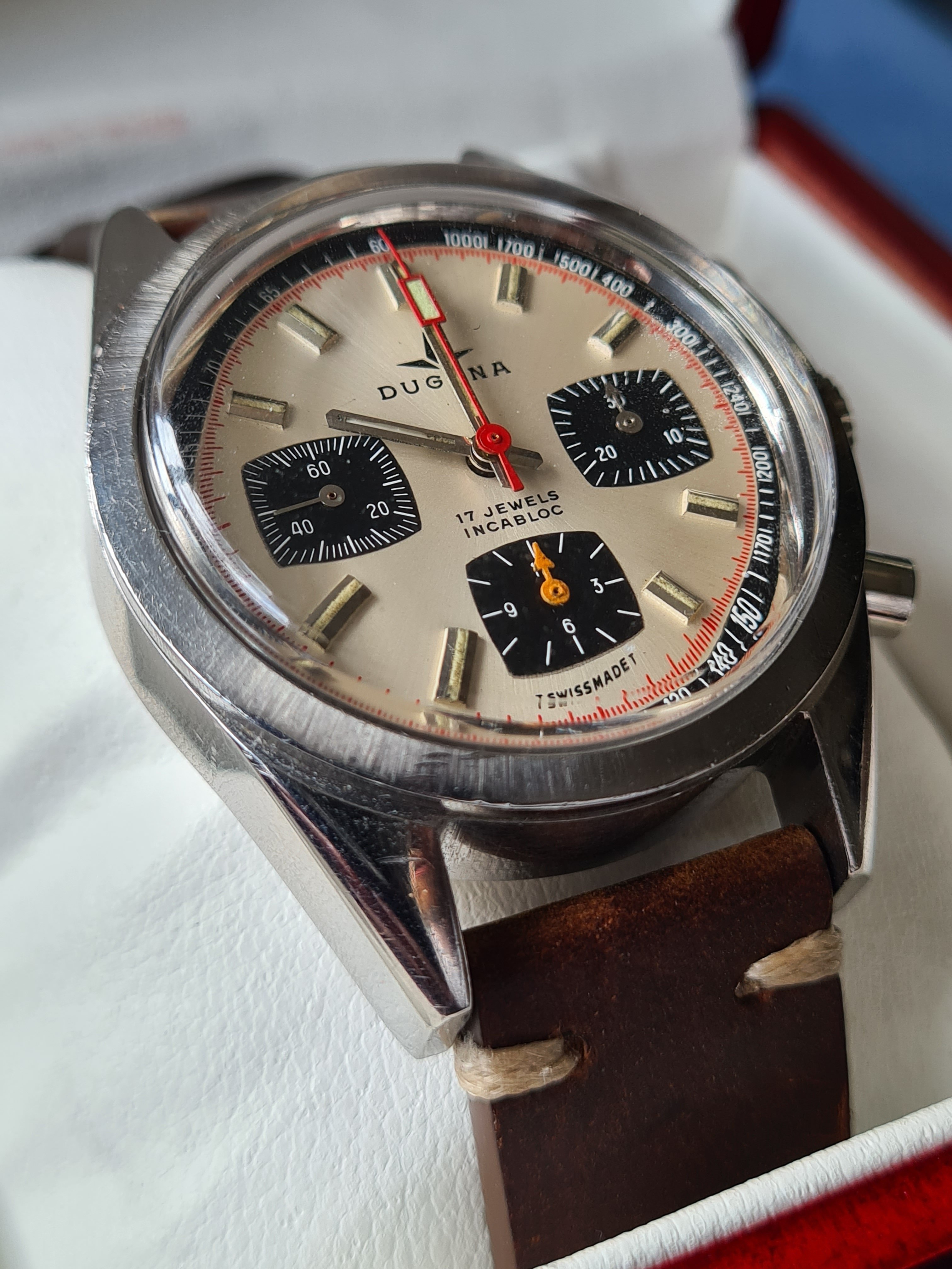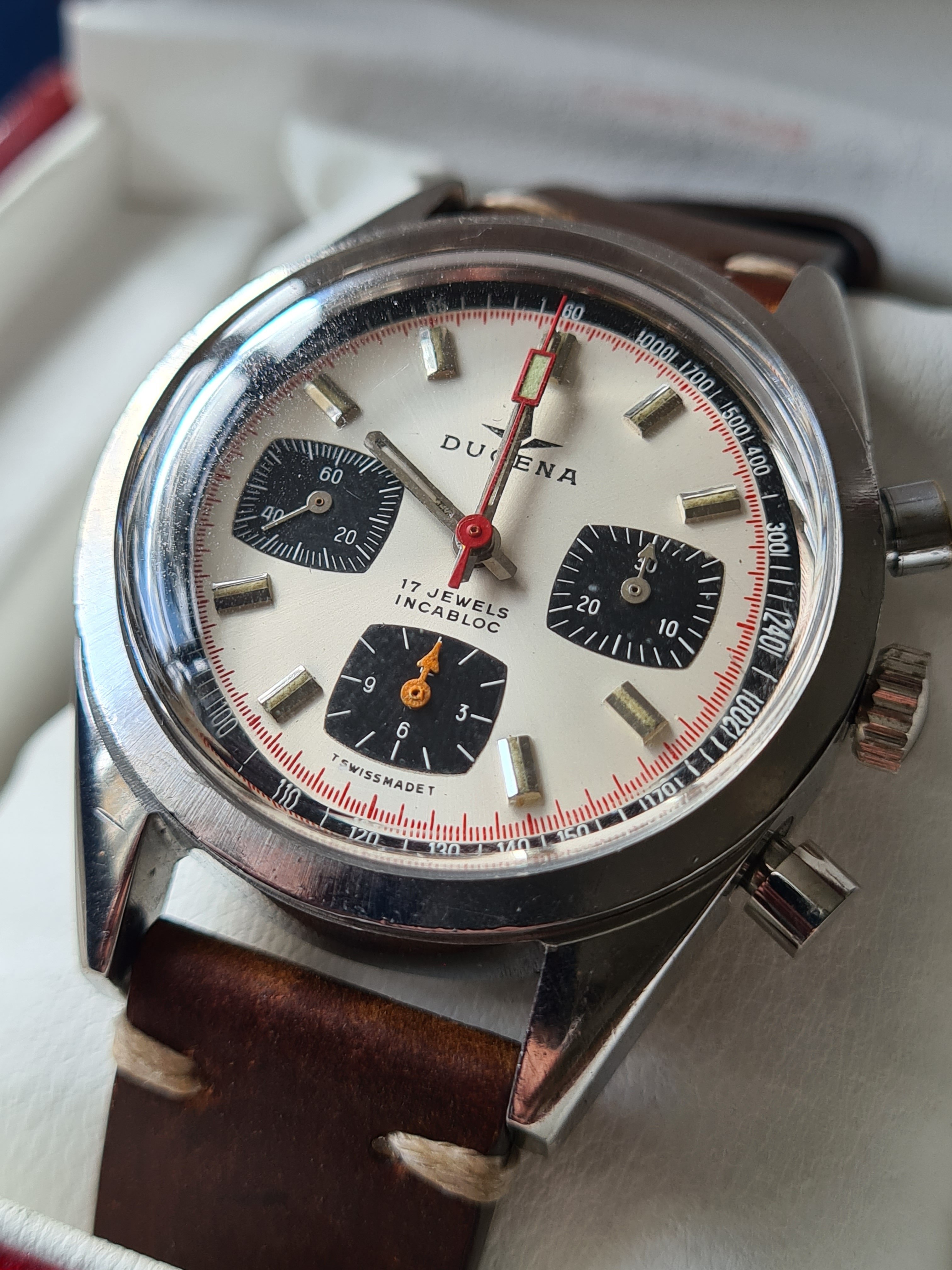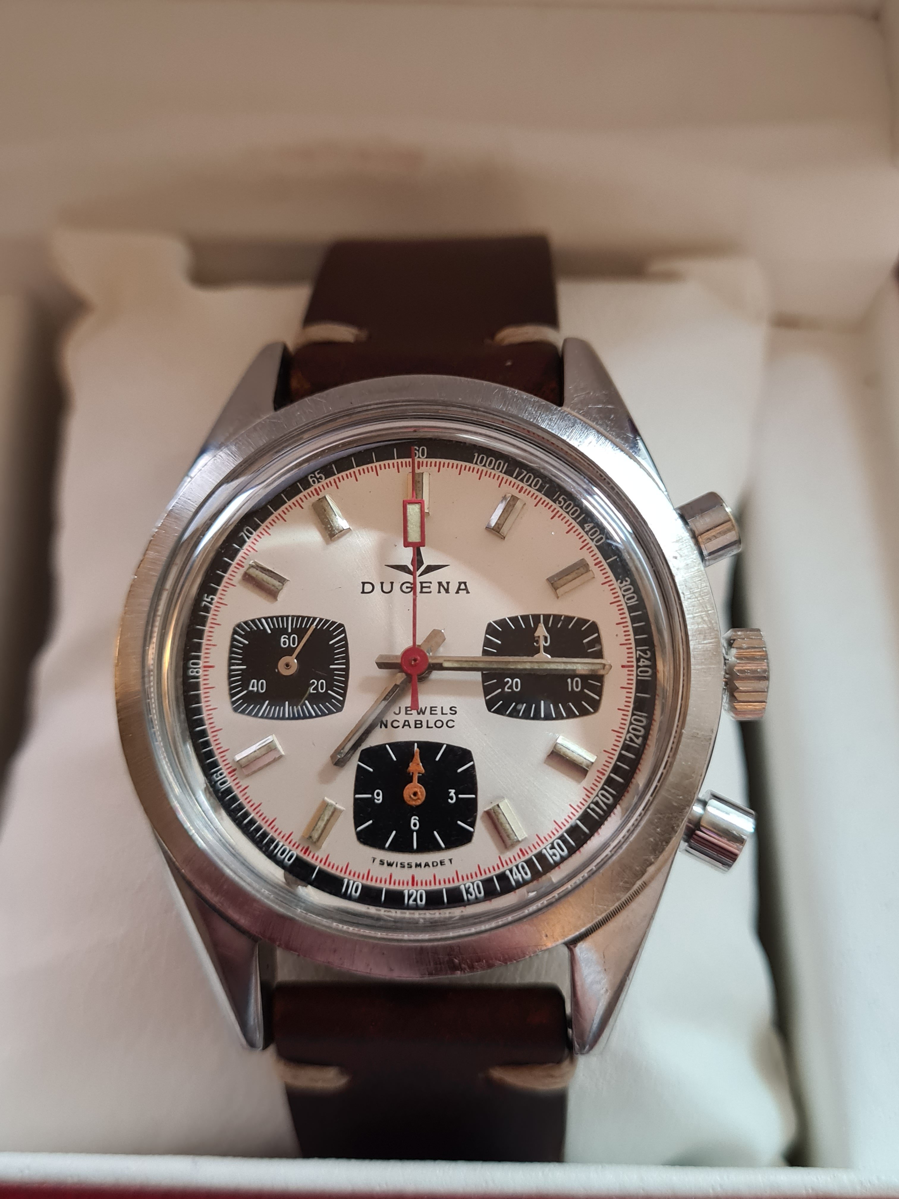 ·On offer from my personal collection is a beautiful Dugena three-register chronograph.