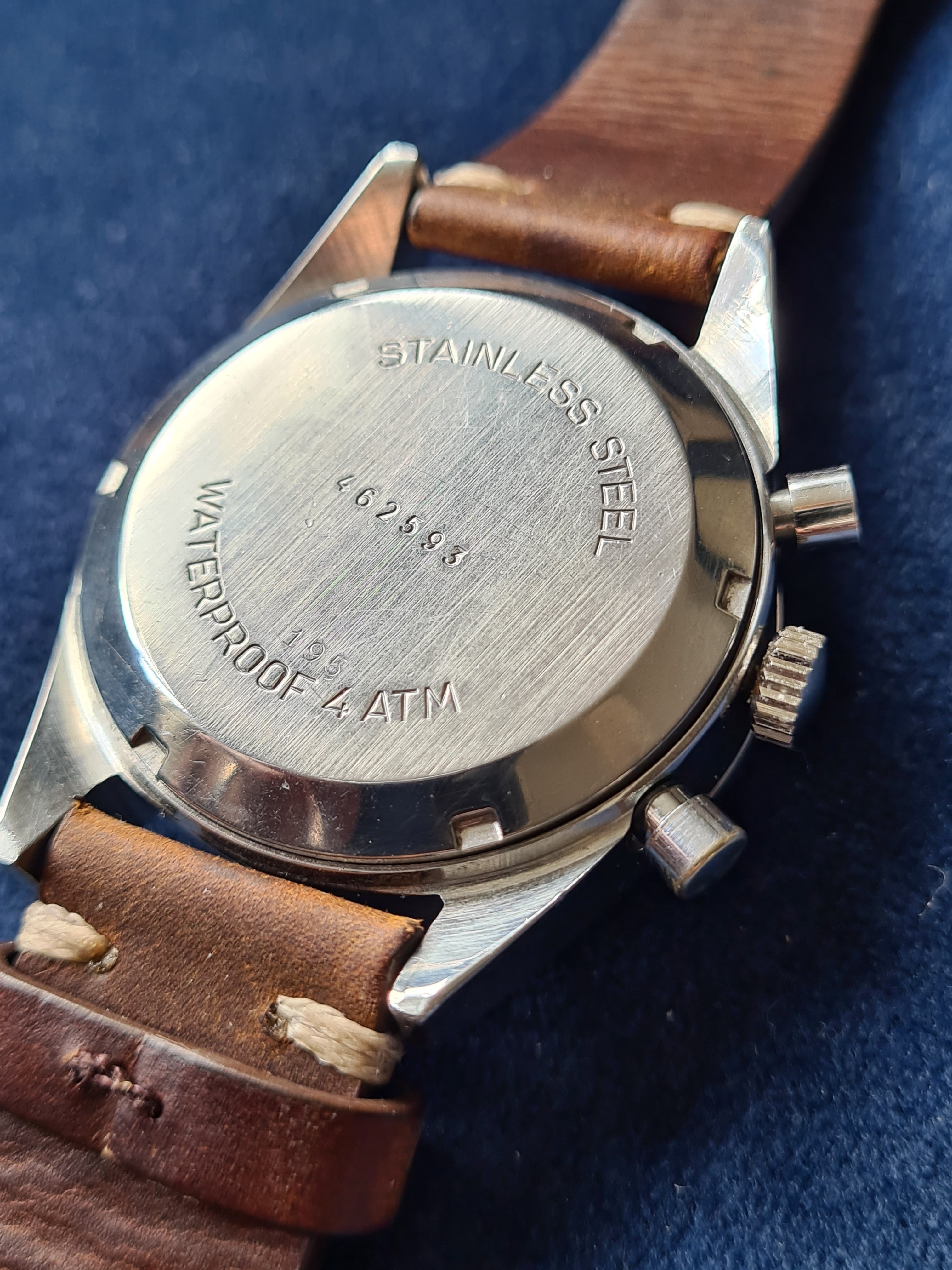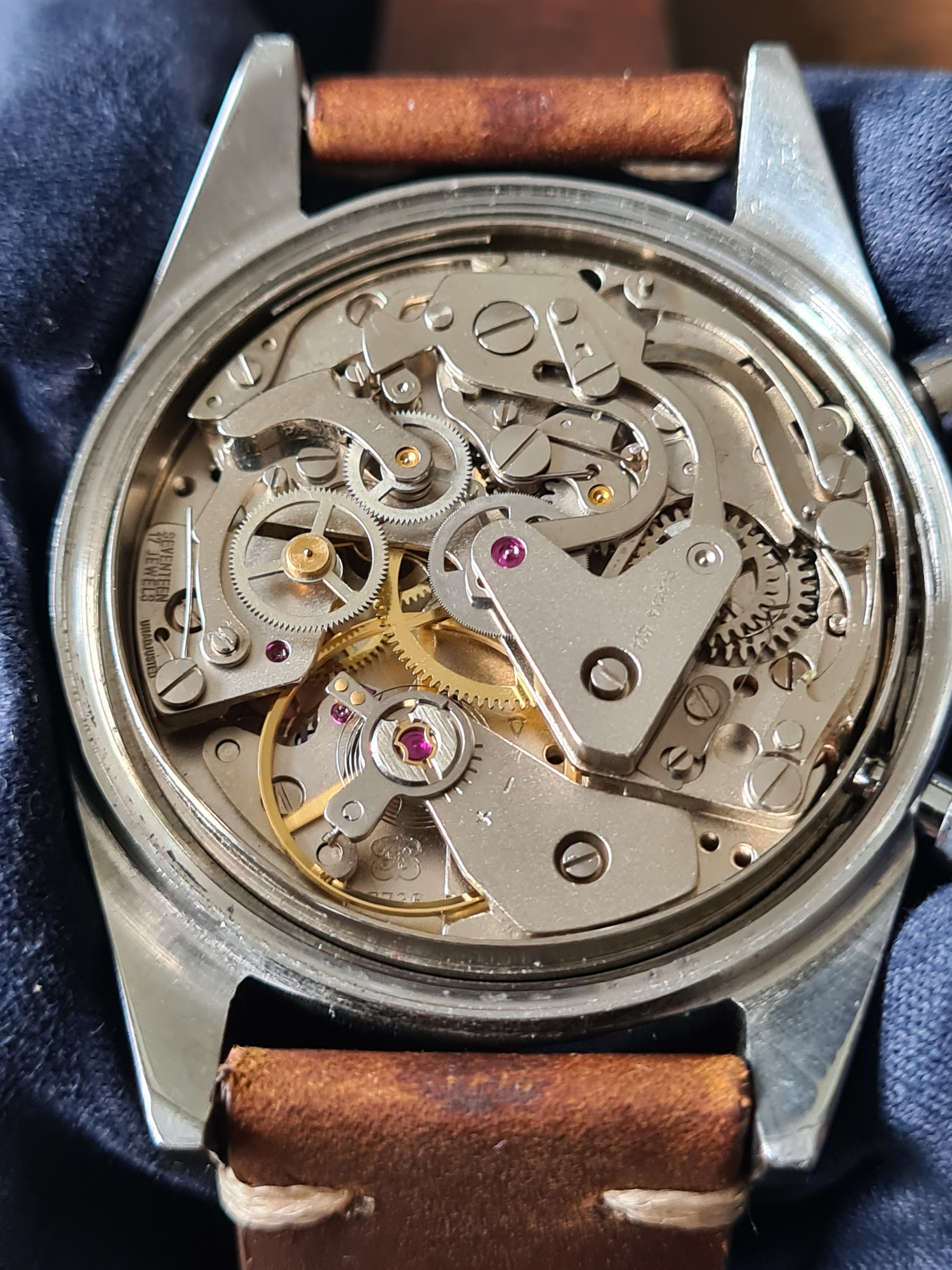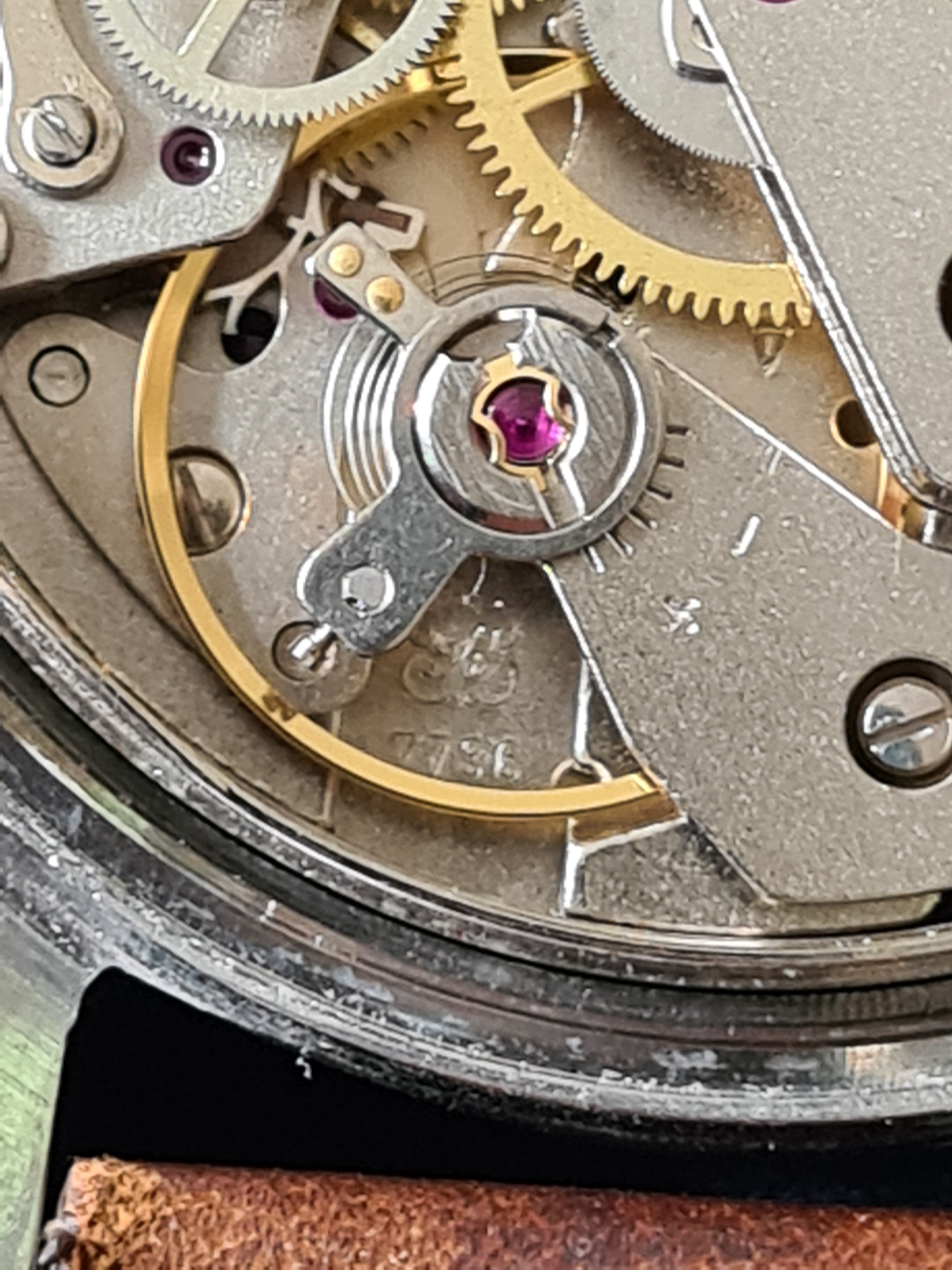 Inside is the Valjoux 7736 movement, which is also found in some models of the Heuer Autavia.