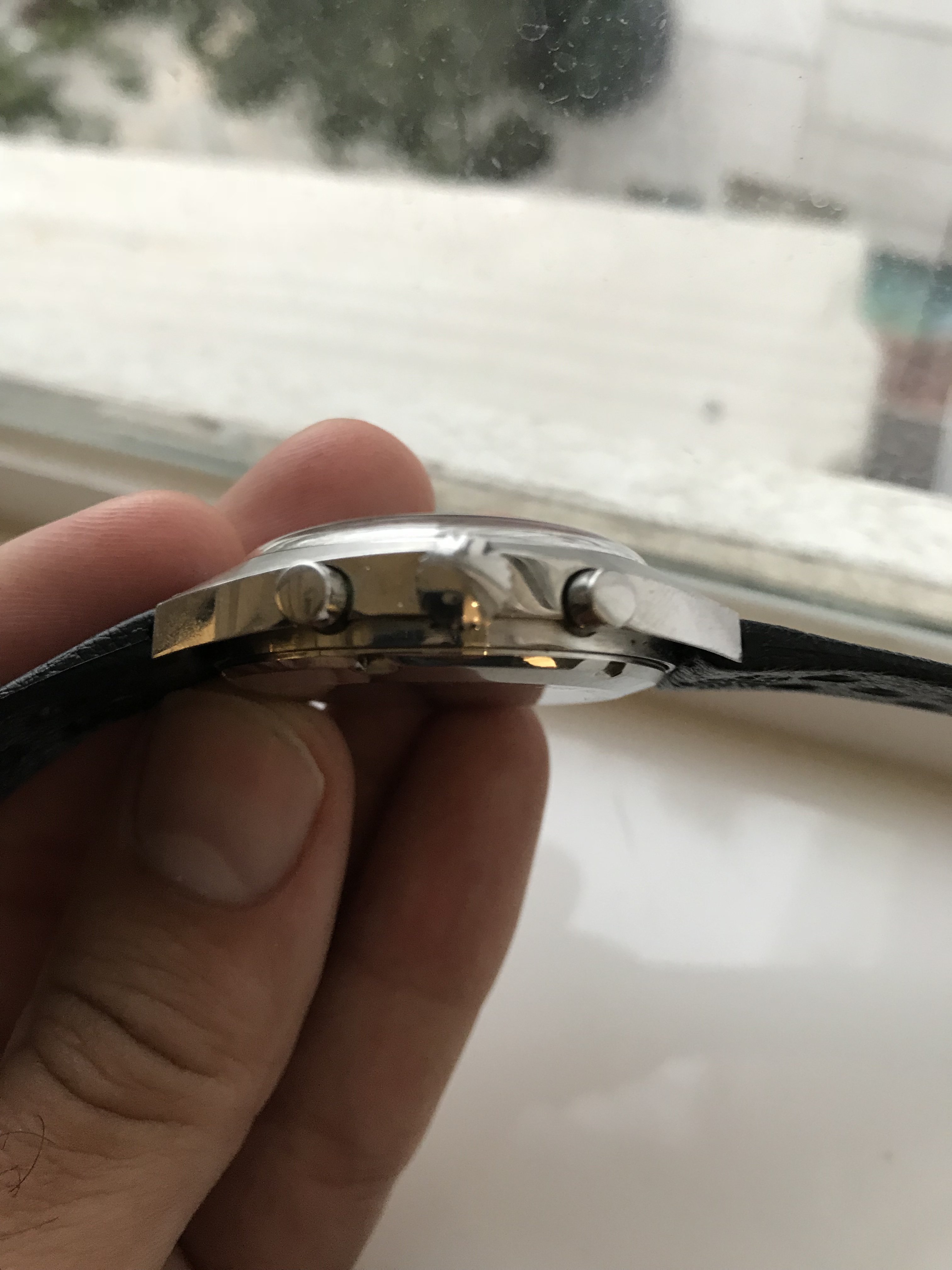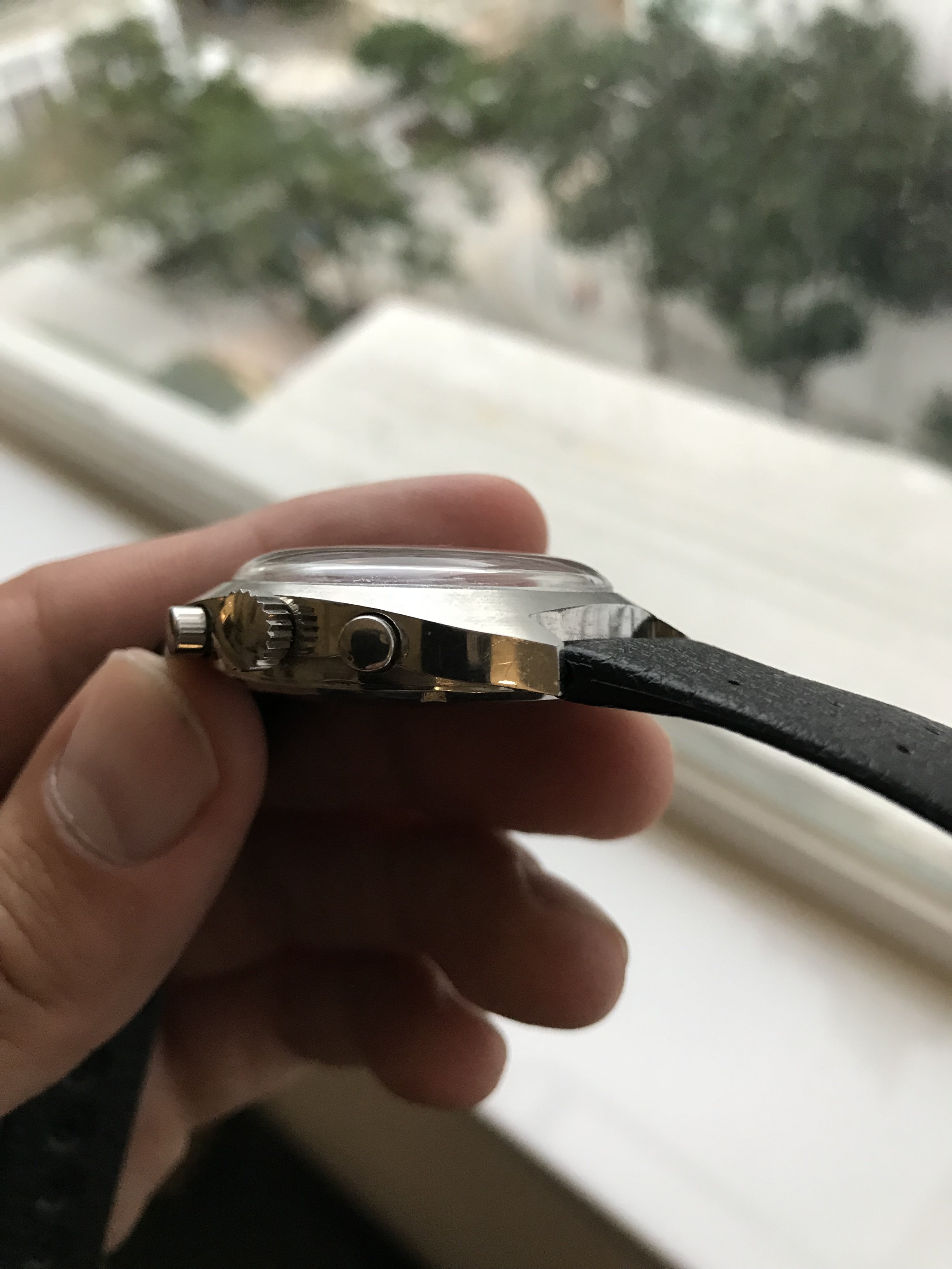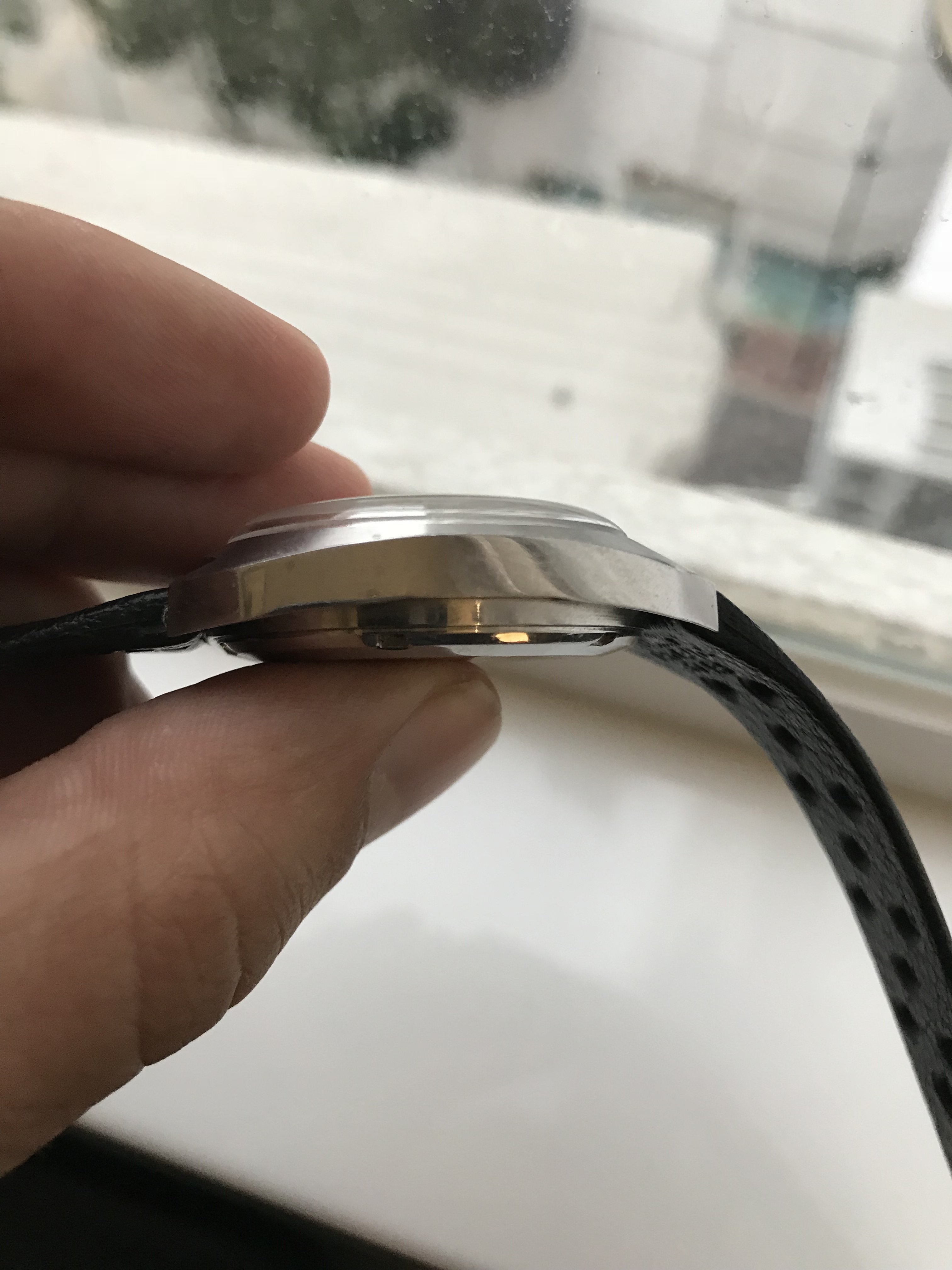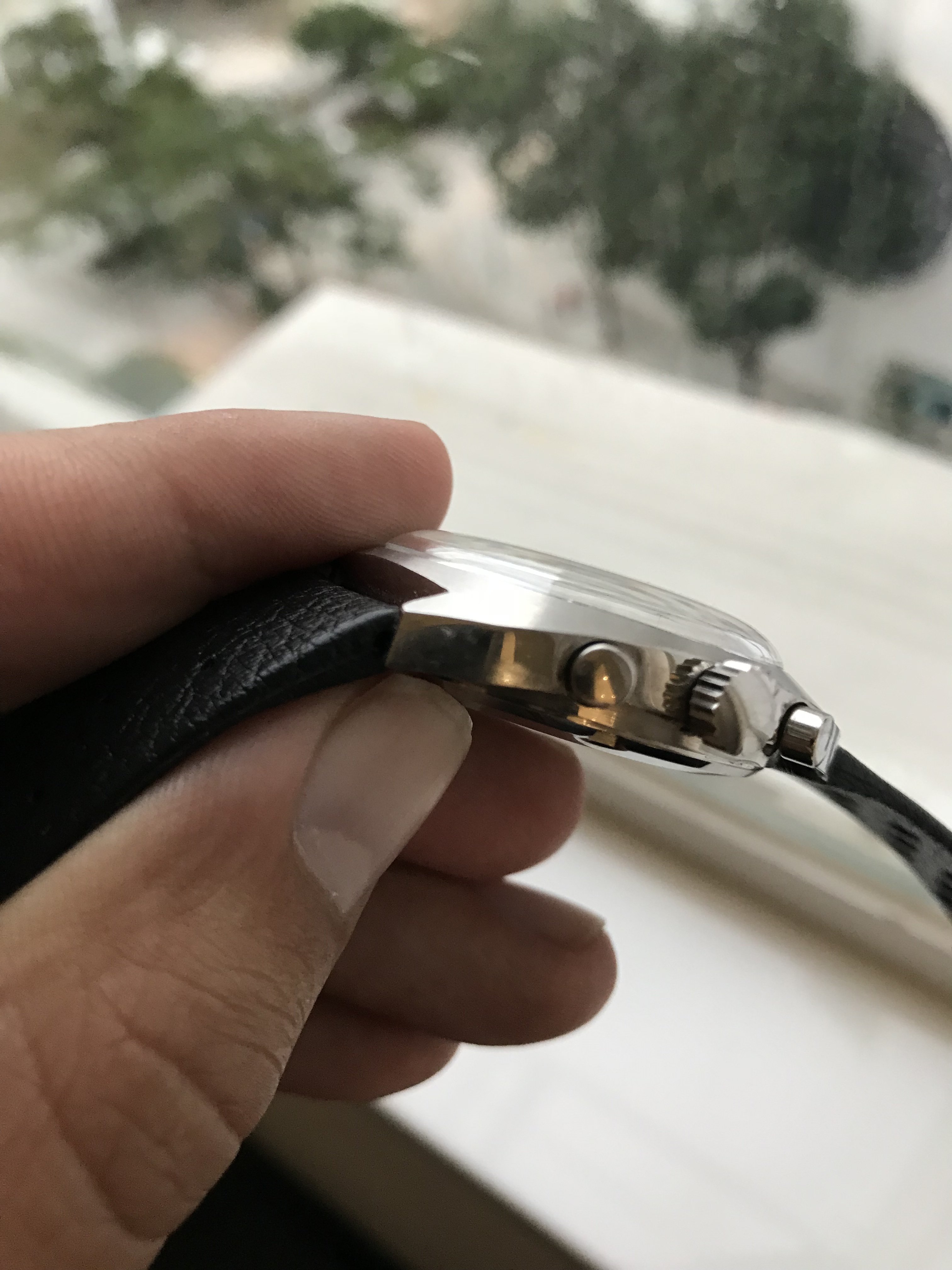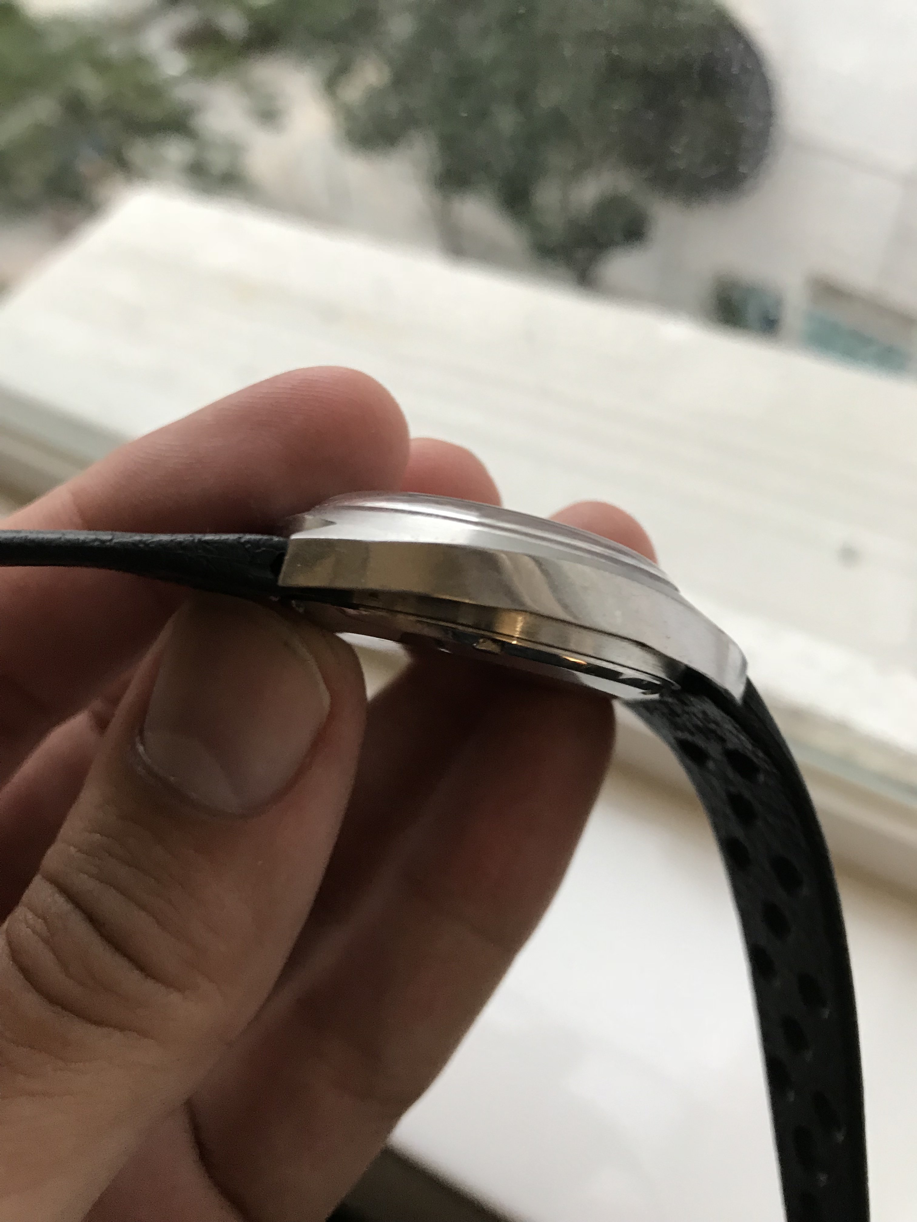 The case is in excellent shape, comes on a racing style leather strap, and just feels solid on the wrist. Case measures 38mm.
