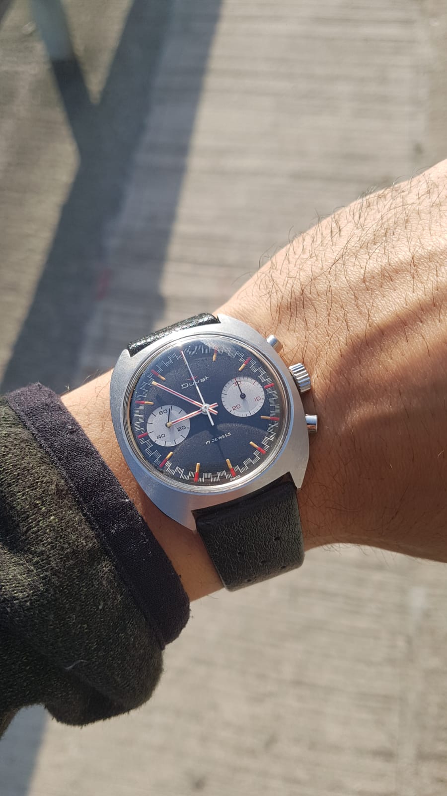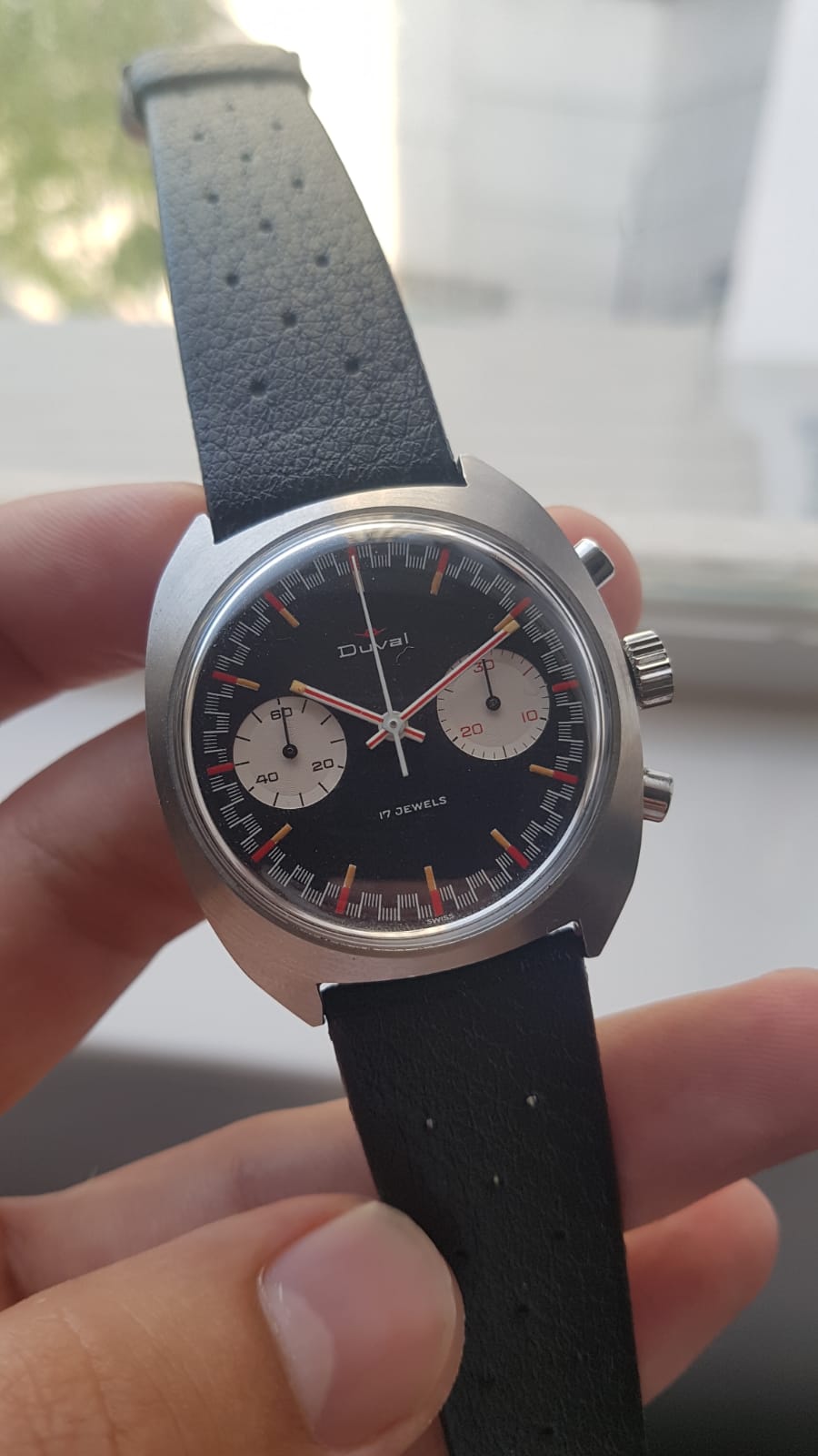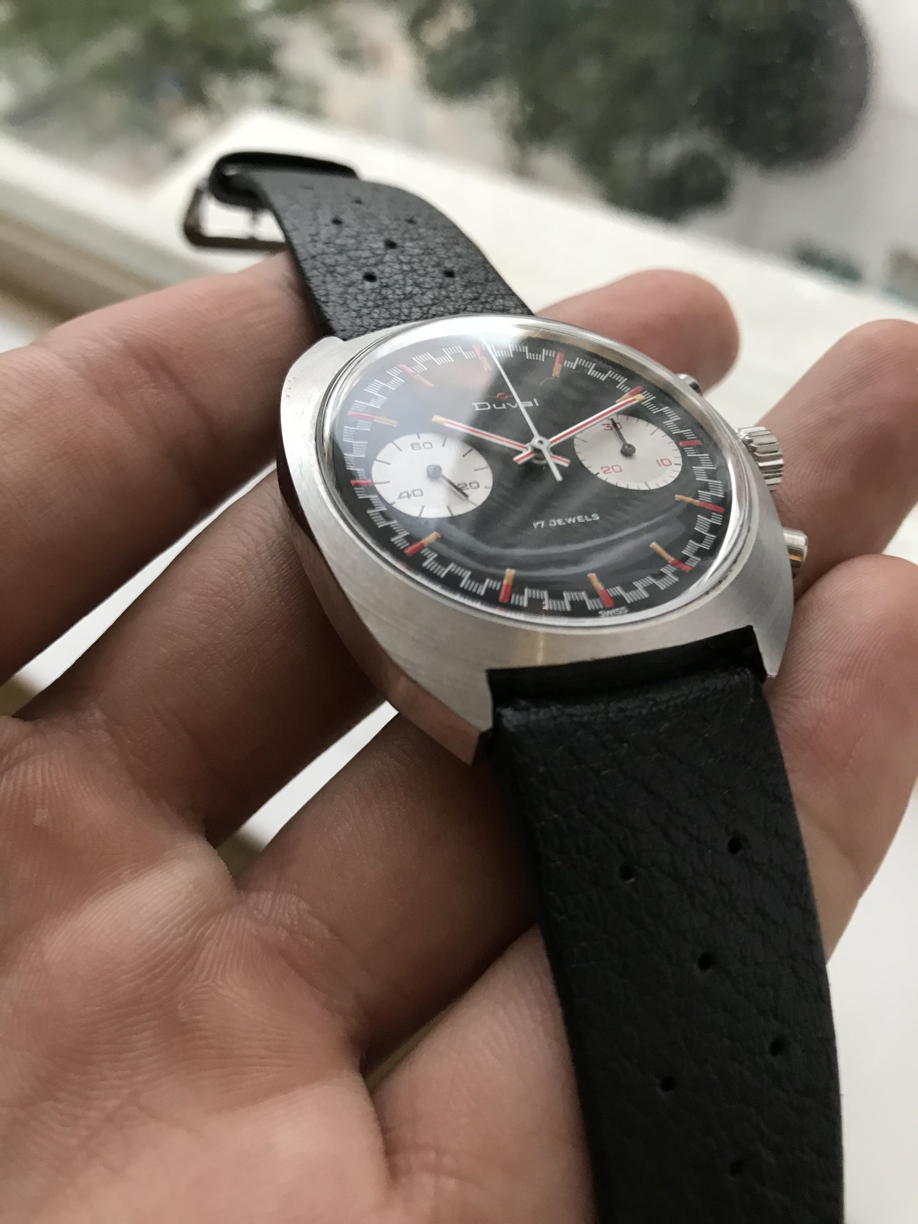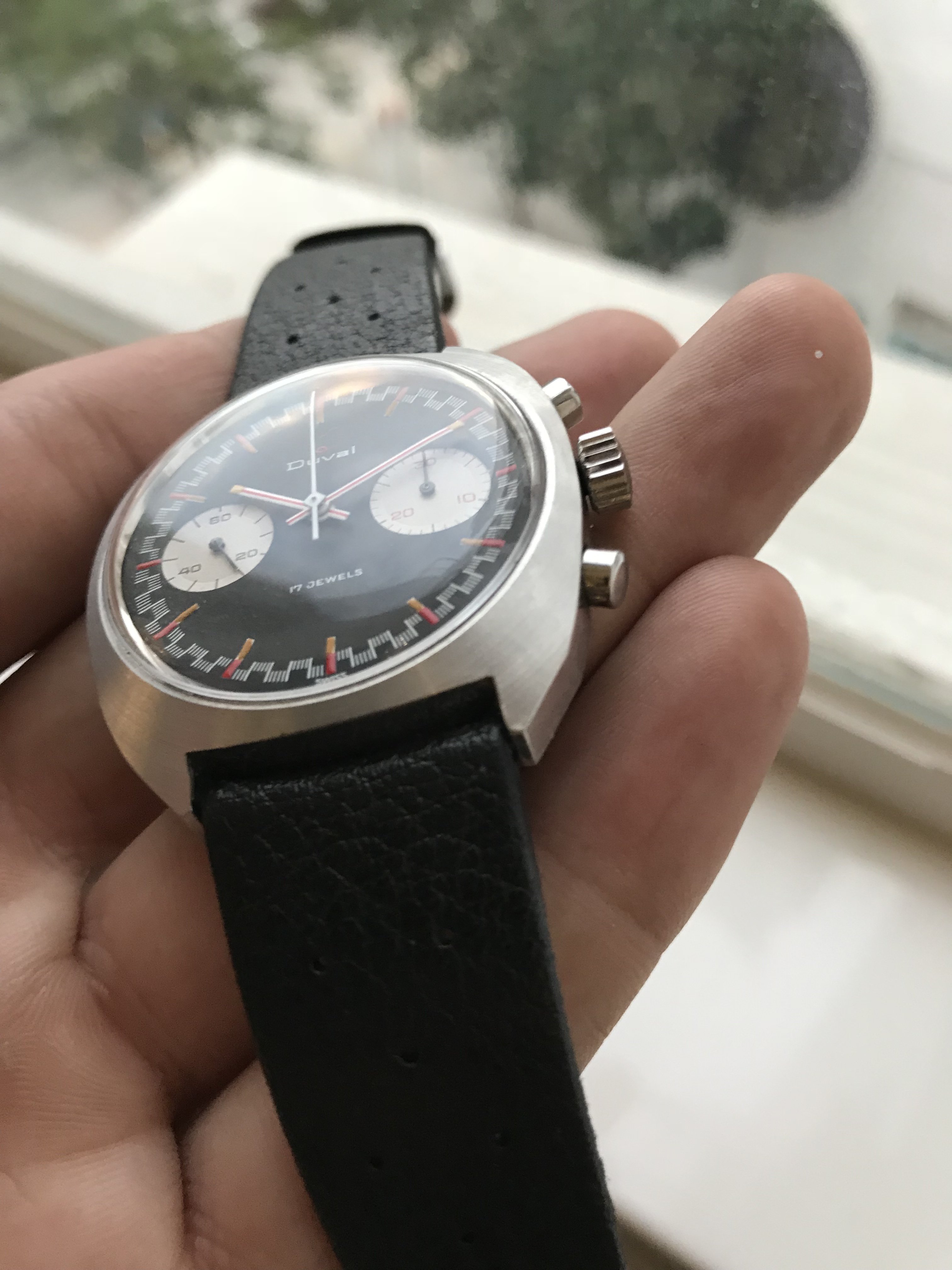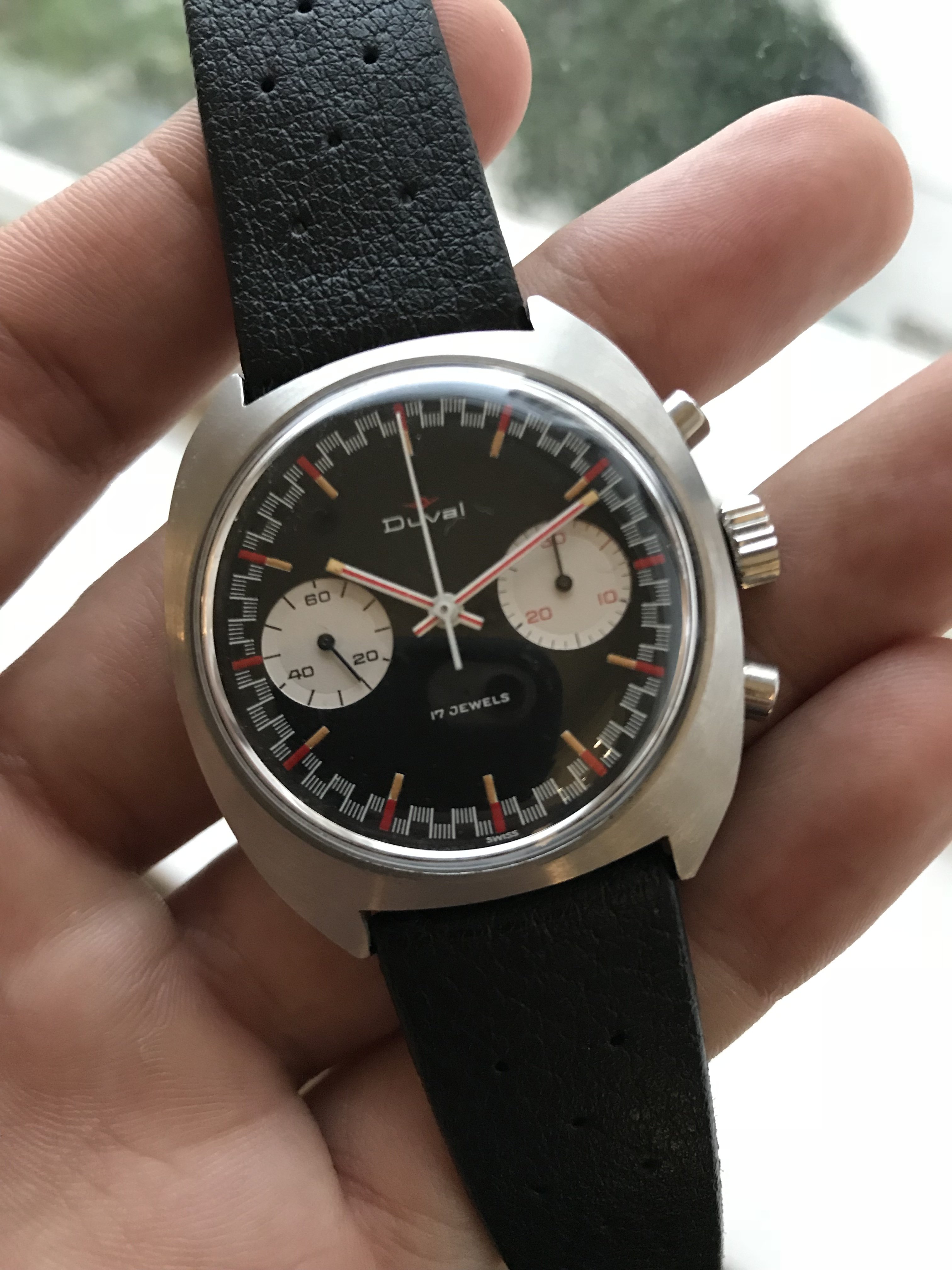 Up for sale is a pretty cool watch. It’s a vintage Duval chronograph with a racing dial. I bought this watch solely for the dial which has striking similarities to the old racing dial Speedmasters of the late 1960s. I haven’t seen many of these around so it seems to be a pretty uncommon watch. I have 2 new incomings the past few weeks I need to free up some cash for so not looking for trades at this time.