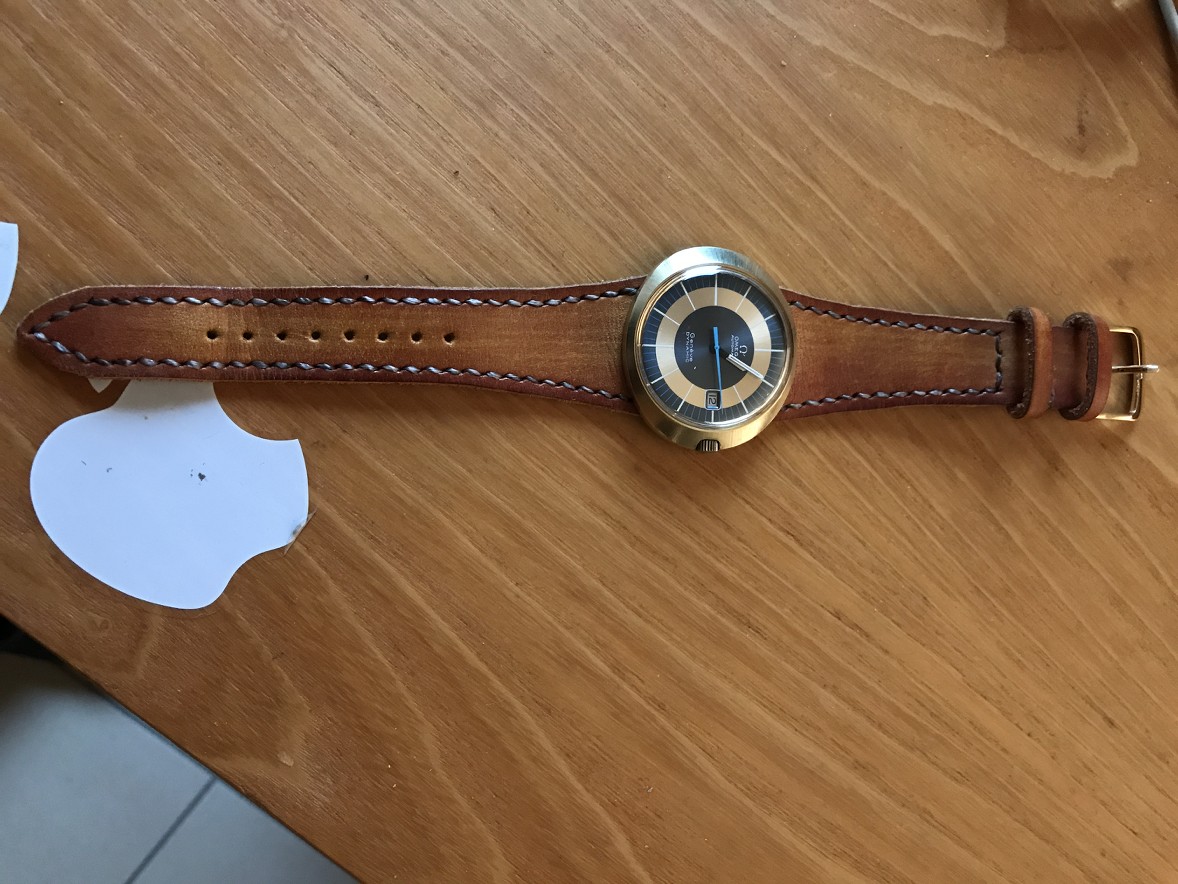 I I rapidly changed the Corfam for a leather custom made strap from Martu.