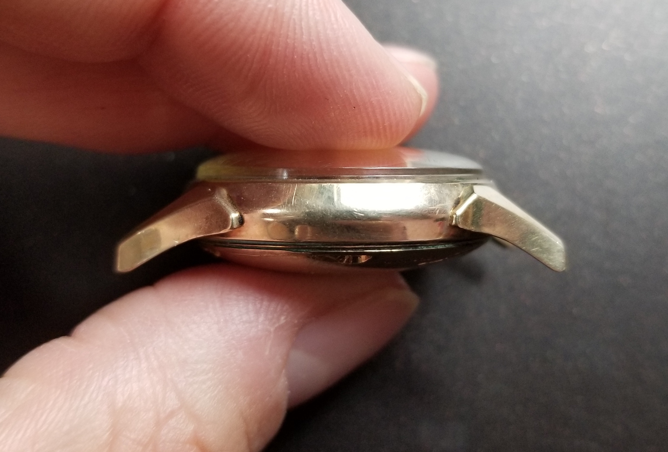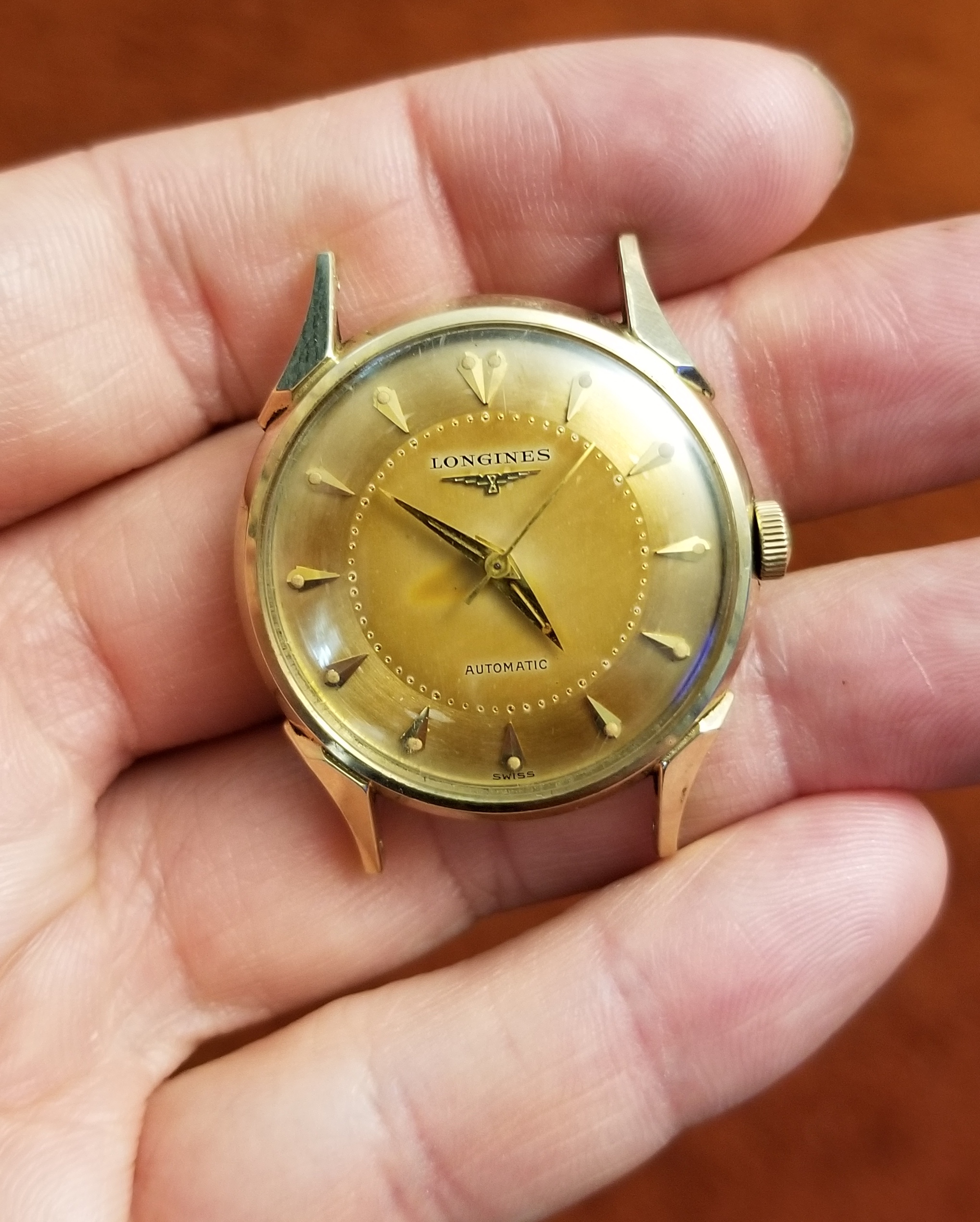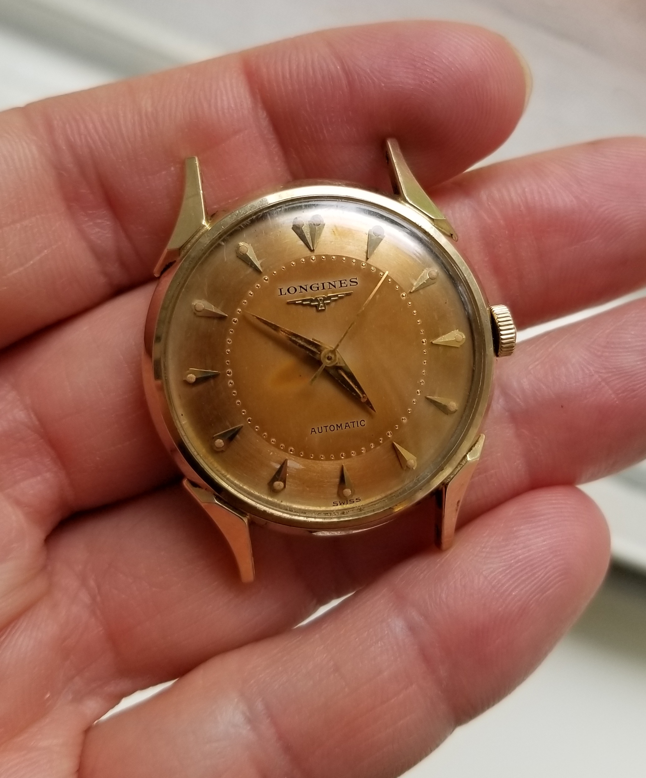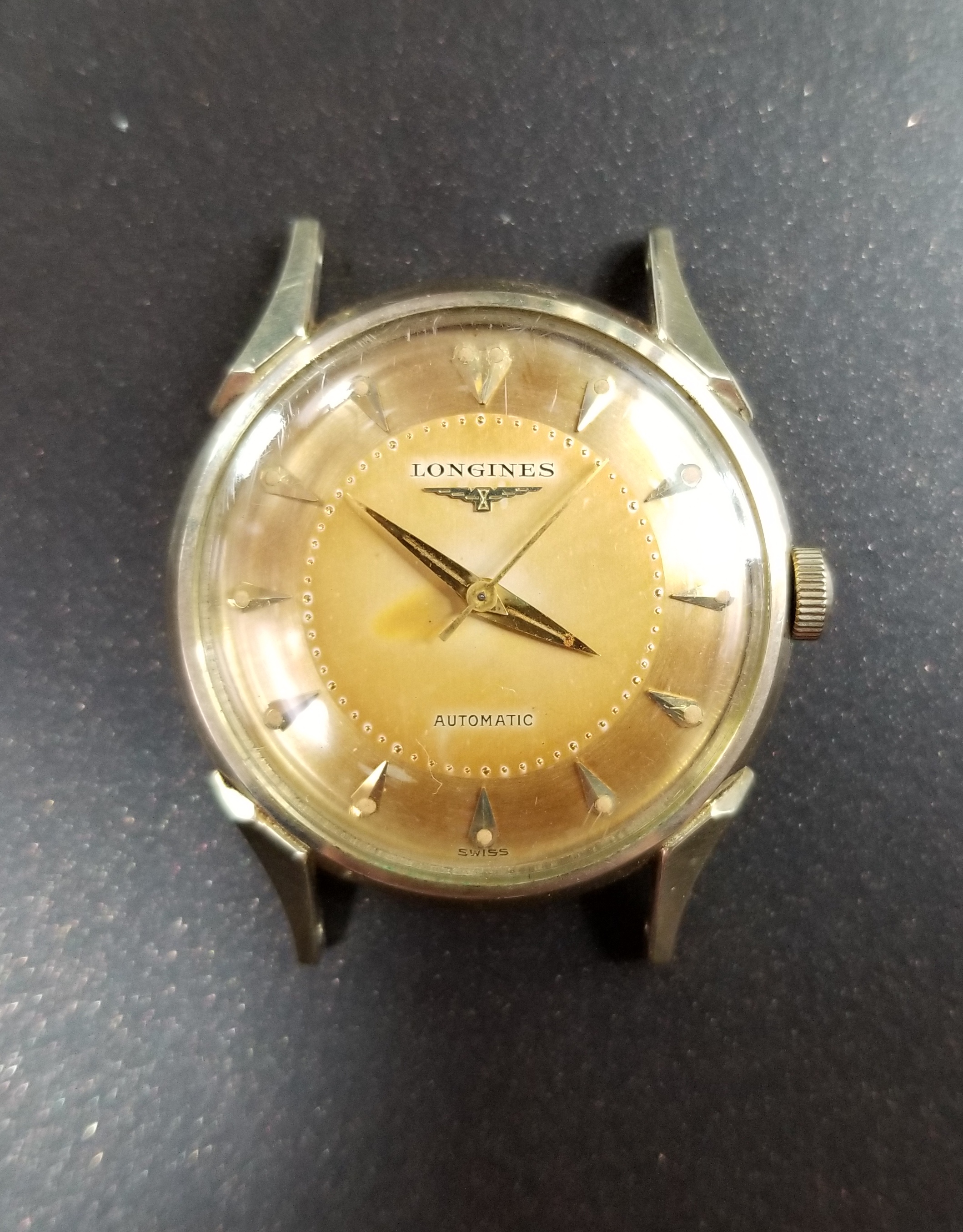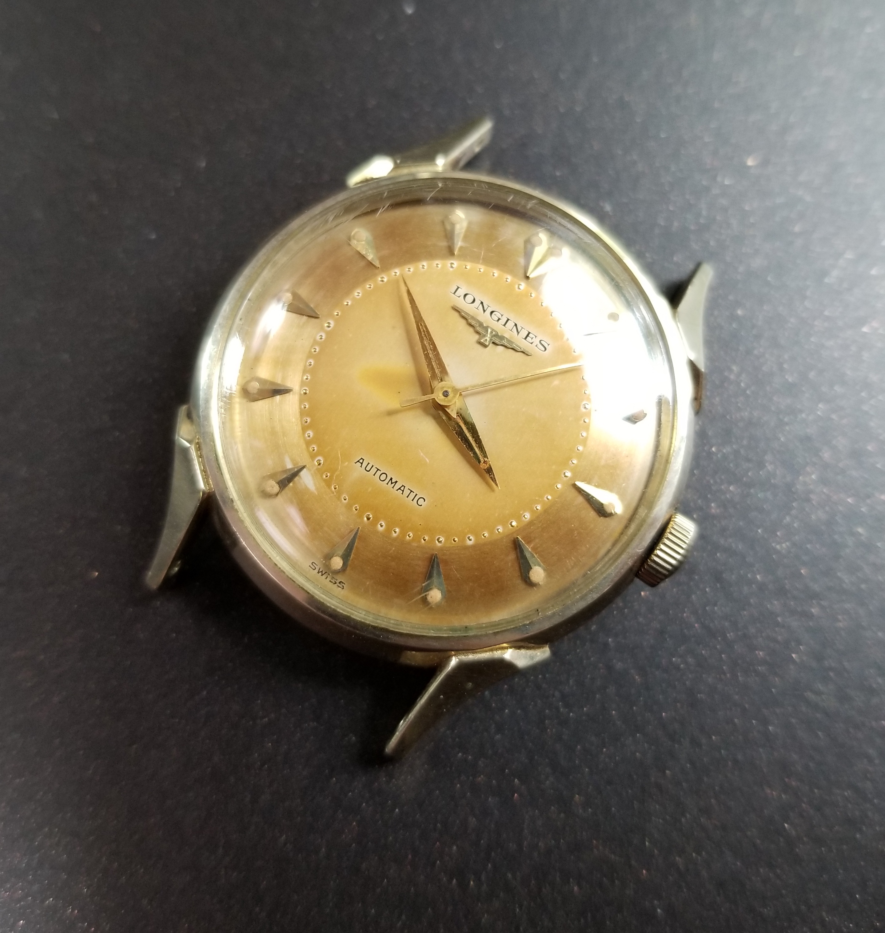 For sale is a pretty Longines watch with 19AS automatic movement. The case is 10K gold filled and unpolished. The case is 33mm and around 40mm lug to lug. All the original radium is present on hands and dial. There is some radium burn-in at around 8-9 oclock as seen in the photos.