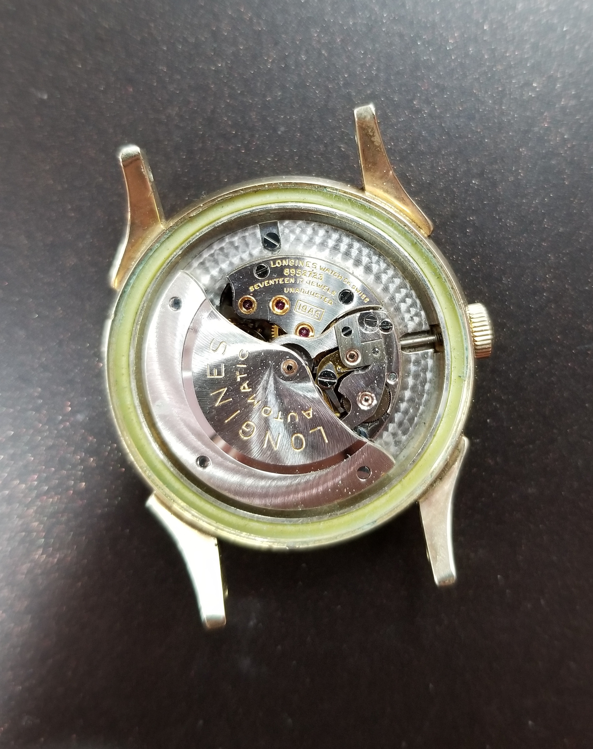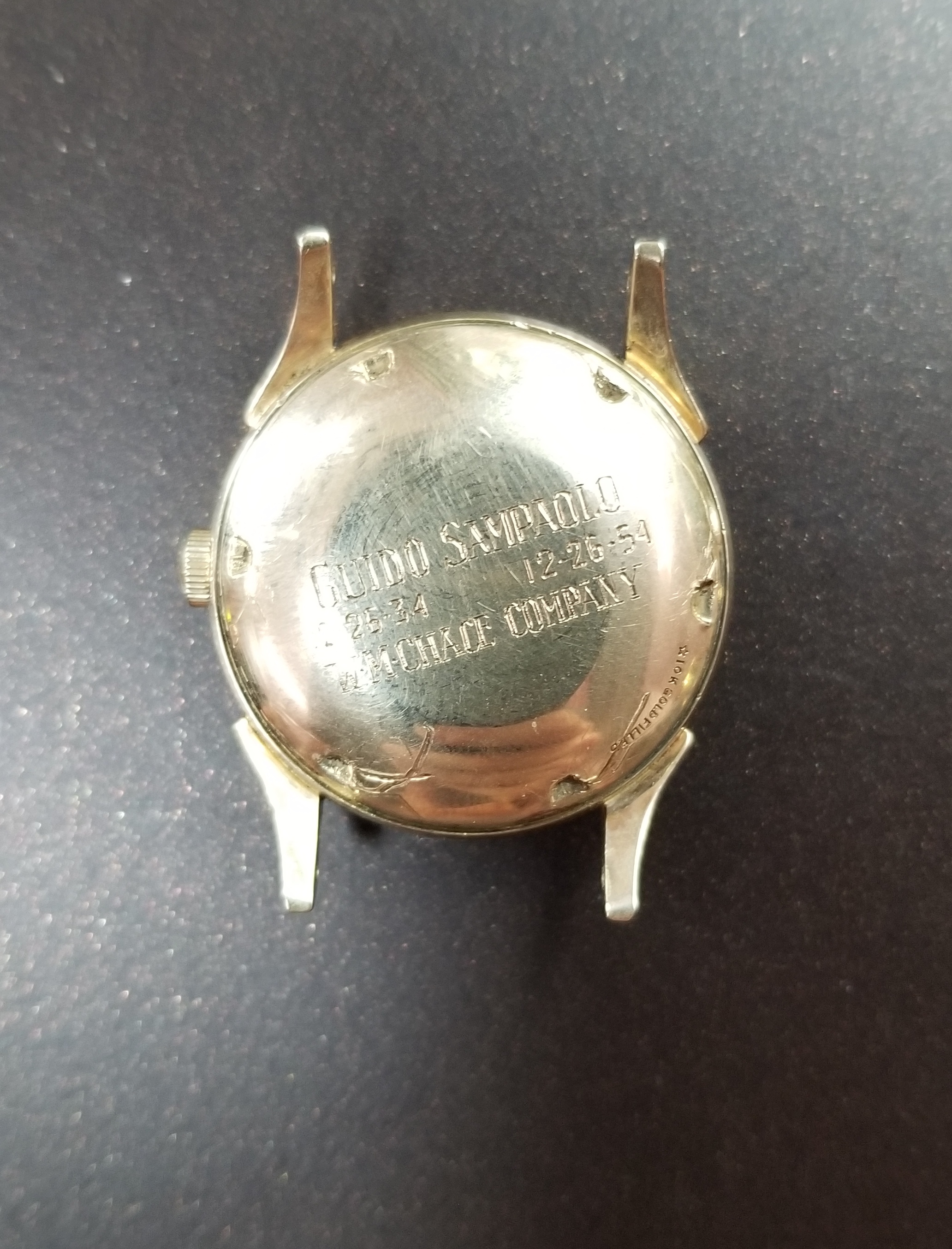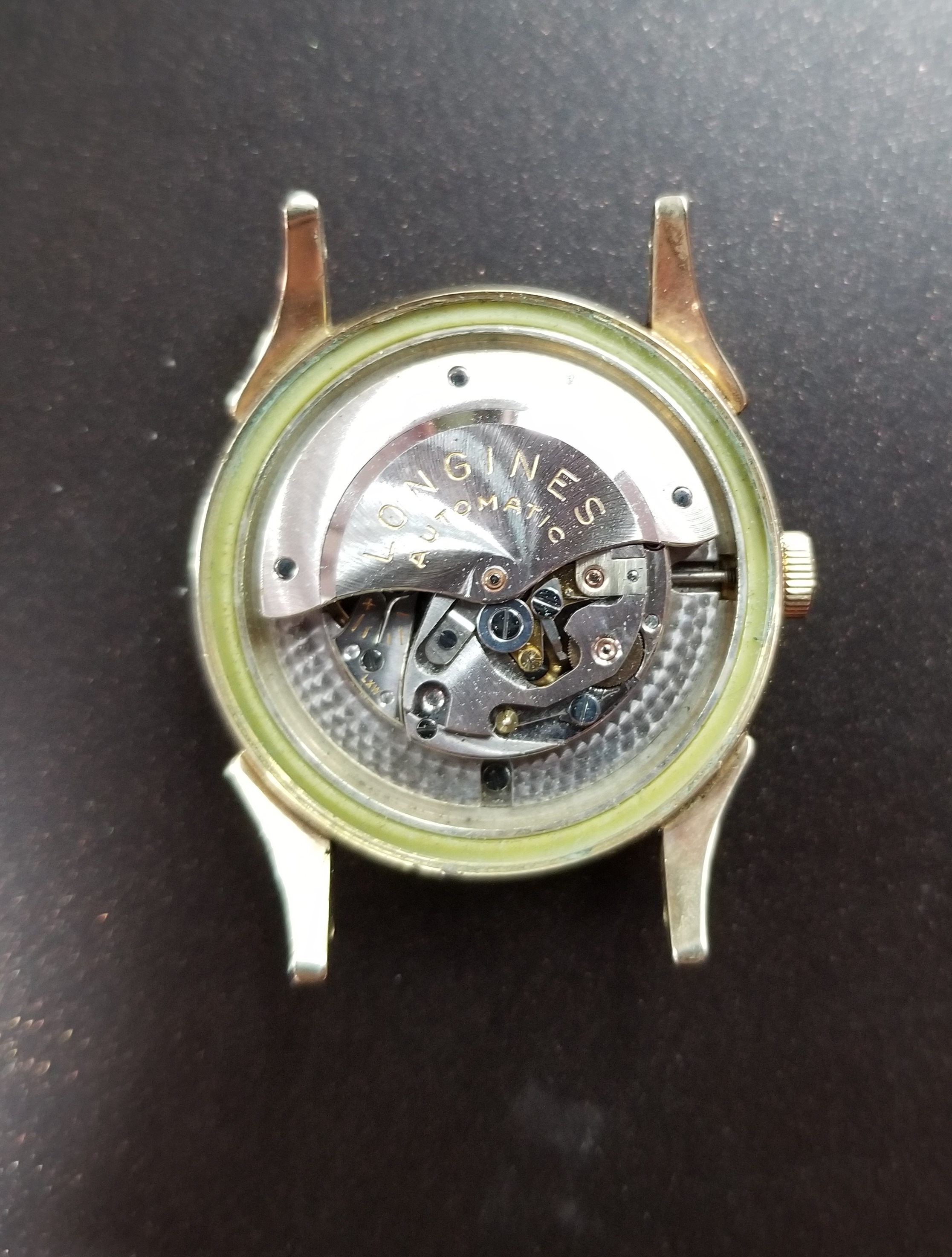 The back has an inscription and several scratches from prior opening attempts. The movement looks clean but the watch is not running. The rotor spins, it winds manually, and the hands set. I was planning to get it running but I have a lot of other projects going on. The watch is being sold as a project watch, as-is for these reasons.