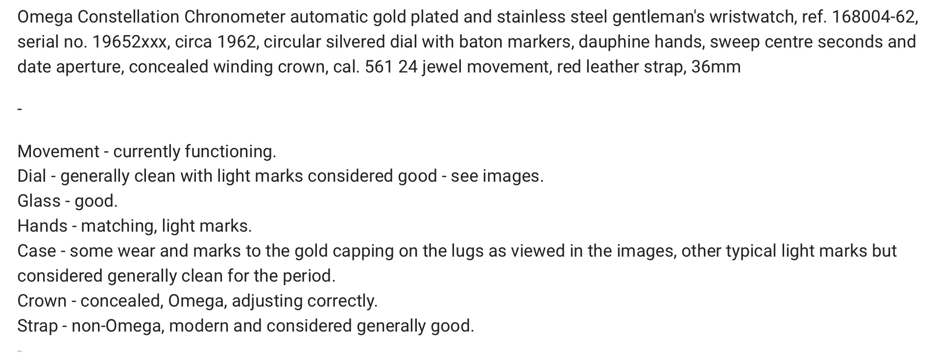 The 168.004 was first produced in 1962 - so, note how the case back shows the new style case reference plus the -62 date designation, showing it to be a transitional piece on the cusp of change ( IIRC this date coding was dropped after the full change over to the new case reference system. )