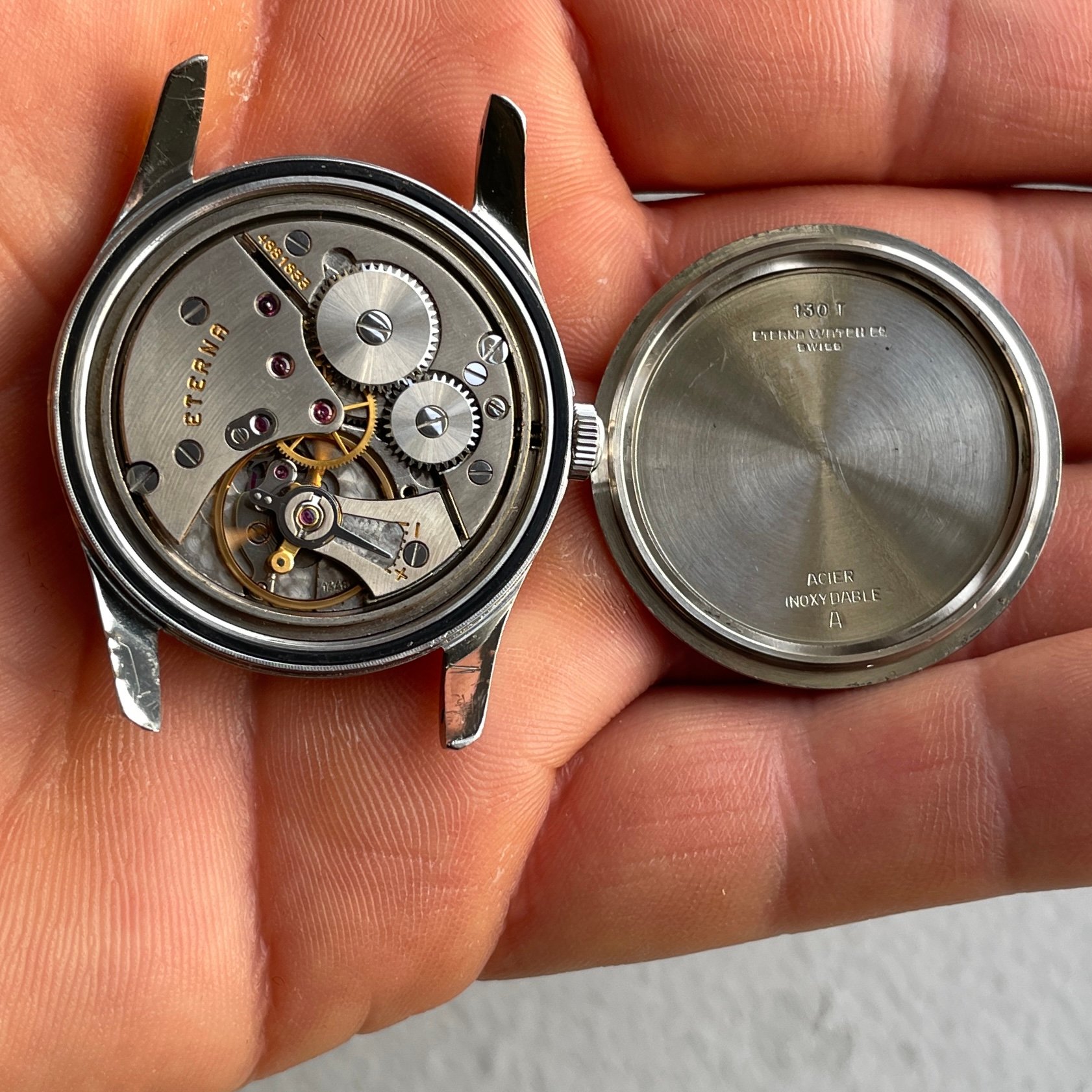 Sunburst dial in perfect preserved condition except some small marks under the Eterna text that can be seen under loupe or at macro photos. Beautiful aged lume matching the hands and Eterna signed glass.
