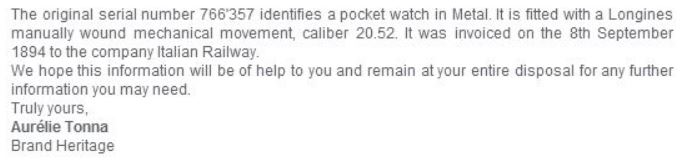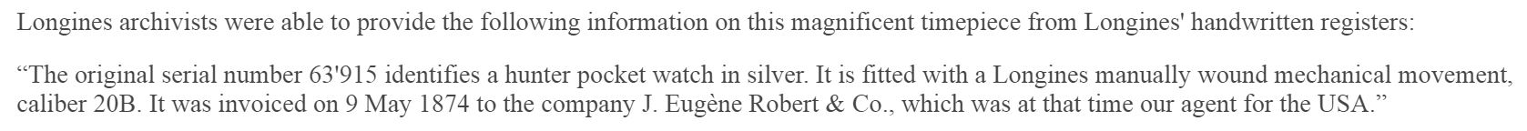 When I received the information above from Longines' Heritage Department, I was taken aback. Everything seemed to fit except for the year of the original invoice. Below is an admittedly small sample of similar Longines from the period (I have many more on file). Their serial numbers and corresponding invoice years are as follows: 63'915 and 1874, 72'935 and 1874, 98'349 and 1878 (source: Longines' Heritage Department). As is evident, a serial number of 45'084 and an invoice year of 1894 is unexpected.