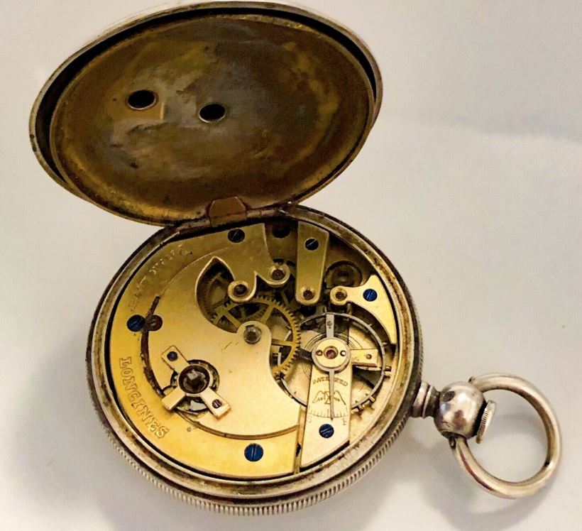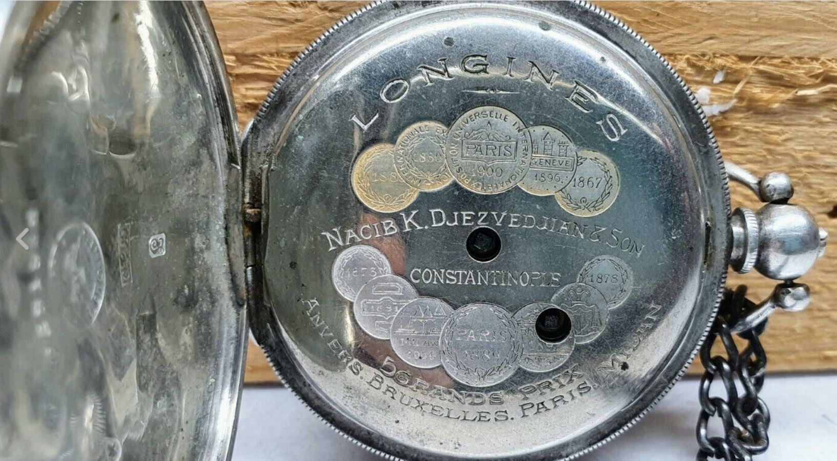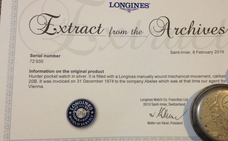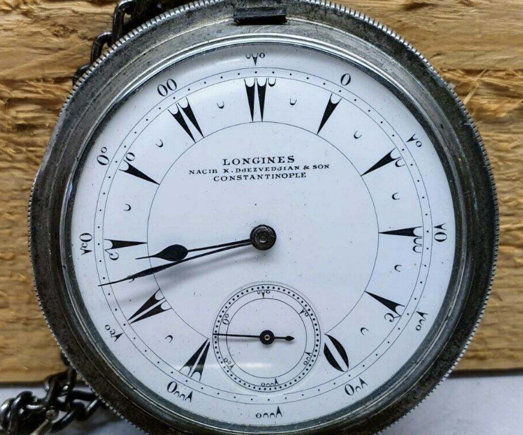 Serial number 45'084 identifies a silver hunter case that houses a caliber 20B, and was originally invoiced to Berlin, Germany on April 17, 1894 (source: Longines' Heritage Department). This watch came from Florida in 2020.