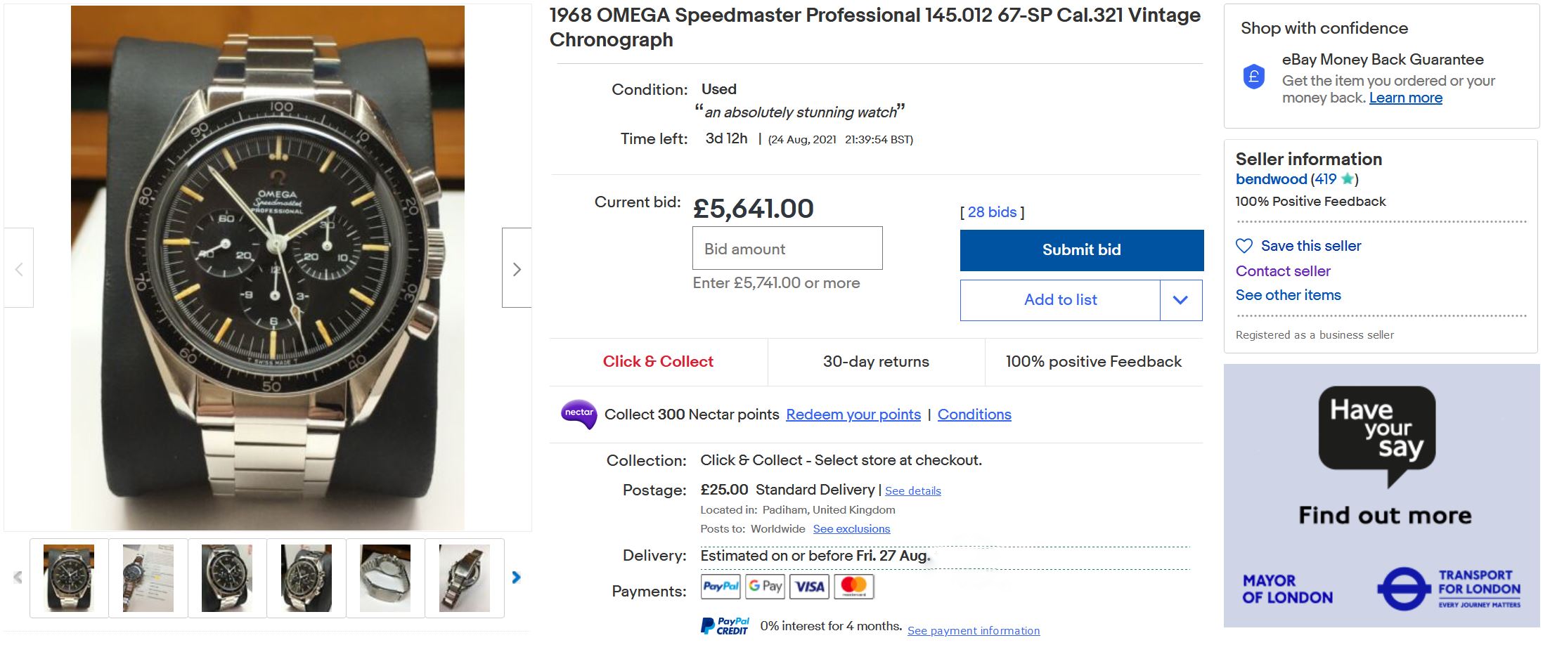 Ebay in August is a funny place, sometimes there is not the competition for things as in other months. This watch was bid by 13 bidders to just under £3000, and then suddenly a big bid of £5,400 came, then it was withdrawn.