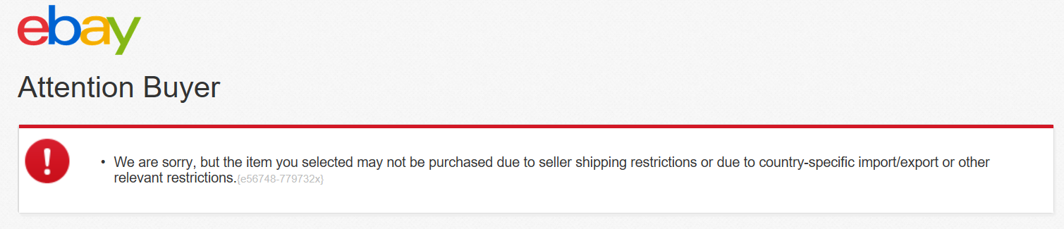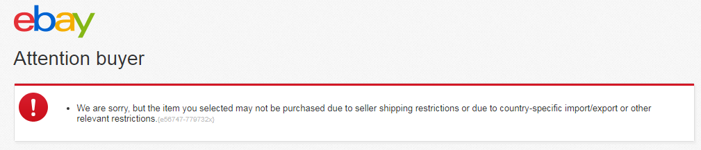 After a careful investigation, I trust that you got this error message “We are sorry, but the item you selected may not be purchased due to seller shipping restrictions or due to country-specific import/export or other relevant restrictions.”