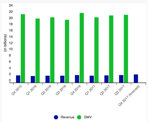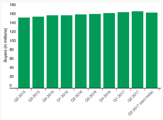 Here’s a look at the company’s active buyer numbers. Note that the most recent number excludes domestic active buyers in India following its sale of its India business to Flipkart: