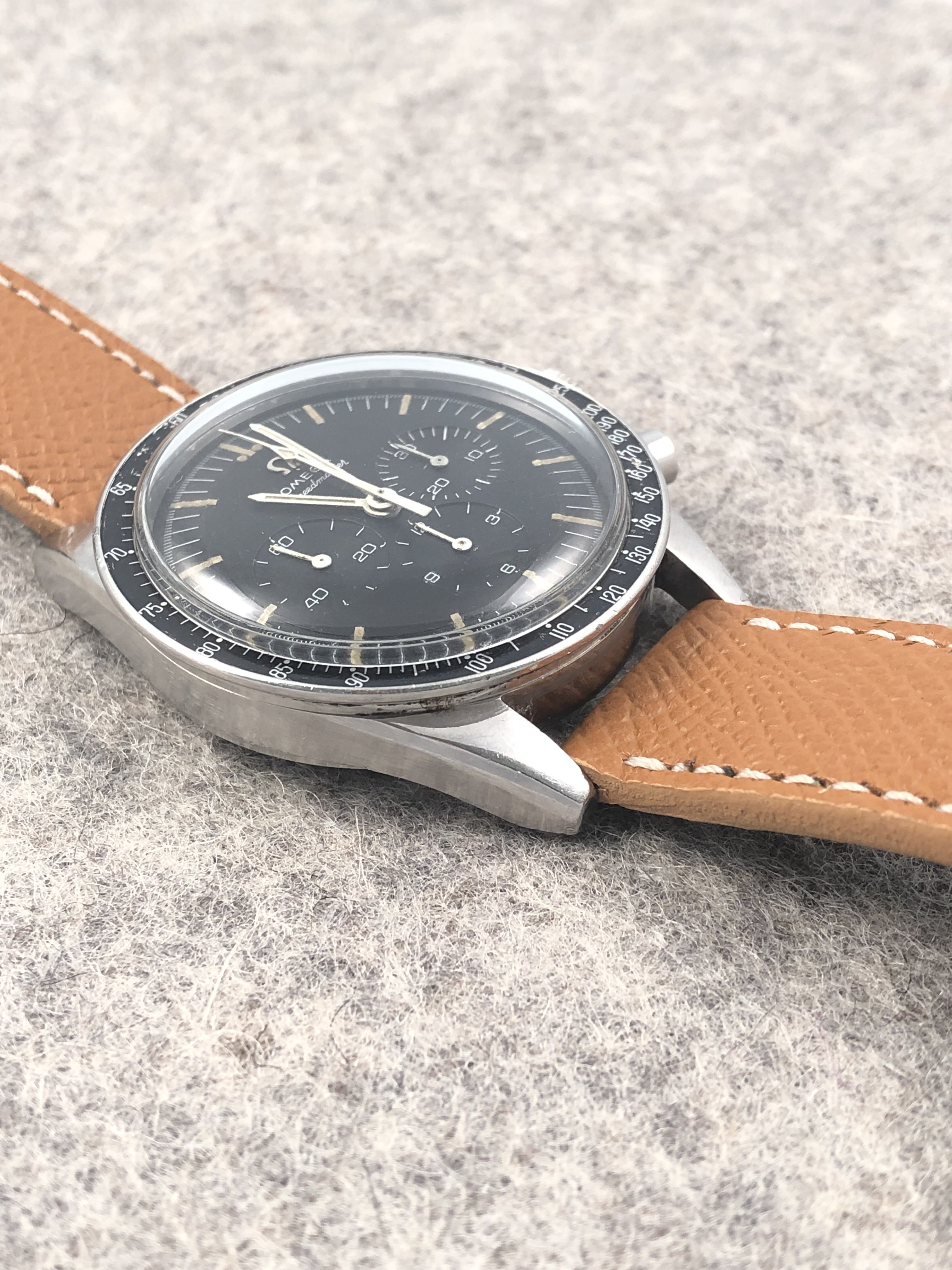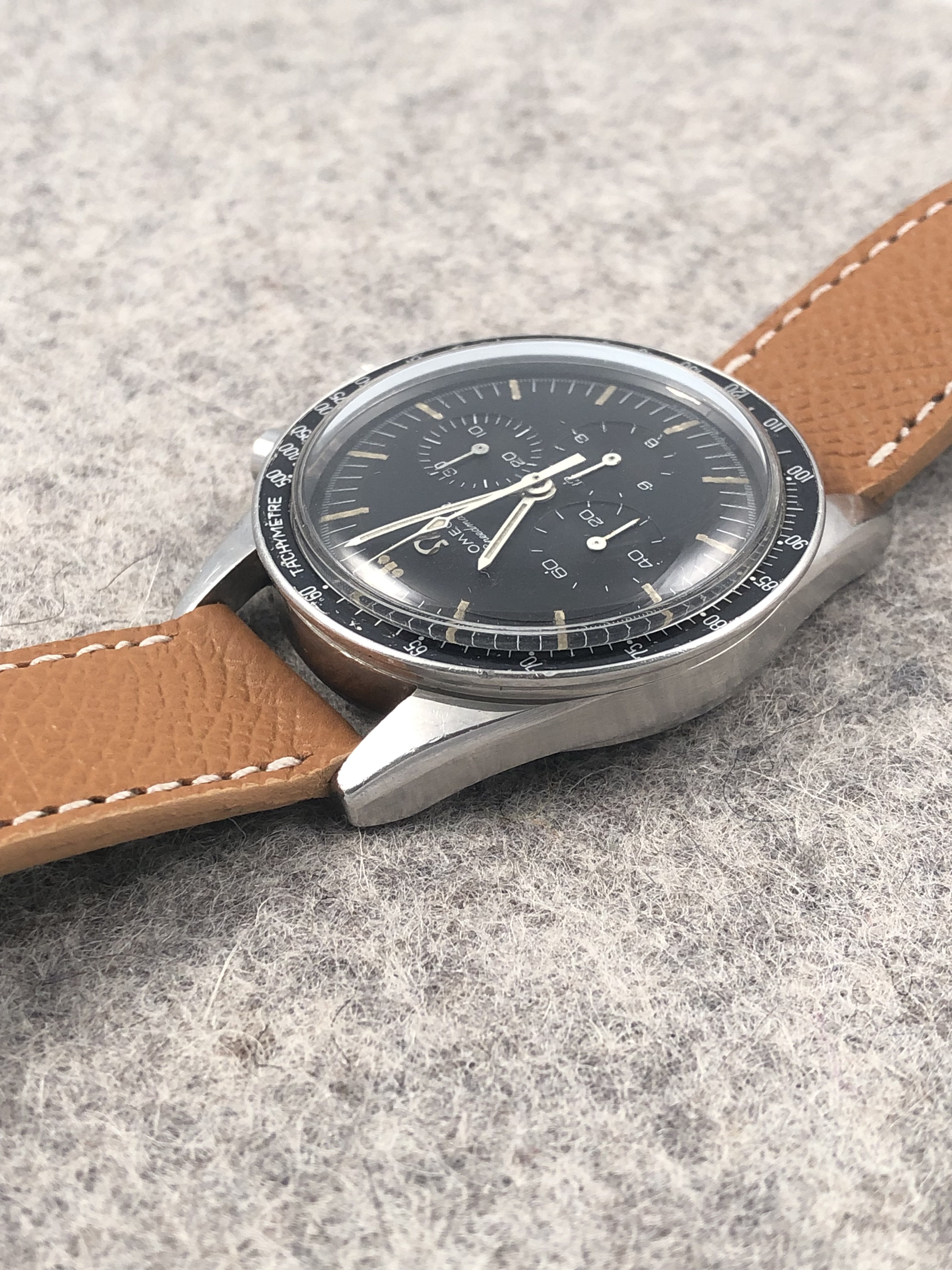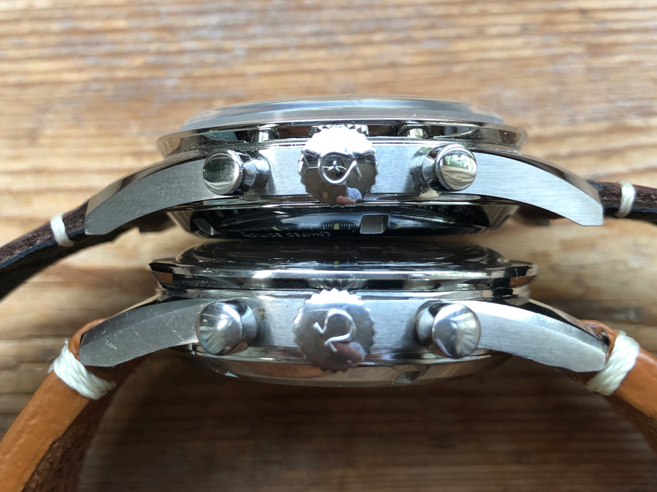 Managed to grab a few quick comparison shots between my -65 Echo Whiskey and the Trilogy Speedmaster. The modern watch is on the darker strap. The lugs are rather different, the modern ones deeper, and maybe thinner with a much more pronounced bevelled facet. The EW has bottom flats with a larger area. Now I can't guarantee my watch has exactly the profile it left the factory with (which of us can) but it hasn't been obviously refinished and it looks pretty straight in other respects.