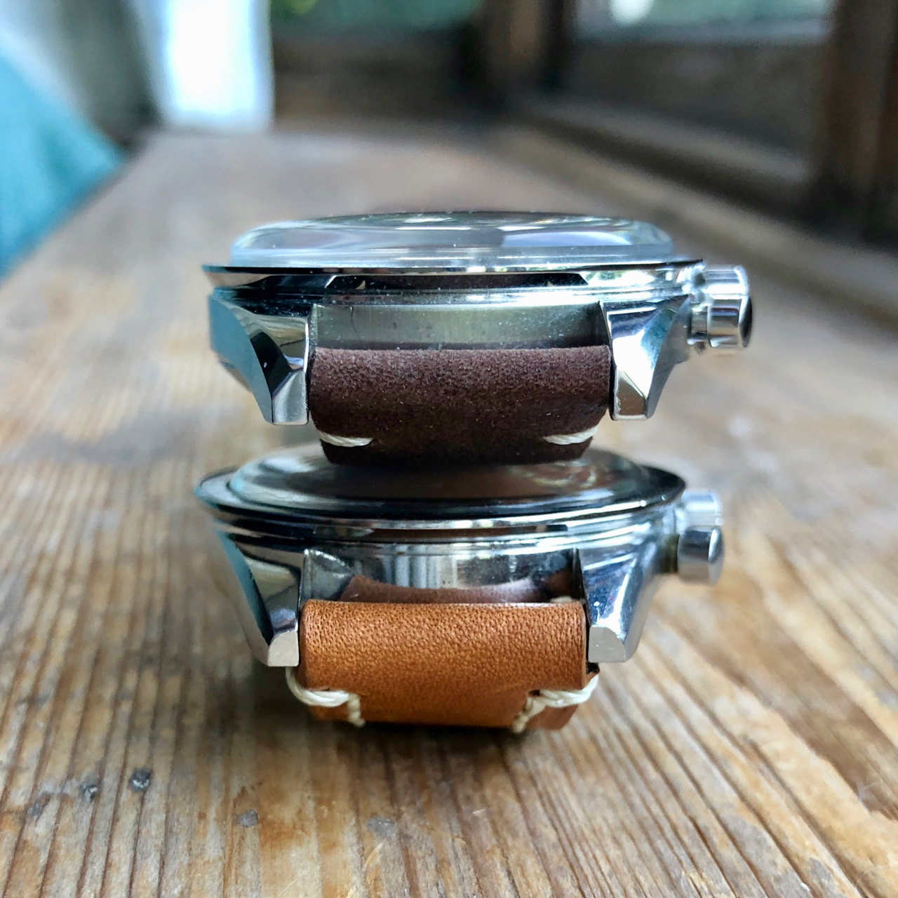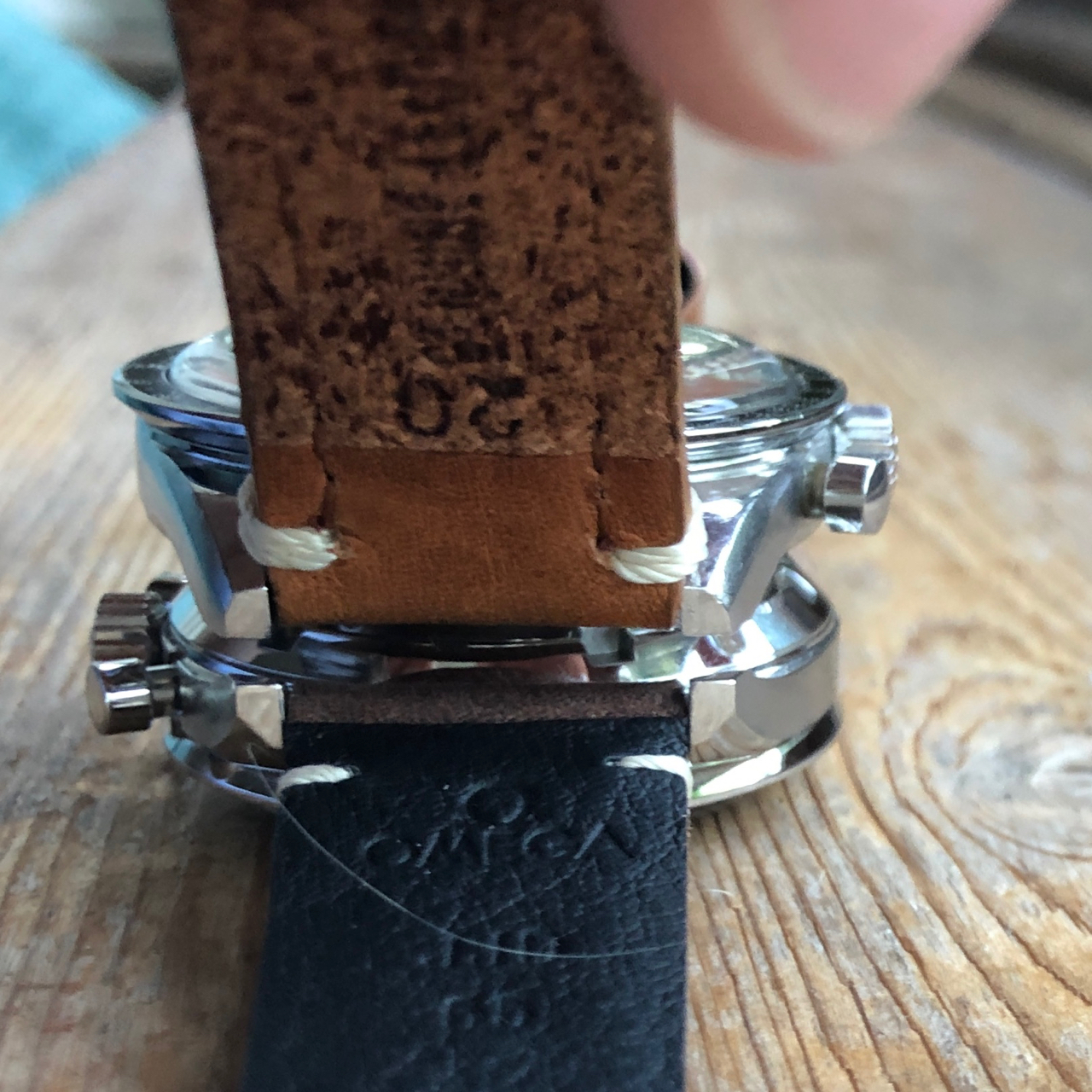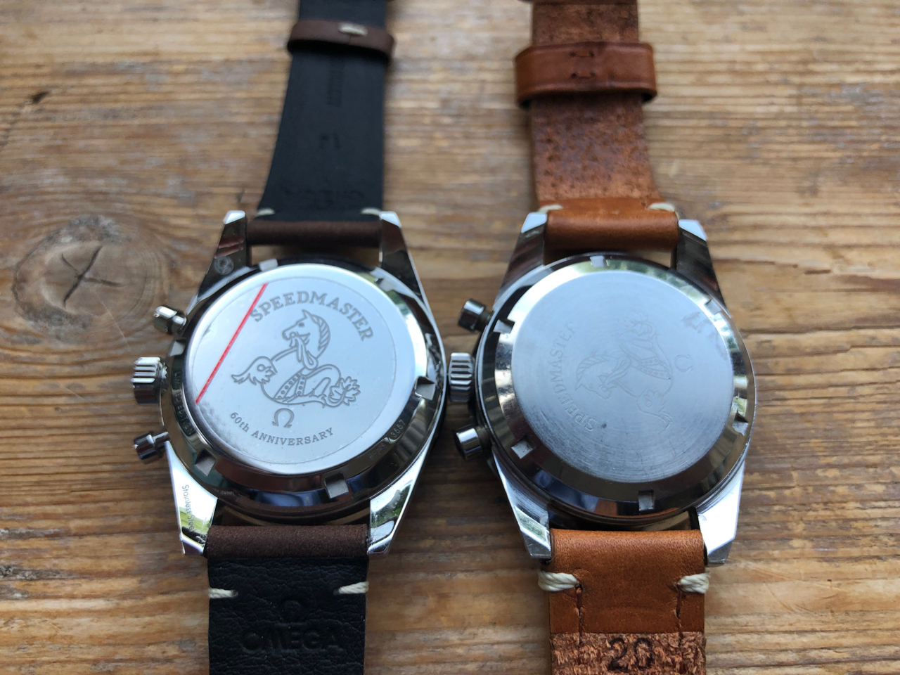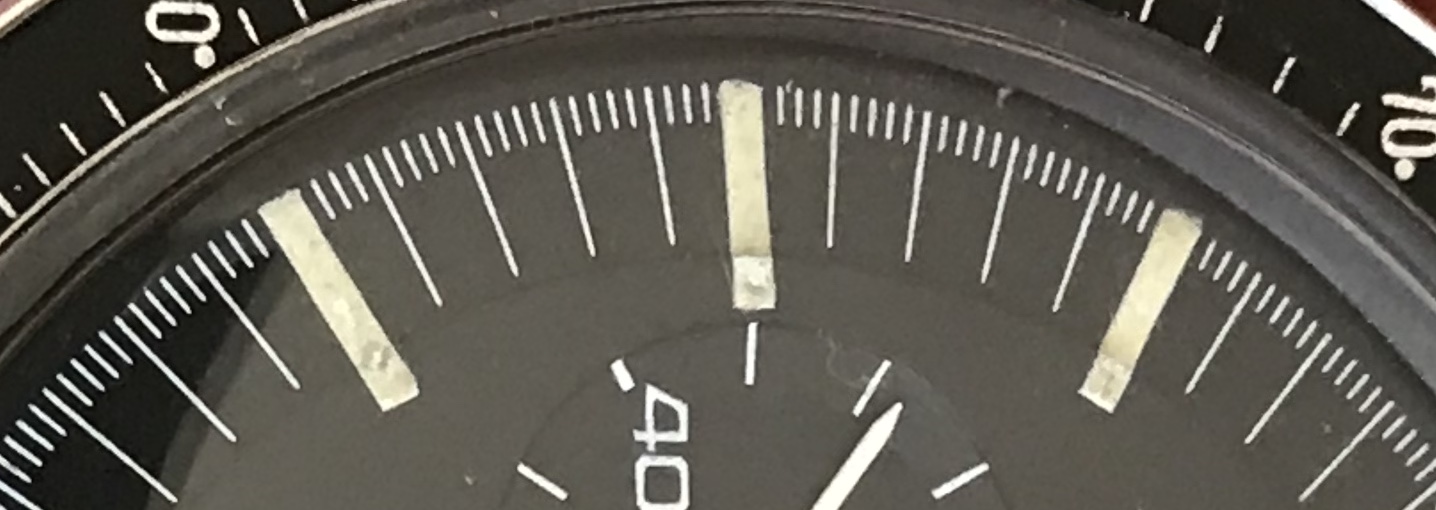 Managed to grab a few quick comparison shots between my -65 Echo Whiskey and the Trilogy Speedmaster. The modern watch is on the darker strap. The lugs are rather different, the modern ones deeper, and maybe thinner with a much more pronounced bevelled facet. The EW has bottom flats with a larger area. Now I can't guarantee my watch has exactly the profile it left the factory with (which of us can) but it hasn't been obviously refinished and it looks pretty straight in other respects.
