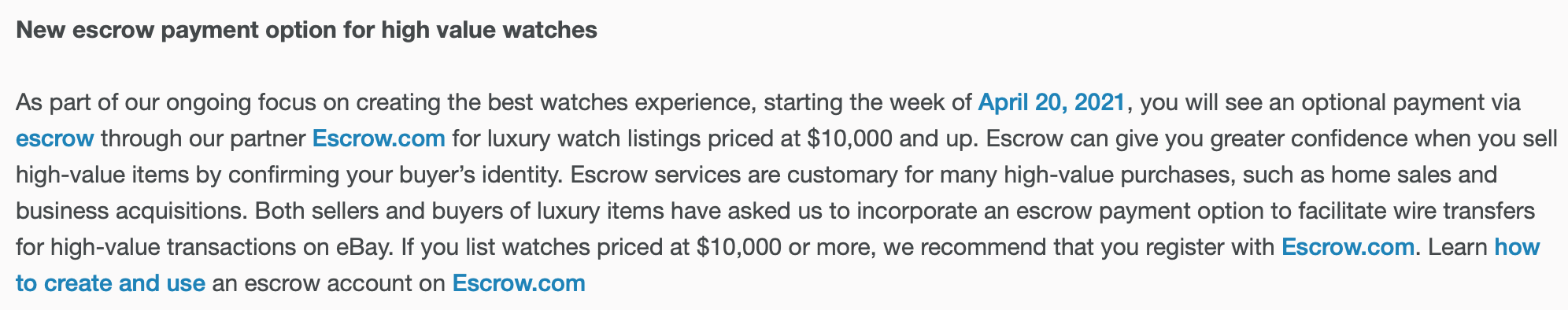 As part of our ongoing focus on creating the best watches experience, starting the week of April 20, 2021, you will see an optional payment via escrow through our partner Escrow.com for luxury watch listings priced at $10,000 and up. Escrow can give you greater confidence when you sell high-value items by confirming your buyer’s identity. Escrow services are customary for many high-value purchases, such as home sales and business acquisitions. Both sellers and buyers of luxury items have asked us to incorporate an escrow payment option to facilitate wire transfers for high-value transactions on eBay. If you list watches priced at $10,000 or more, we recommend that you register with Escrow.com. Learn how to create and use an escrow account on Escrow.com