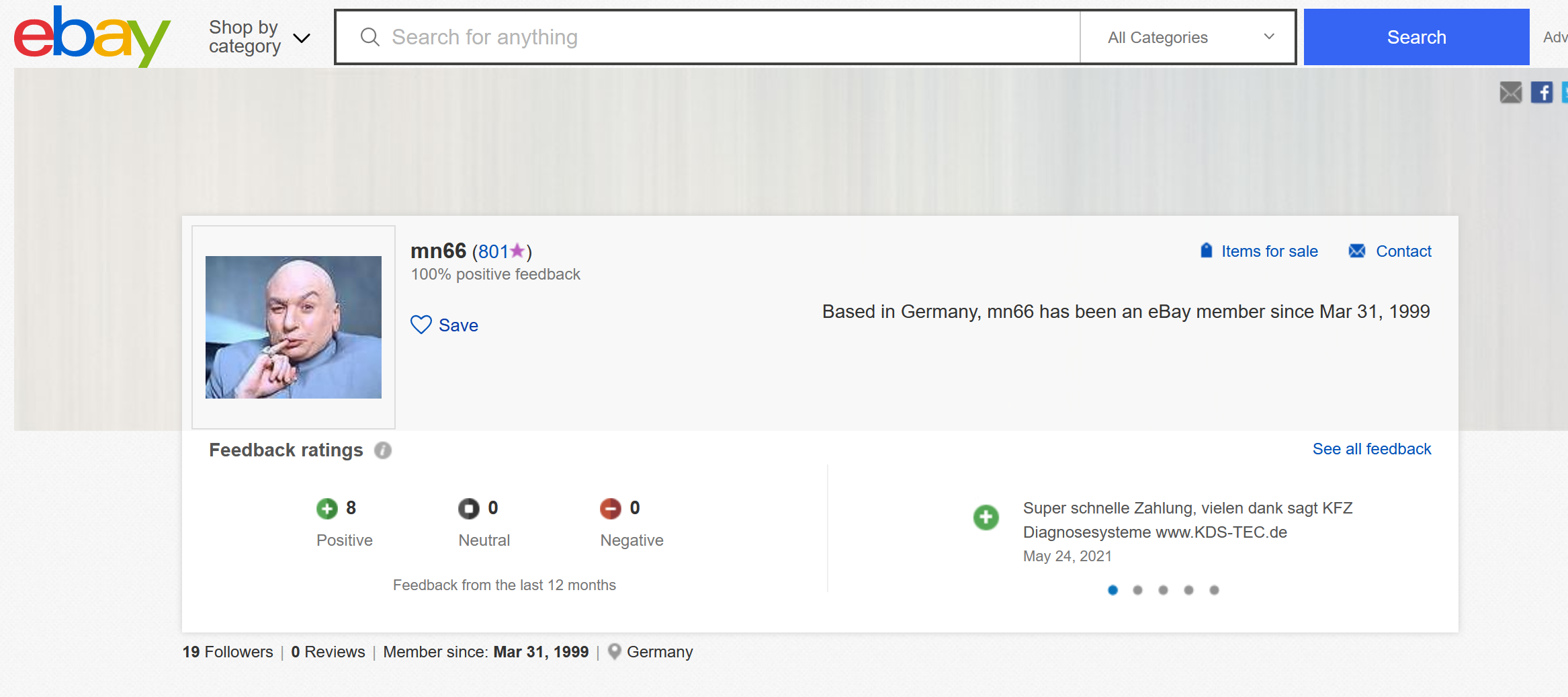 Lets check out the seller - He is listed as being active since 1999 in Europe. Looks like a hijacked account.