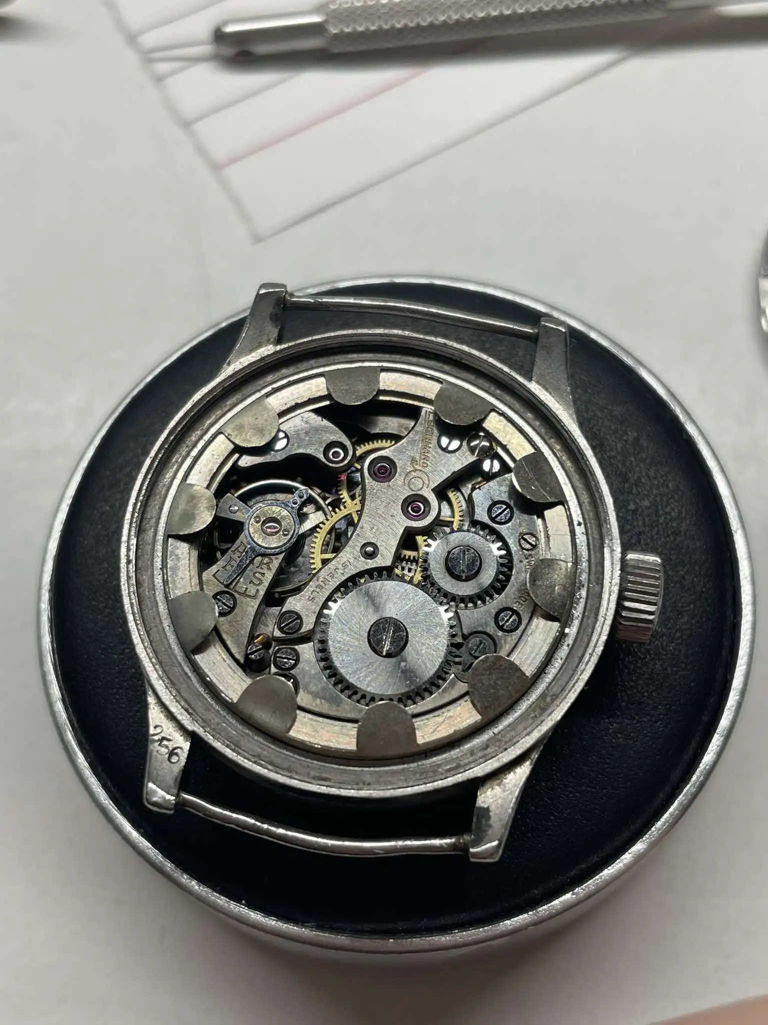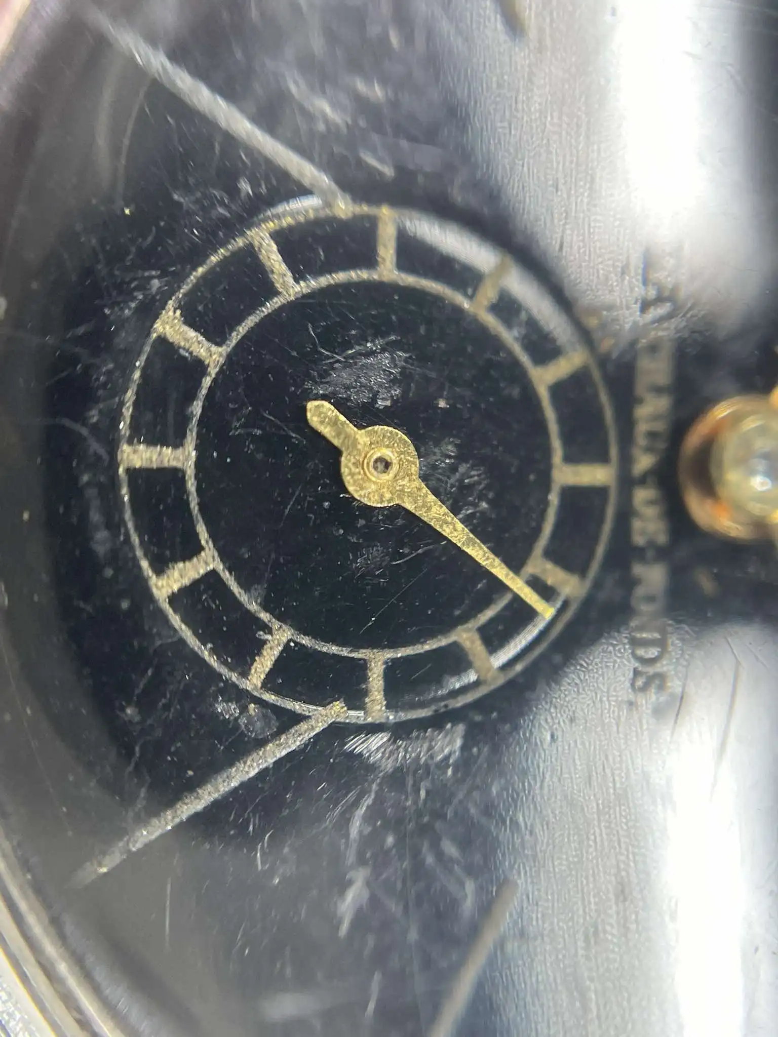 None of them, though, got gilt dial and it's configuration is also particularly special. What makes me very curious is though the contrast between rugged waterproof tre tacche case with diameter 32,5mm and dressy dial. Another major difference is the absence of luminous hands and incabloc - "Parechoc" all other examples known are equipped with.