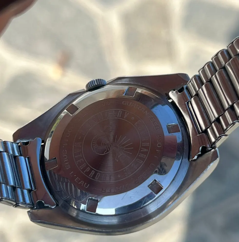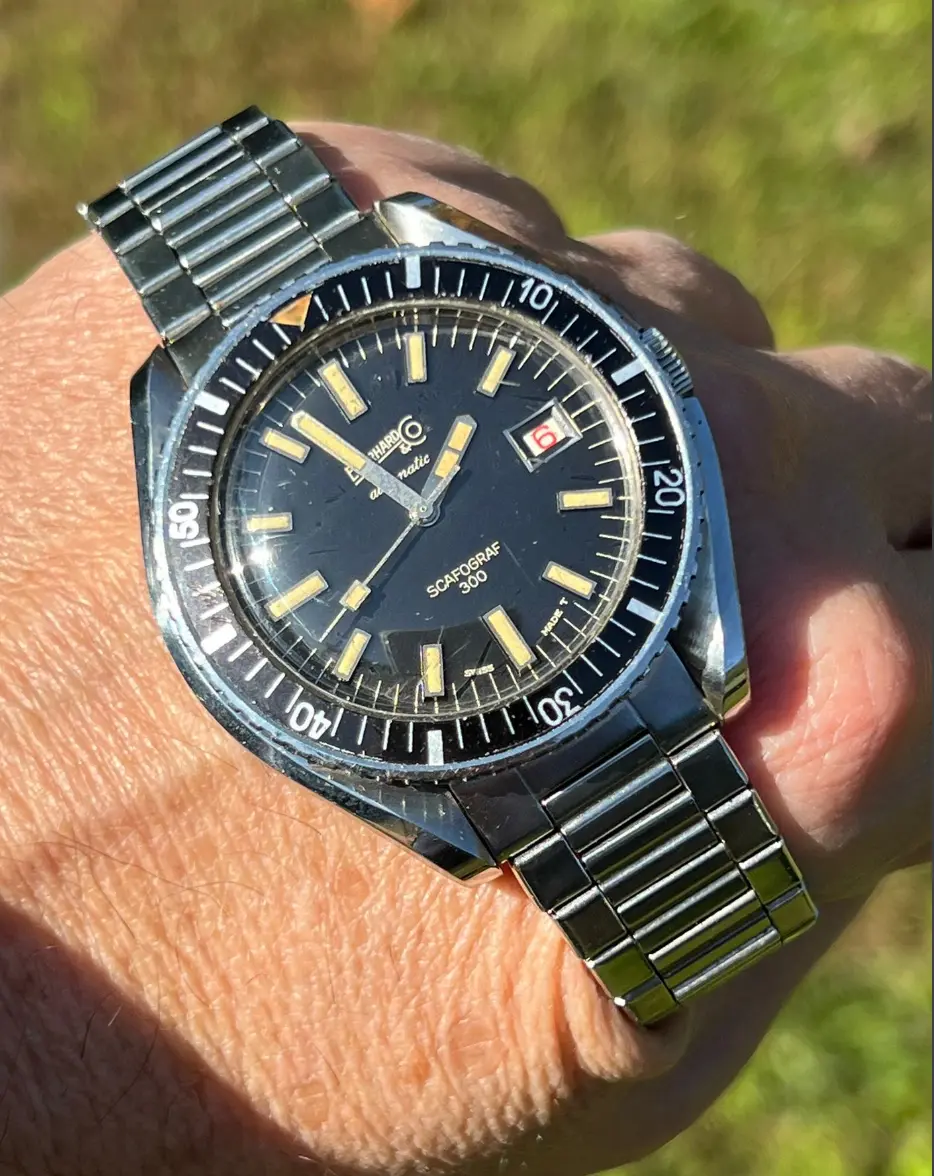 The third generation Scafograf 300 was introduced in 1964. The Scafograf 300 upped the water resistance to 300 meters, and increased the case size to 42 mm. The third iteration also streamlined the dial design. It was also the first Scafograf to be powered by a self-winding caliber.