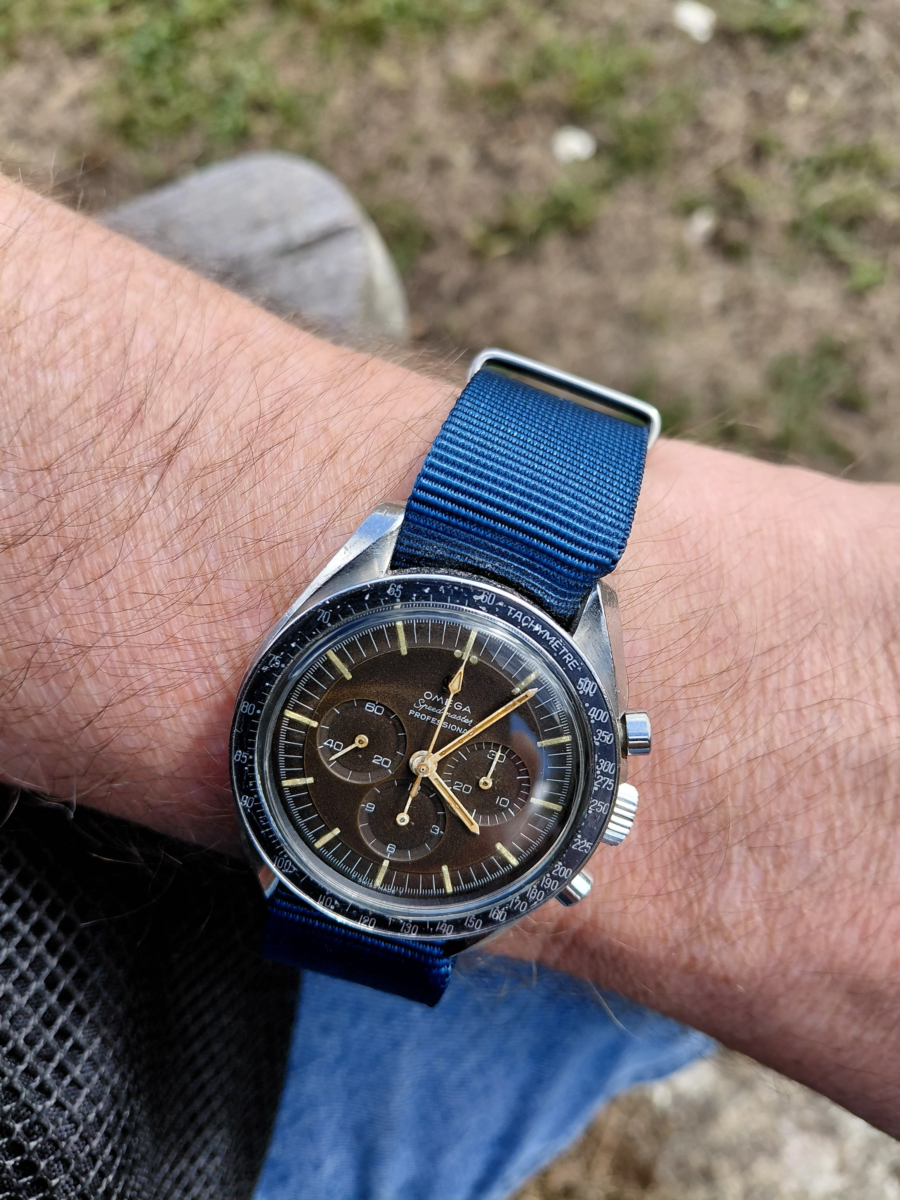 My Dad's old 105.012-65, changed from black to brown, but its fairly even across the dial. (Although, I did find a tiny bit of blue sky and fluffy cloud reflected this afternoon, on my way back from the pub. I suppose that's definitely environmental)