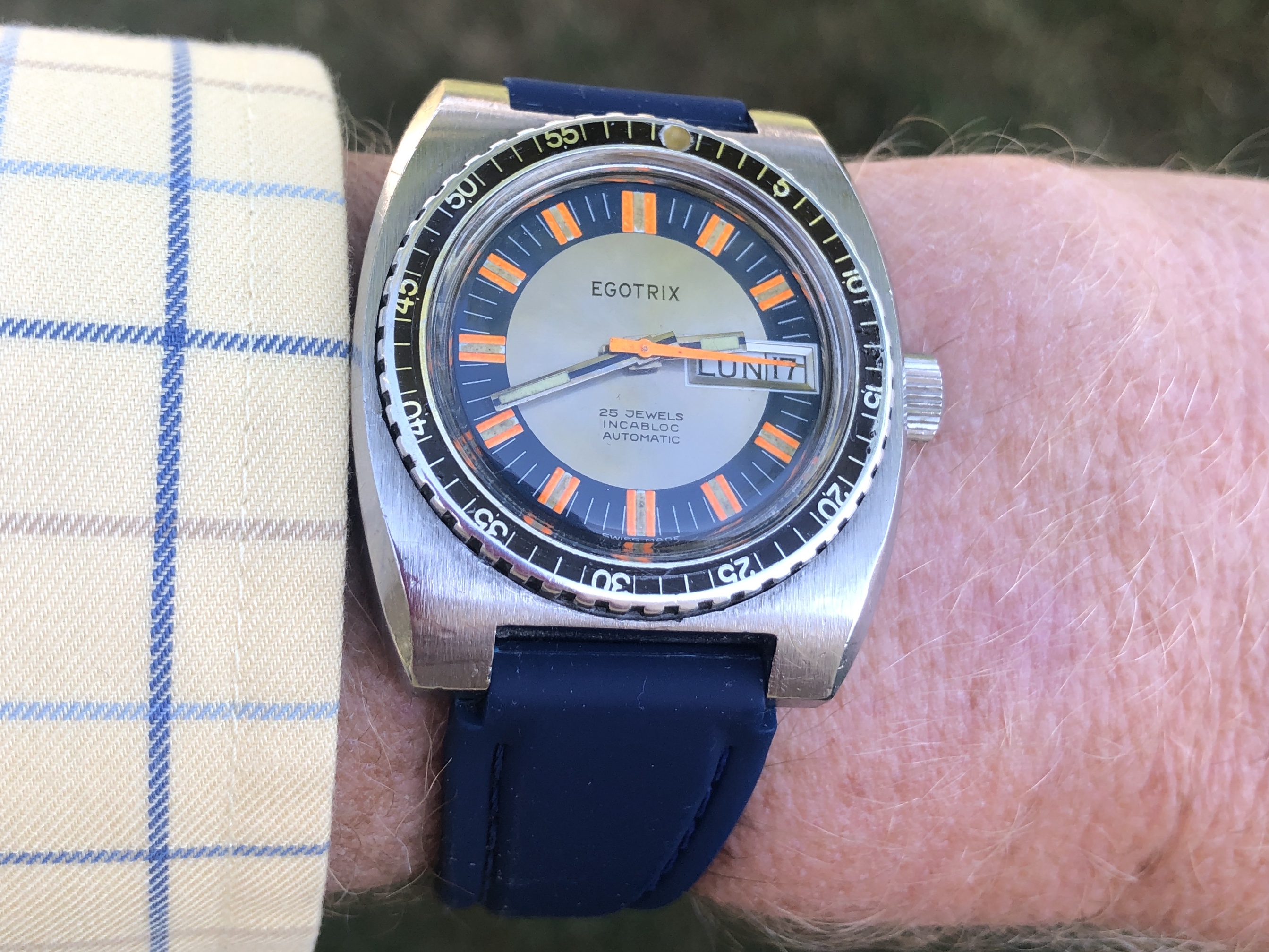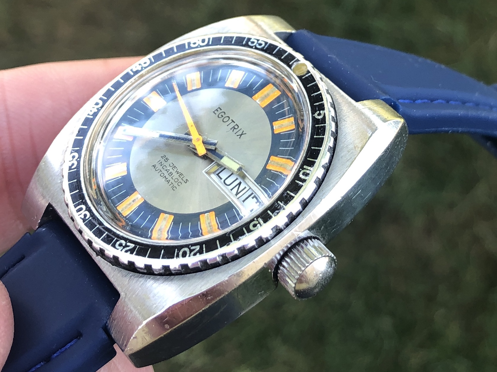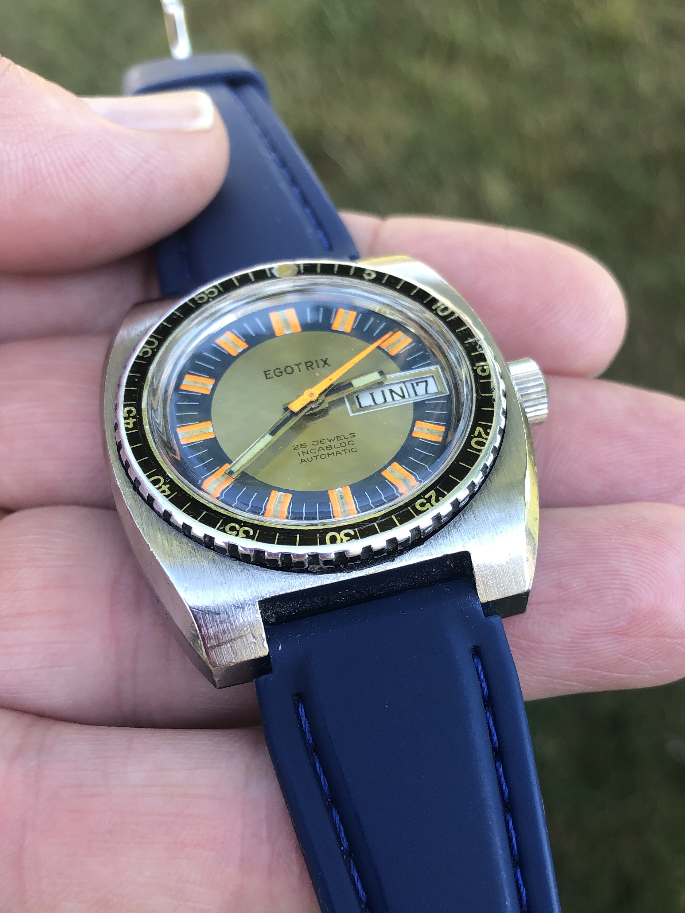 ·A nice vintage Egotrix diver from the late 60's or early 70's with a clean, colorful dial showing attractive patina on the lume. The lume plots on the dial and hands have all aged to a consistent, pleasing color and the orange seconds hand adds a bit of zip. It has been a fun piece to wear, and has added a bit of color to my spring, summer and autumn rotation, but it’s time to move it on.