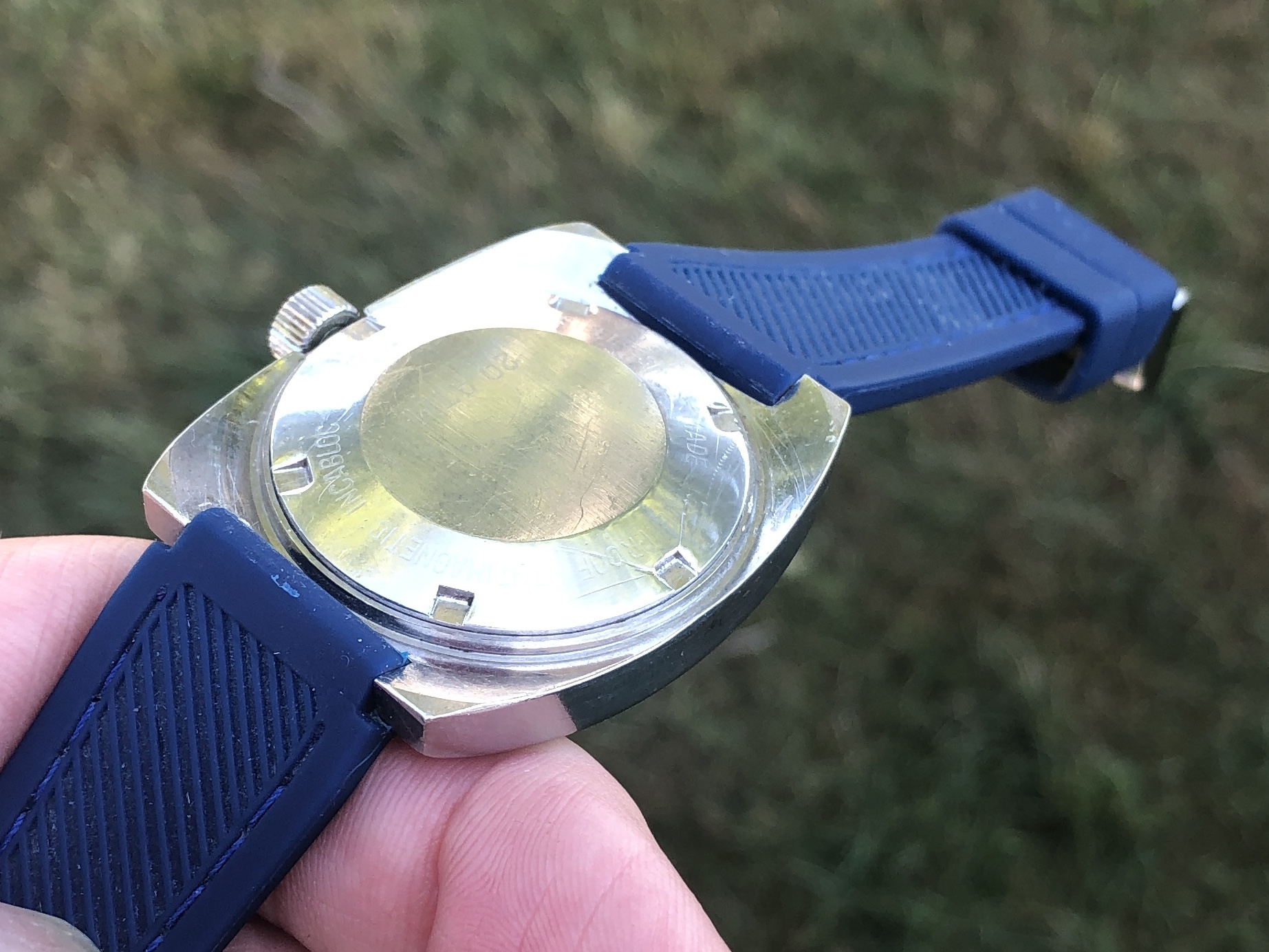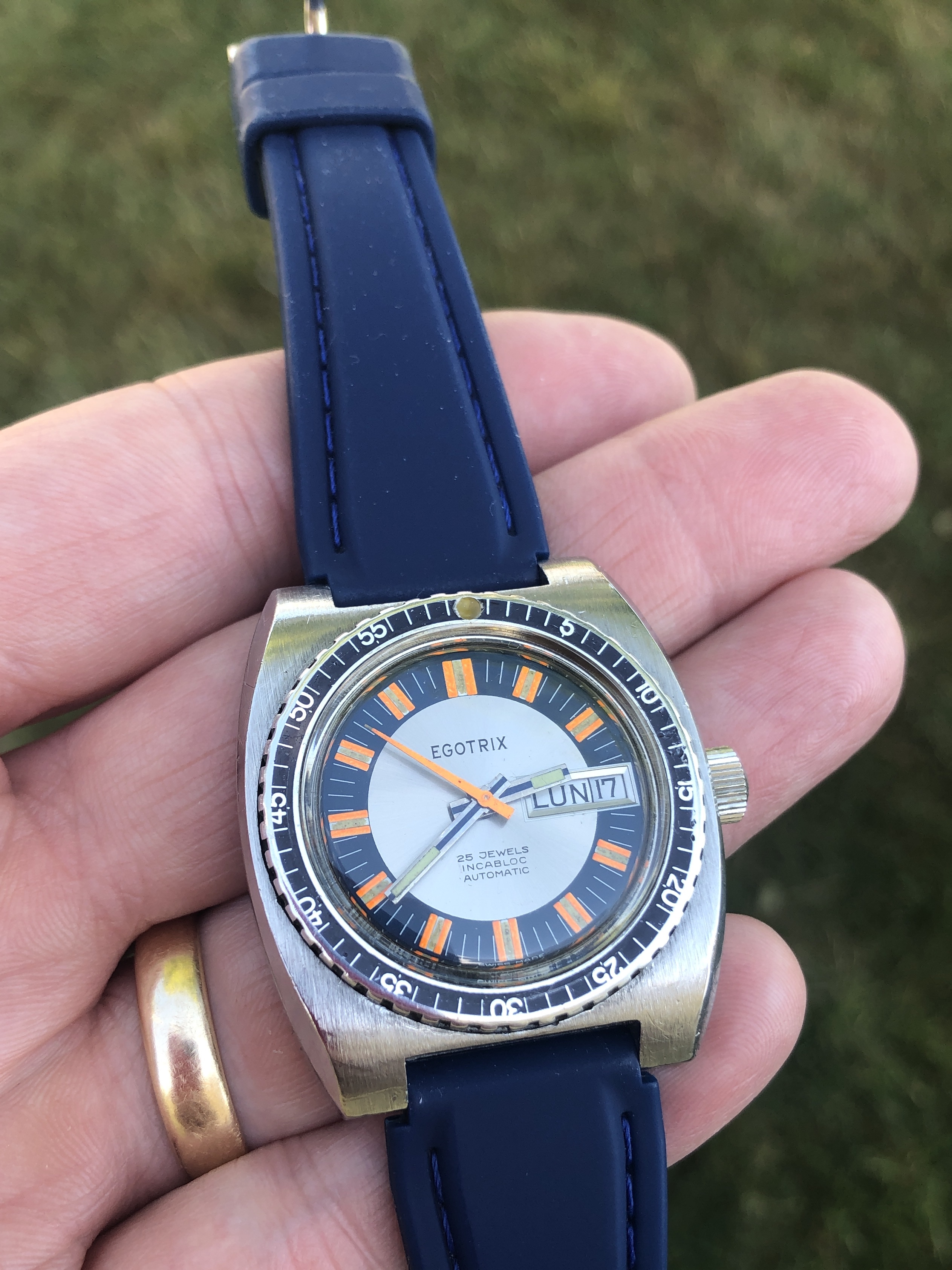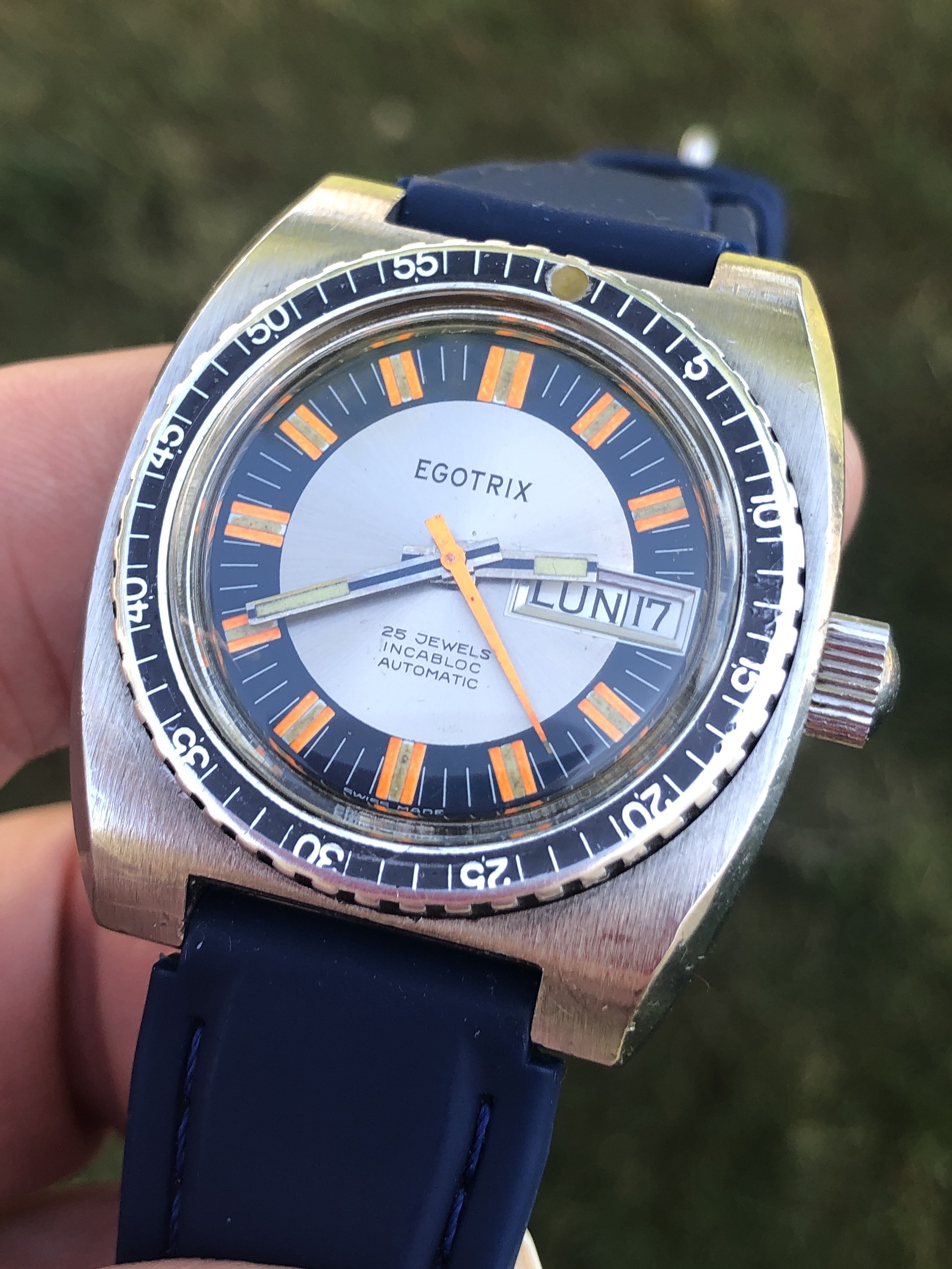 ·A nice vintage Egotrix diver from the late 60's or early 70's with a clean, colorful dial showing attractive patina on the lume. The lume plots on the dial and hands have all aged to a consistent, pleasing color and the orange seconds hand adds a bit of zip. It has been a fun piece to wear, and has added a bit of color to my spring, summer and autumn rotation, but it’s time to move it on.
