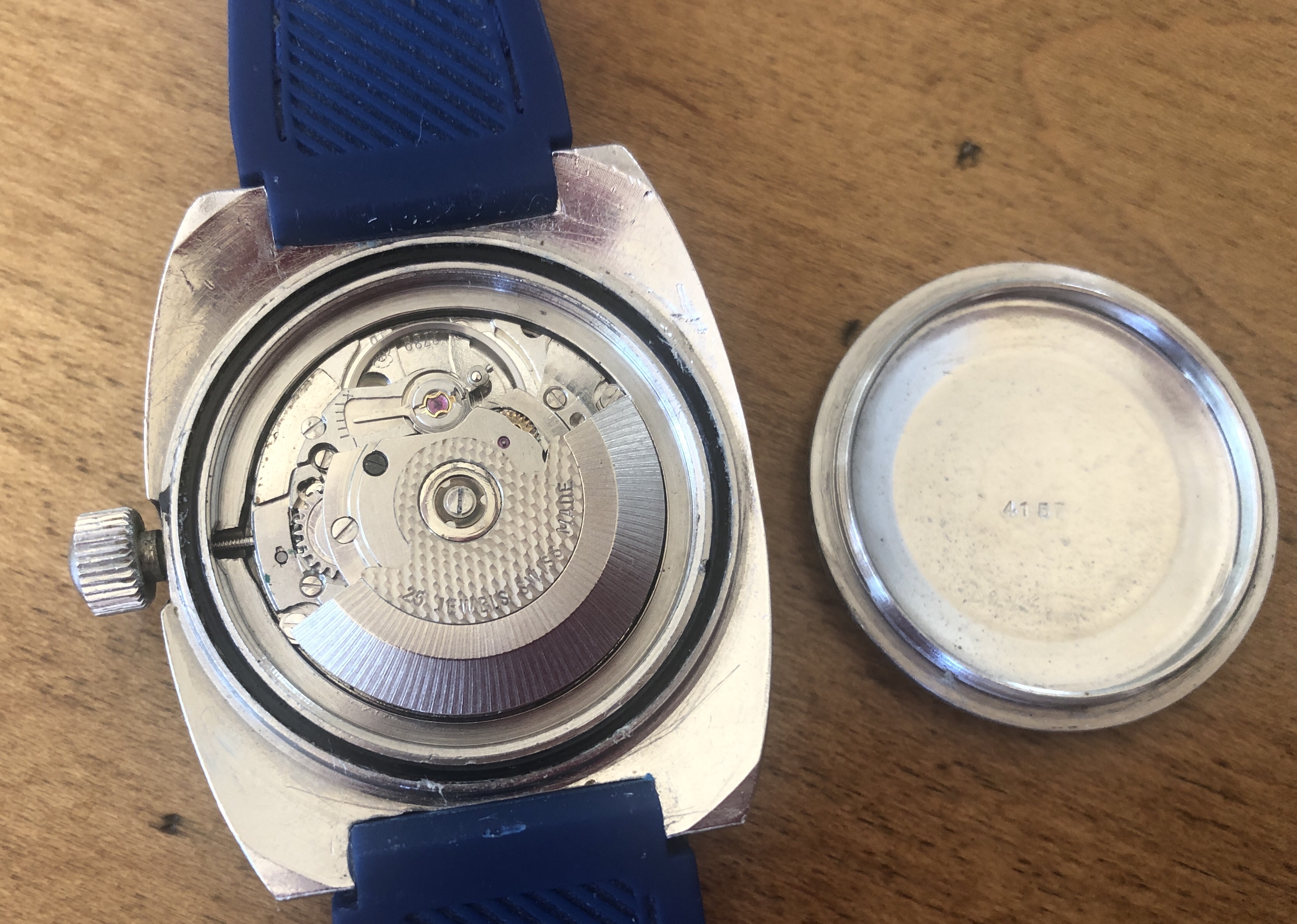 The movement is a 27 jewel ETA 2789 automatic, with its hand-winding option accessed with the crown unscrewed to first position. The quickset day and date features are adjusted by the screw-down crown pulled out to its second position. The day wheel is in Italian. Time is set by pulling the crown out to its third position. I had the watch serviced in June of 2017 while in my posession. It continues to run nicely with good timekeeping, and all functions working correctly. It has been worn in rotation since that service.