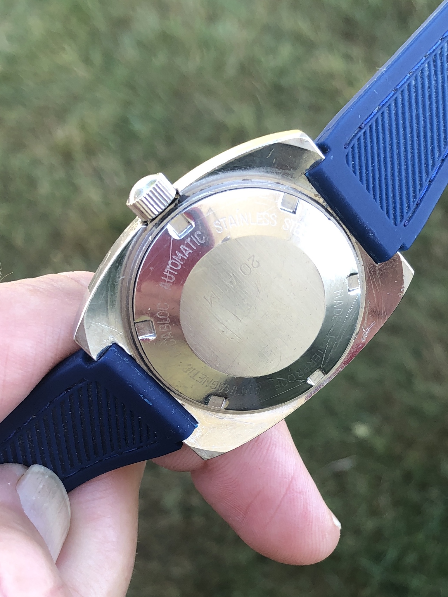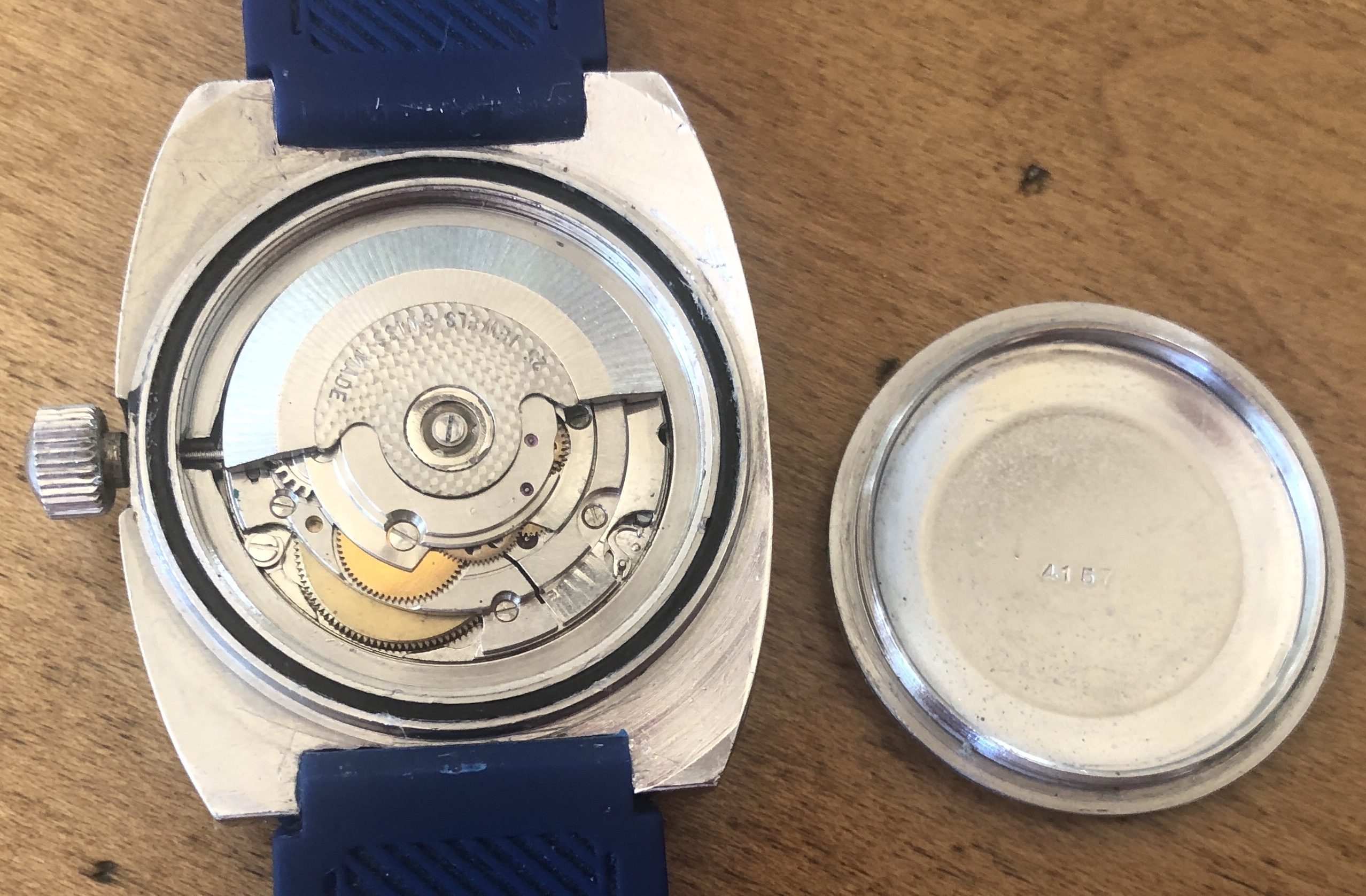 The outer edge of the case back is stamped "SWISS MADE WATERPROOF ANTIMAGNETIC INCABLOC AUTOMATIC STAINLESS STEEL" with "20 ATM" stamped in the center. The inside of the case back is stamped "4157." The crystal is clean and unmarked