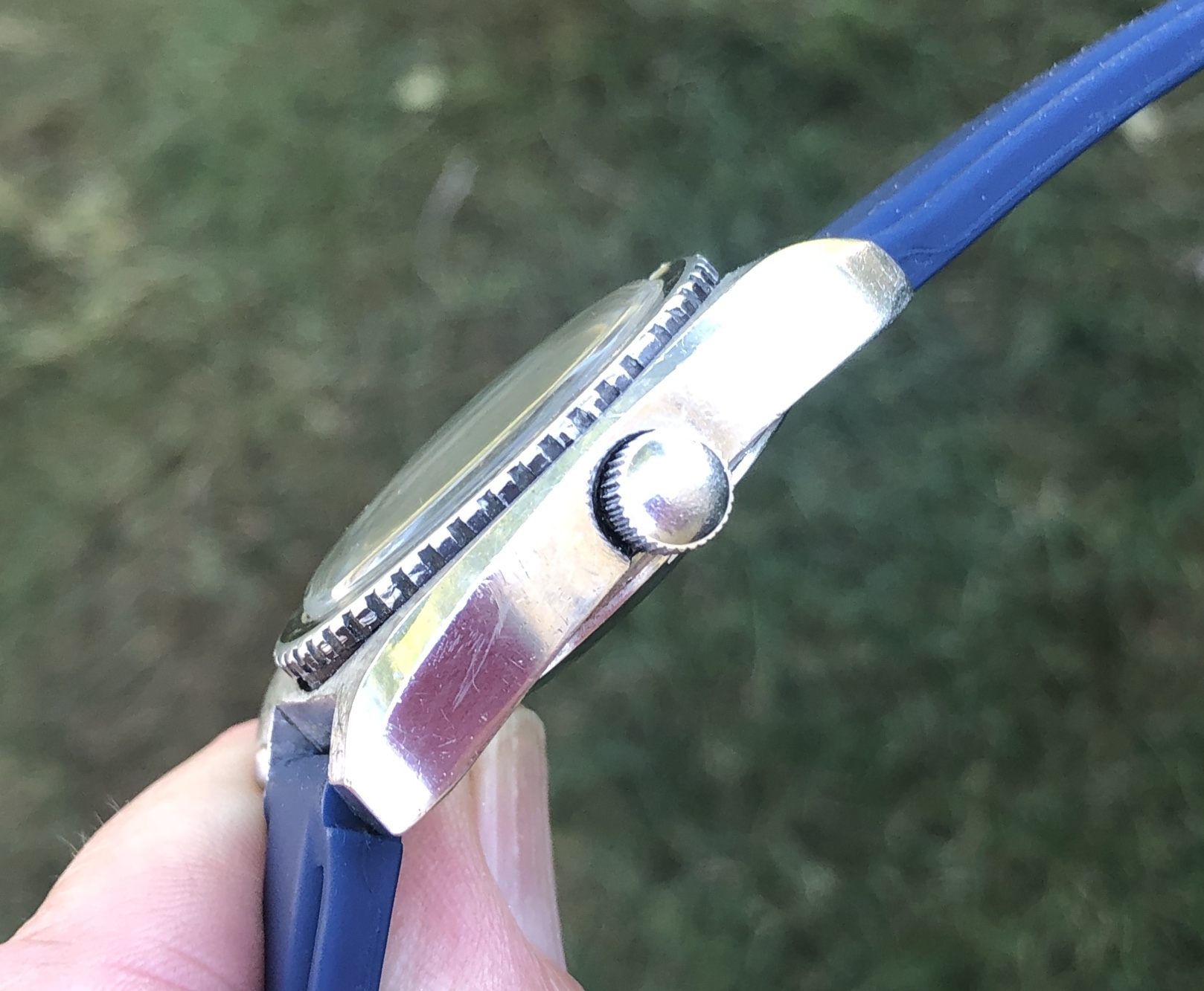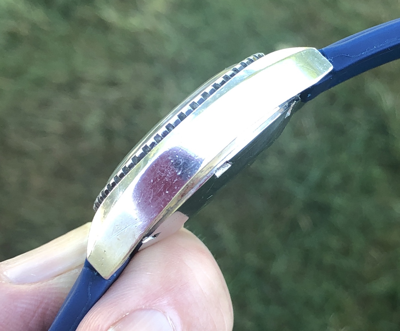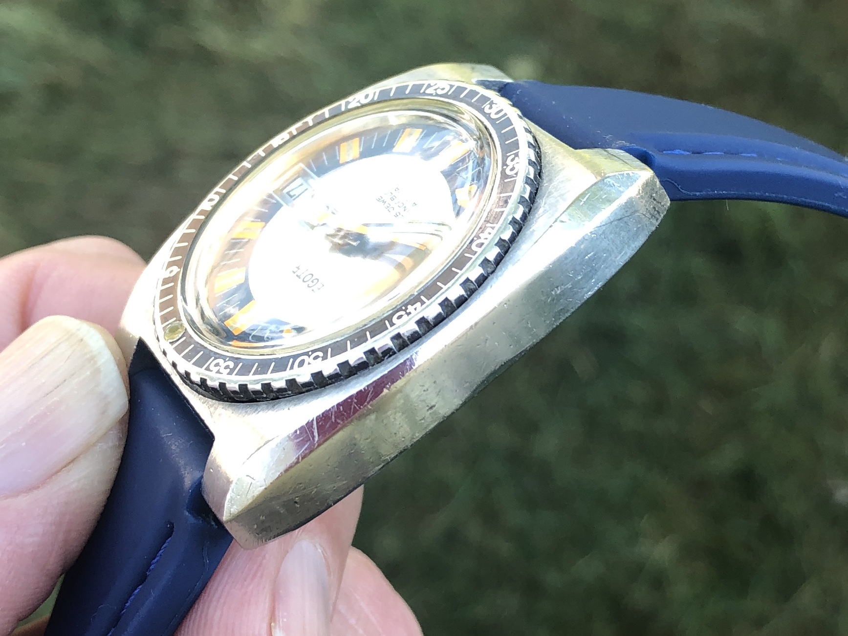The black bezel, which rotates smoothly bidirectionally, shows wear around the outer diameter. The Bezel lume pip was added by me by using a tinted waterproof glue. While it looks convincing- at least it has to several friends- it’s never going to glow. The stainless steel case is in nice condition and has a brushed satin finish on the tops of the lugs. Case edges are sharp and appear to be original.