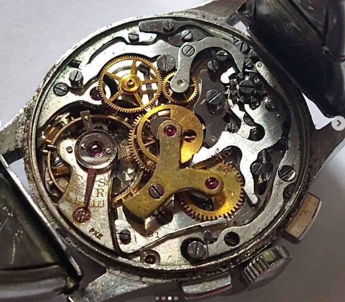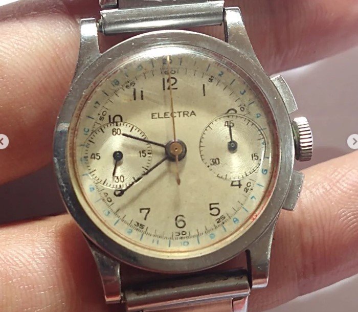 Dial is redone unfortunately. Movement is UG 281 but the bridge is not signed. Furthermore the US import code is PXE, which is unknown. The serial and ref are UG. The word Universal was removed from the caseback. Mikrolisk knows a number of Electra's