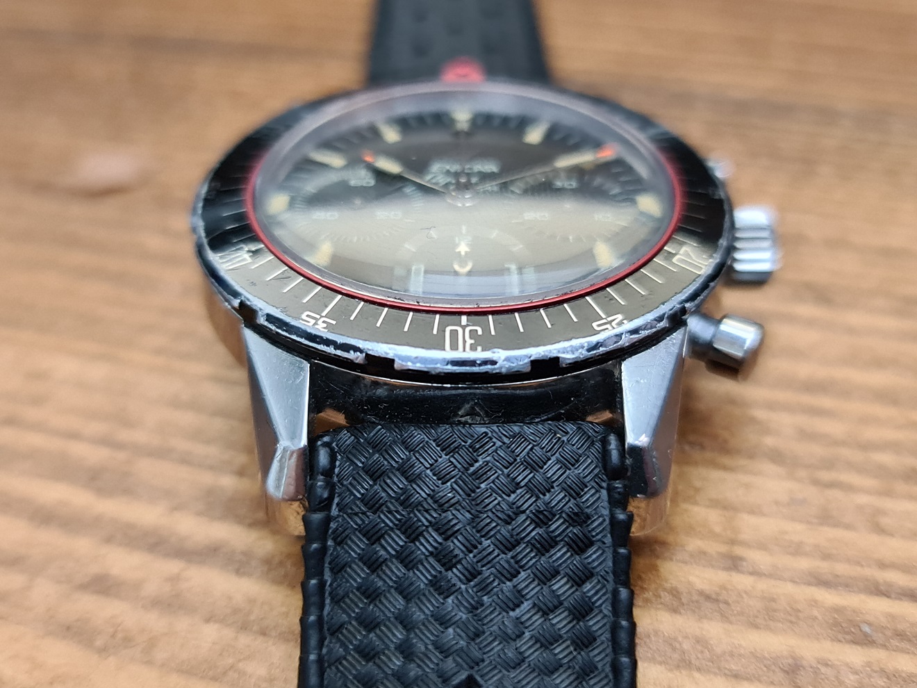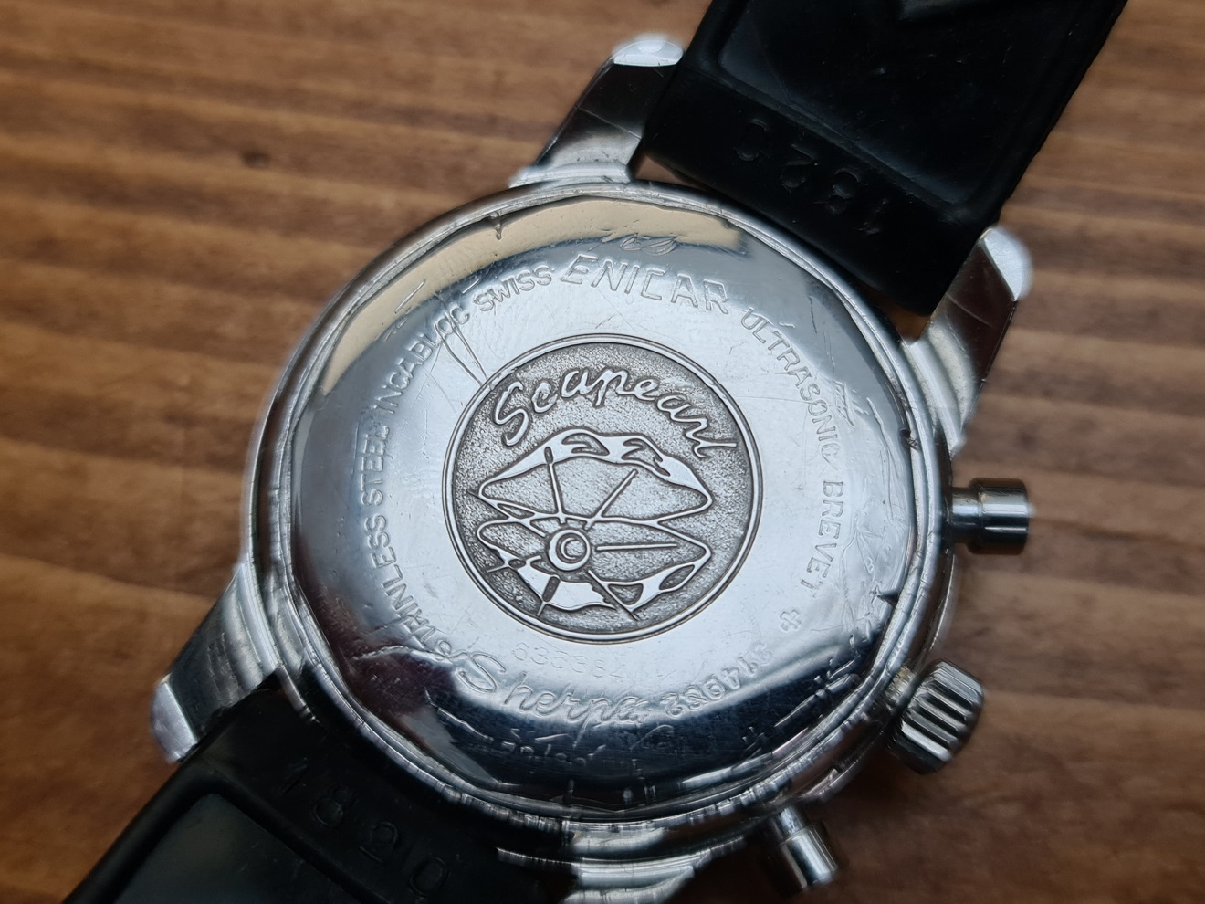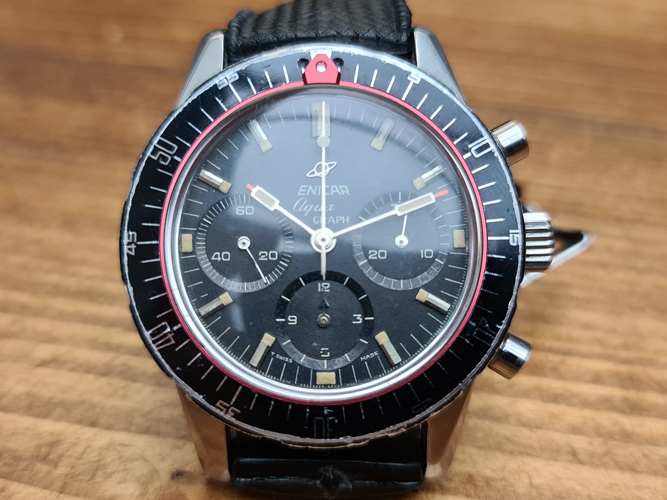 Dial and hands are in excellent condition and the case and bezel are showing signs of wear as you would expect of a vintage diver. Bezel and pointer turn nicely with no issues and independently of each other as they should. Caseback is very good and all the marking and engravings are nice and clear, including the serial (a common problem with Enicars as the engravings are quite shallow). The movement inside is the lovely Valjoux 72 with the golden finish typical of Enicar. Movement was serviced in June of this year and everything functions very nicely. Chrono runs and snaps back nicely when reset.