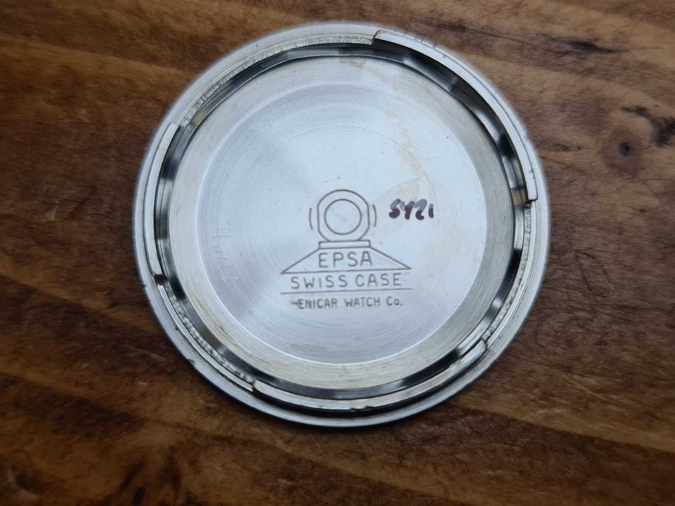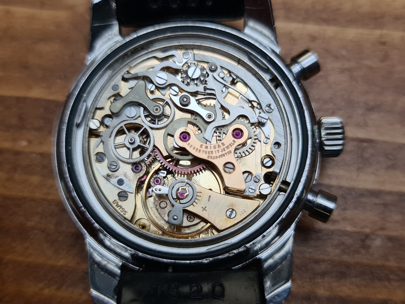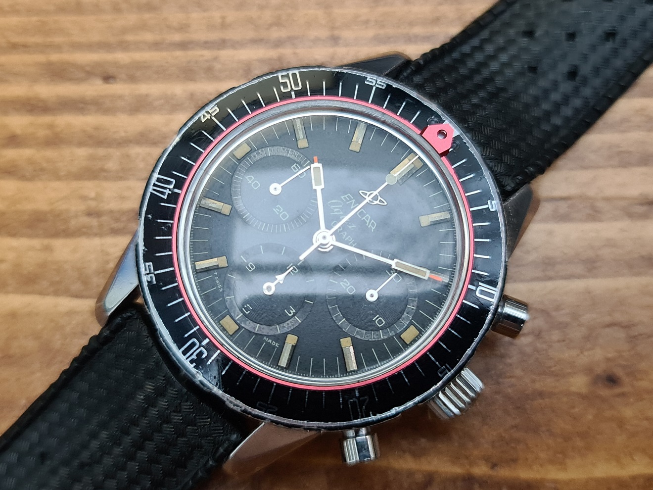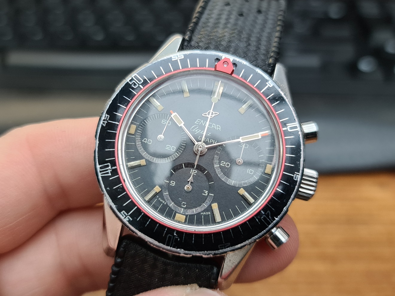 Dial and hands are in excellent condition and the case and bezel are showing signs of wear as you would expect of a vintage diver. Bezel and pointer turn nicely with no issues and independently of each other as they should. Caseback is very good and all the marking and engravings are nice and clear, including the serial (a common problem with Enicars as the engravings are quite shallow). The movement inside is the lovely Valjoux 72 with the golden finish typical of Enicar. Movement was serviced in June of this year and everything functions very nicely. Chrono runs and snaps back nicely when reset.